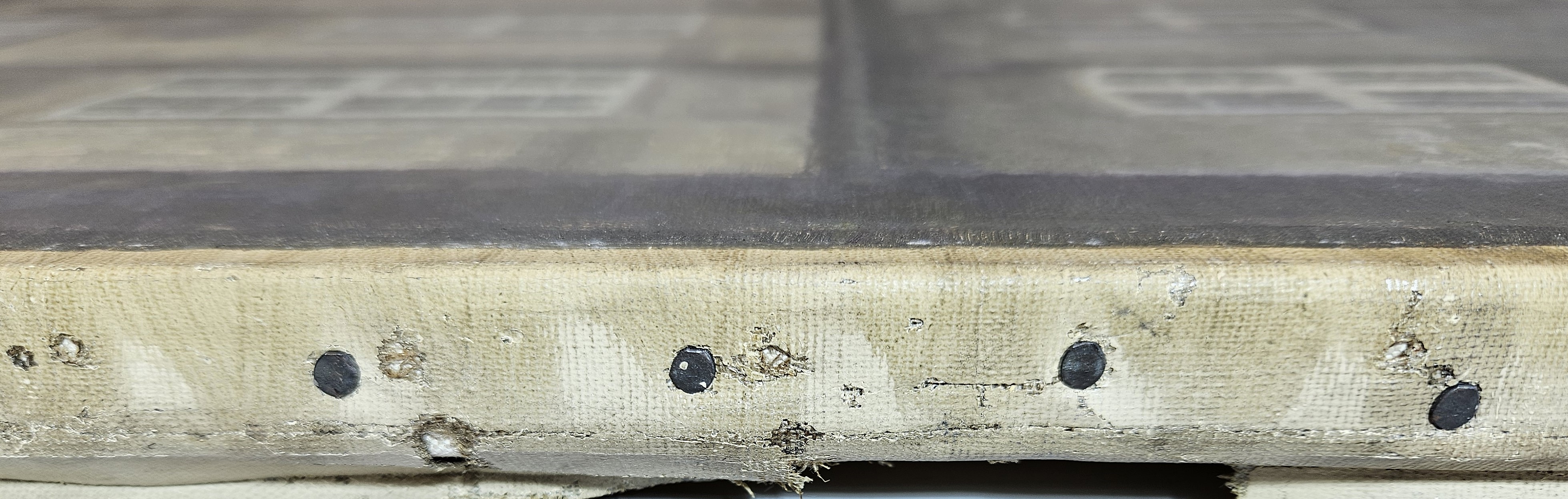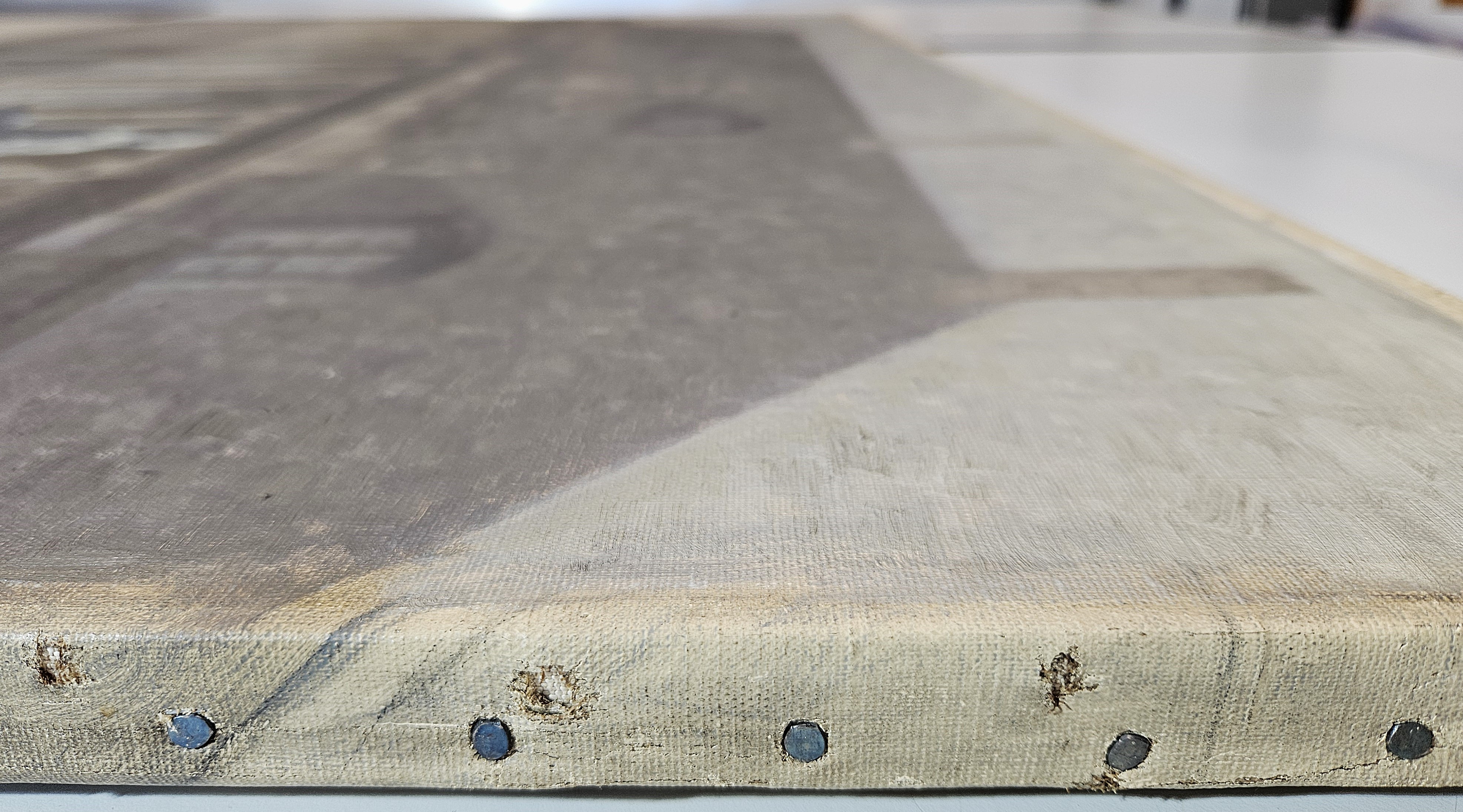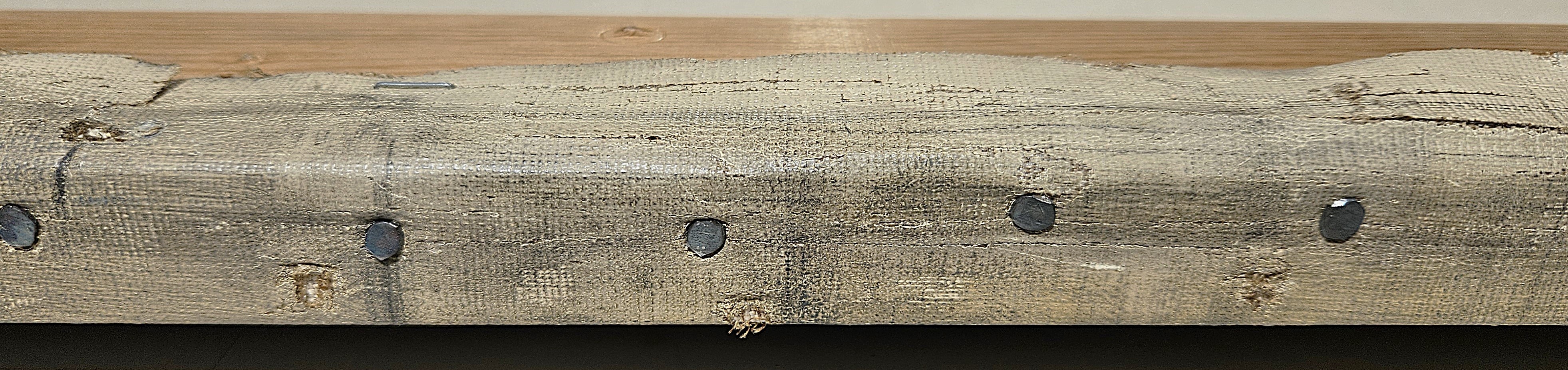 The current stretching is probably the third. Nail holes from the stretching on the original stretcher suggest that it had a thicknes of 1,5 cm. Further nail holes, set 20 -57 mm apart, are found on all four sides close to the previous folded edge.
