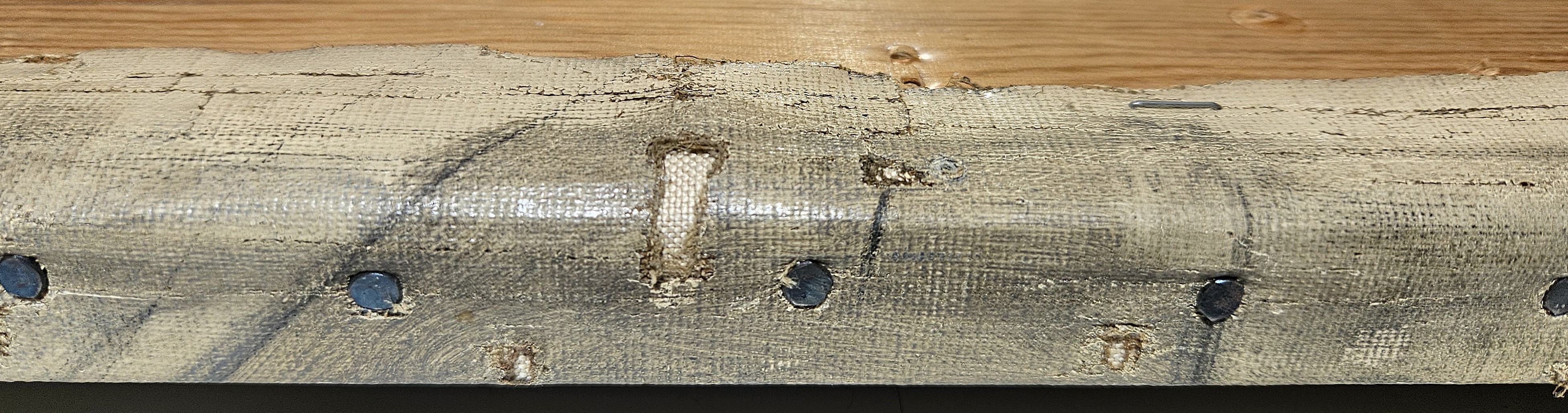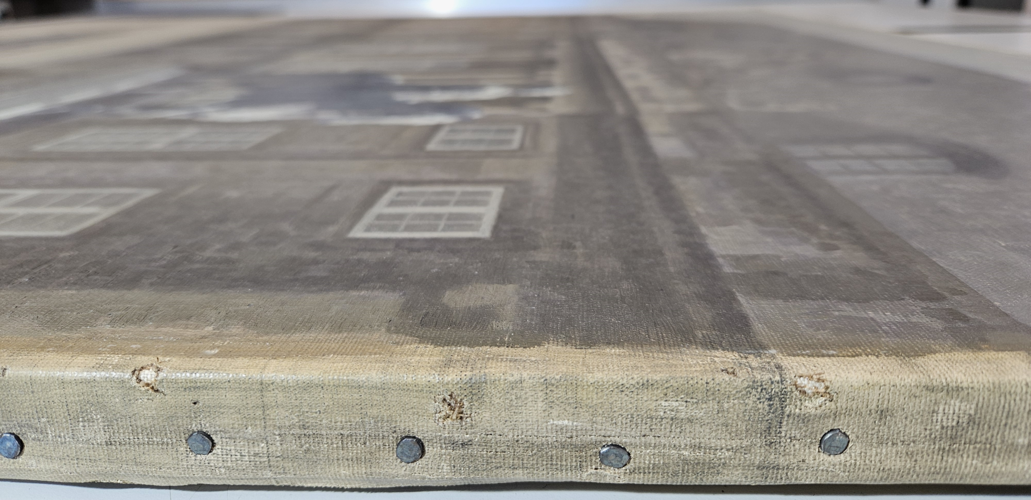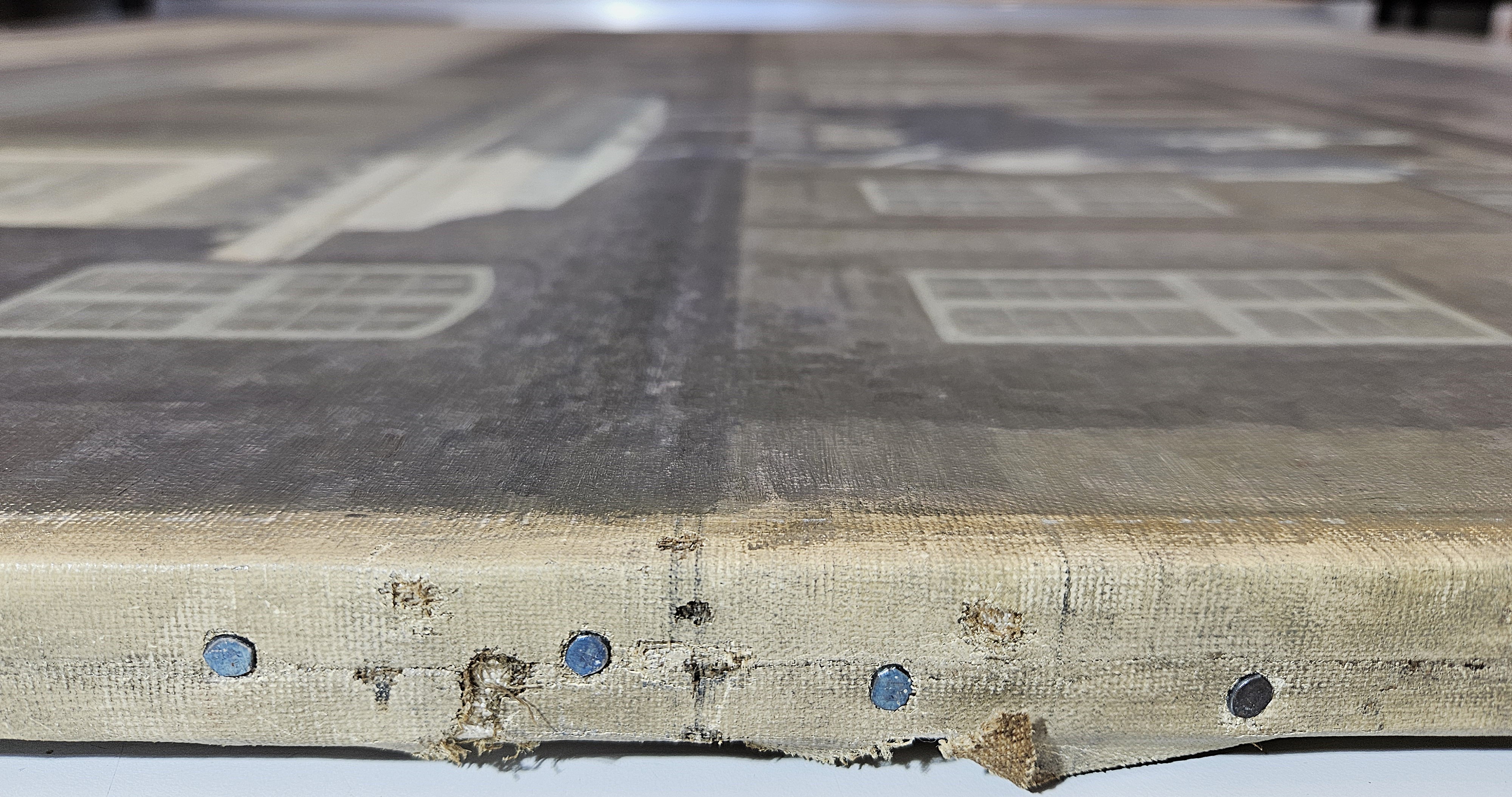 The current stretching is probably the third. Nail holes from the stretching on the original stretcher suggest that it had a thicknes of 1,5 cm. Further nail holes, set 20 -57 mm apart, are found on all four sides close to the previous folded edge.