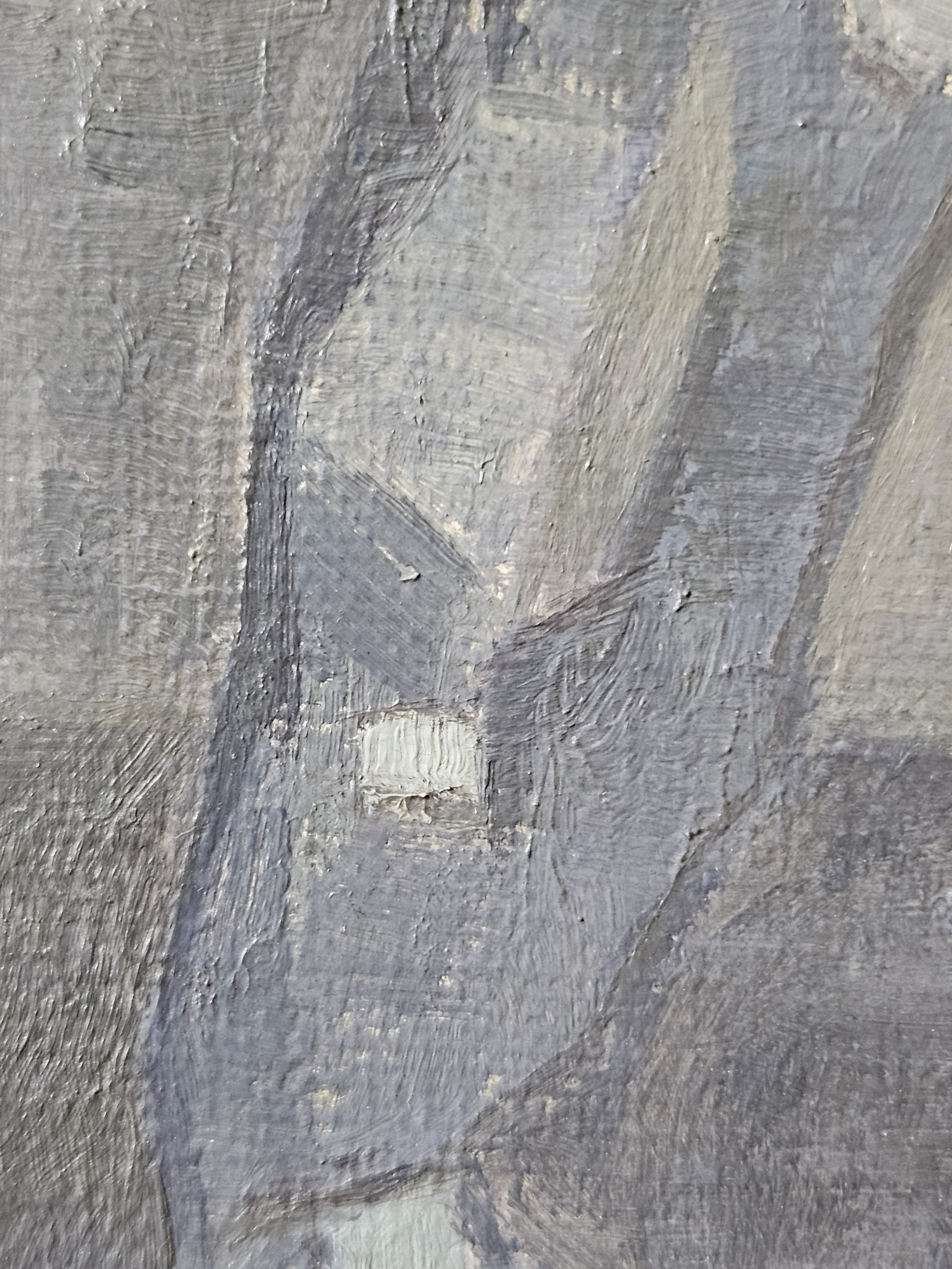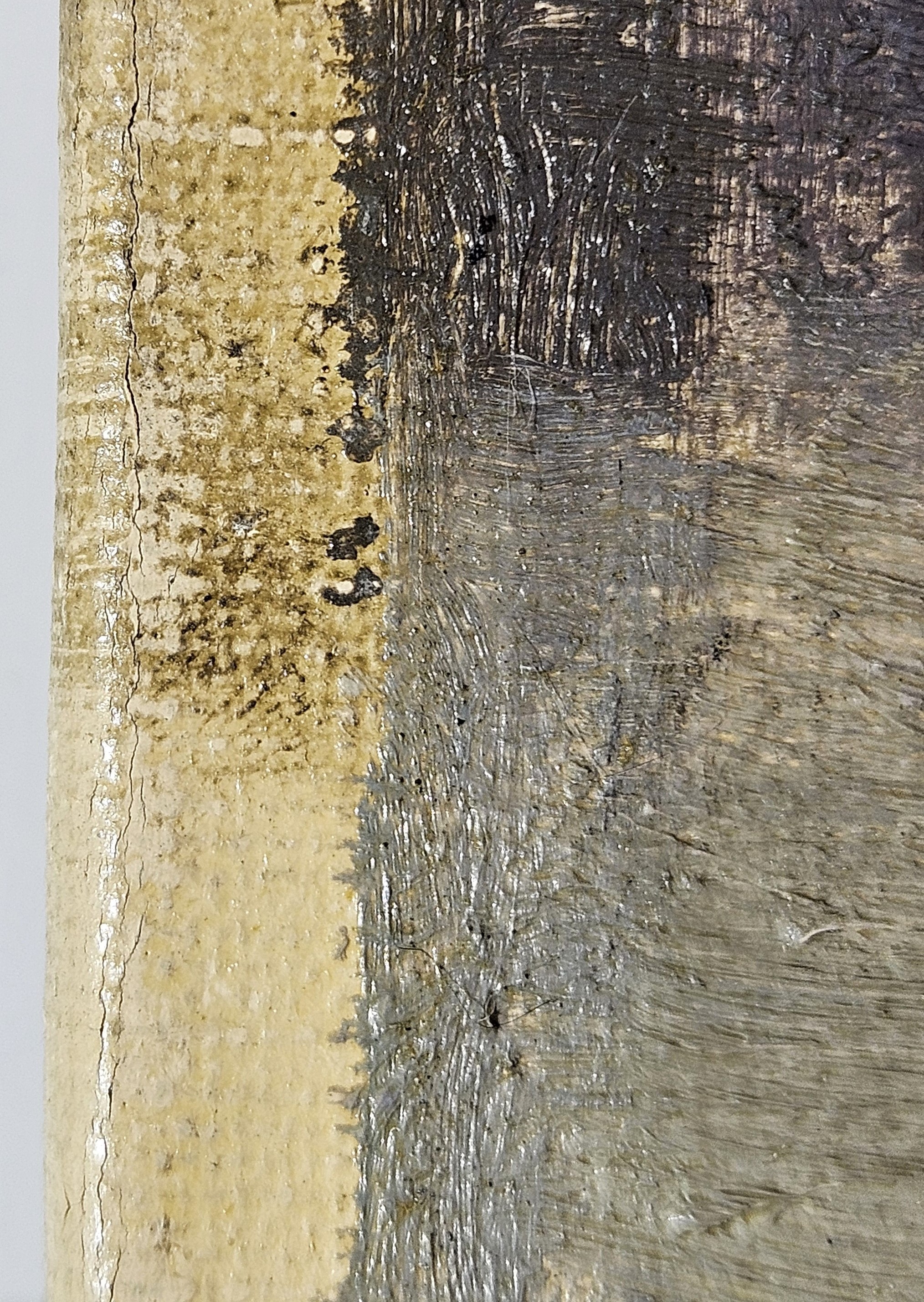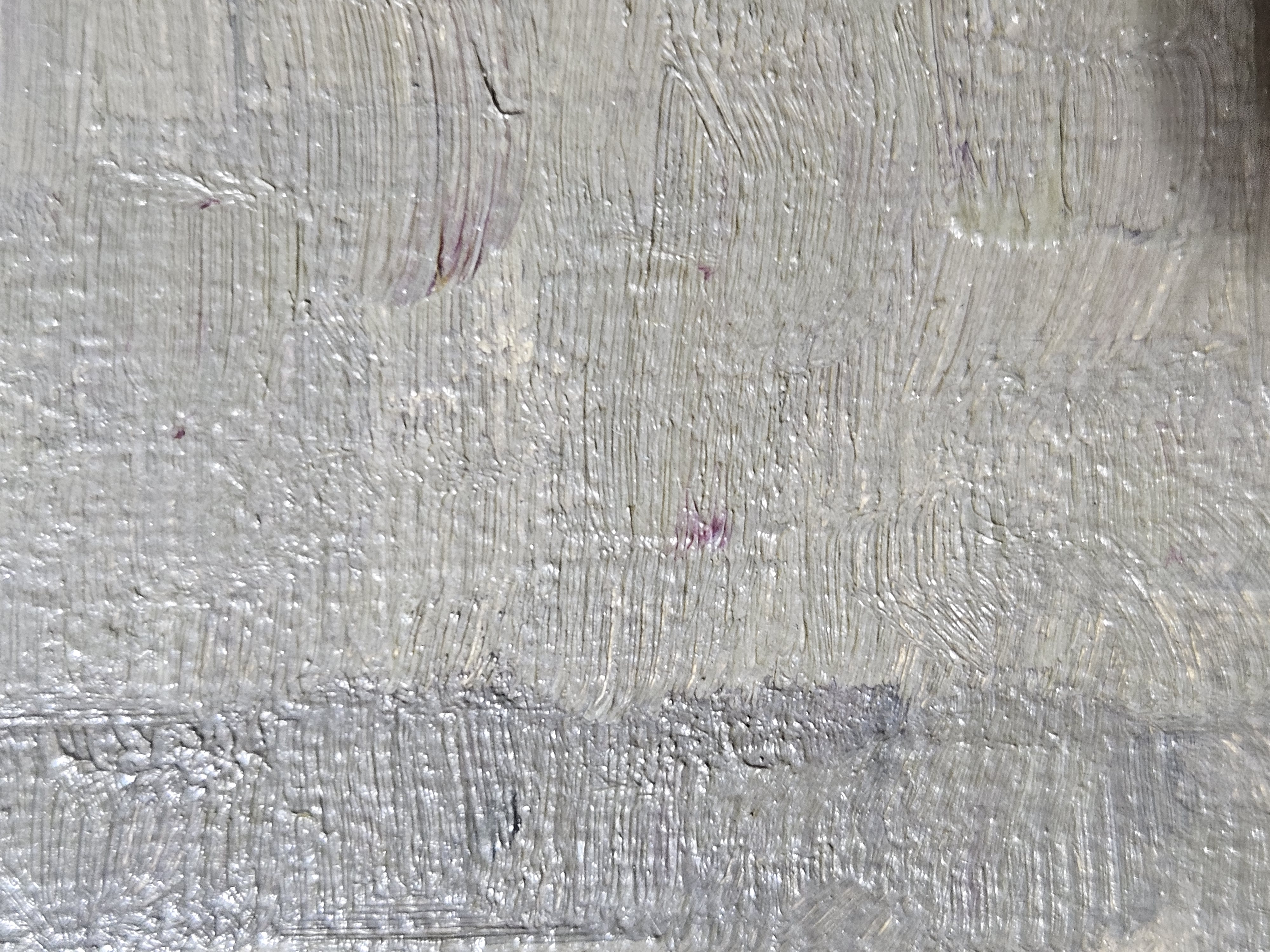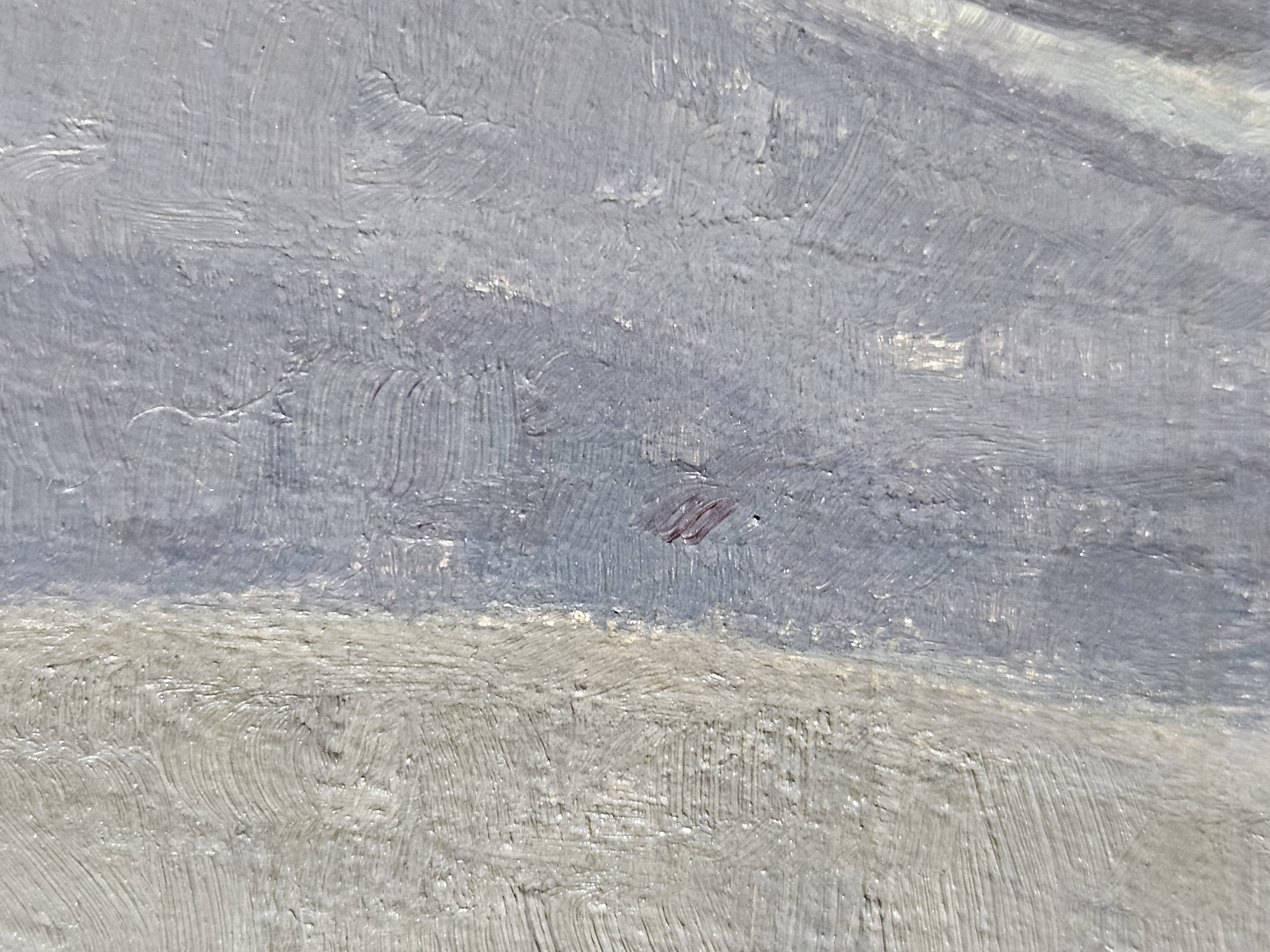 The ground layer is a preparatory layer applied directly to the support to create a smooth surface for painting. It is typically opaque and monochrome in color, providing a neutral base that influences the subsequent application of paint layers and the final appearance of the painting. The composition of the ground layer varies depending on the type of support and the historical period of the artwork. Hammershøi typically painted on white and industrially primed canvasses.