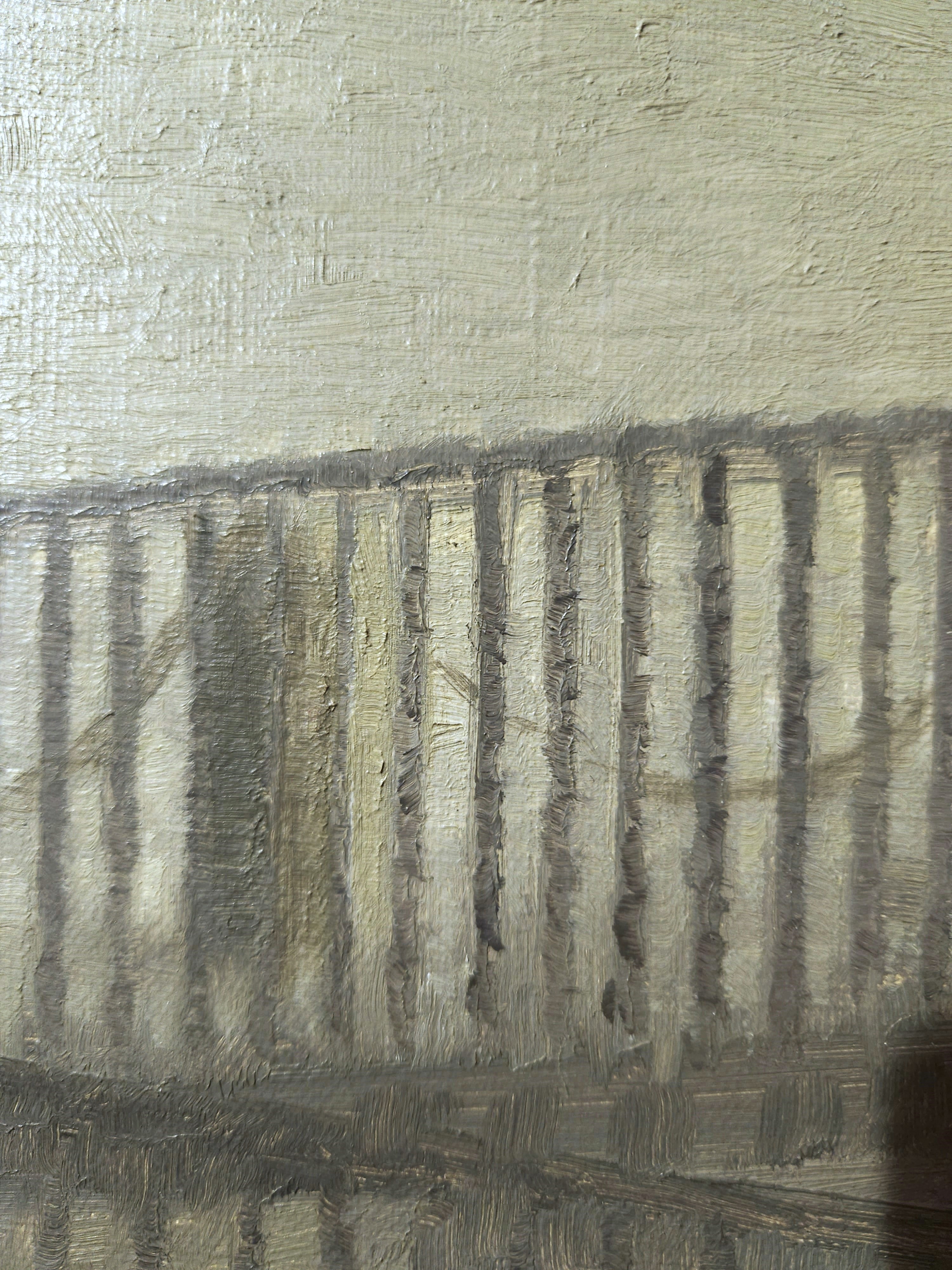 An initial application of a thinned, uneven medium grey paint in the building and part of the foreground was followed by more opaque paint applied in short, scattered brush strokes, leaving the initial paint layer and the ground exposed in many places. The ground is visible particularly in areas of the foreground. The pale grey sky was painted more densely and wet-in-wet, with blended brushstrokes. Details such as the window frames and bars were executed in white paint. The bars of the railing around the statue were painted before the interstices between them were filled in with short horizontal brush strokes.