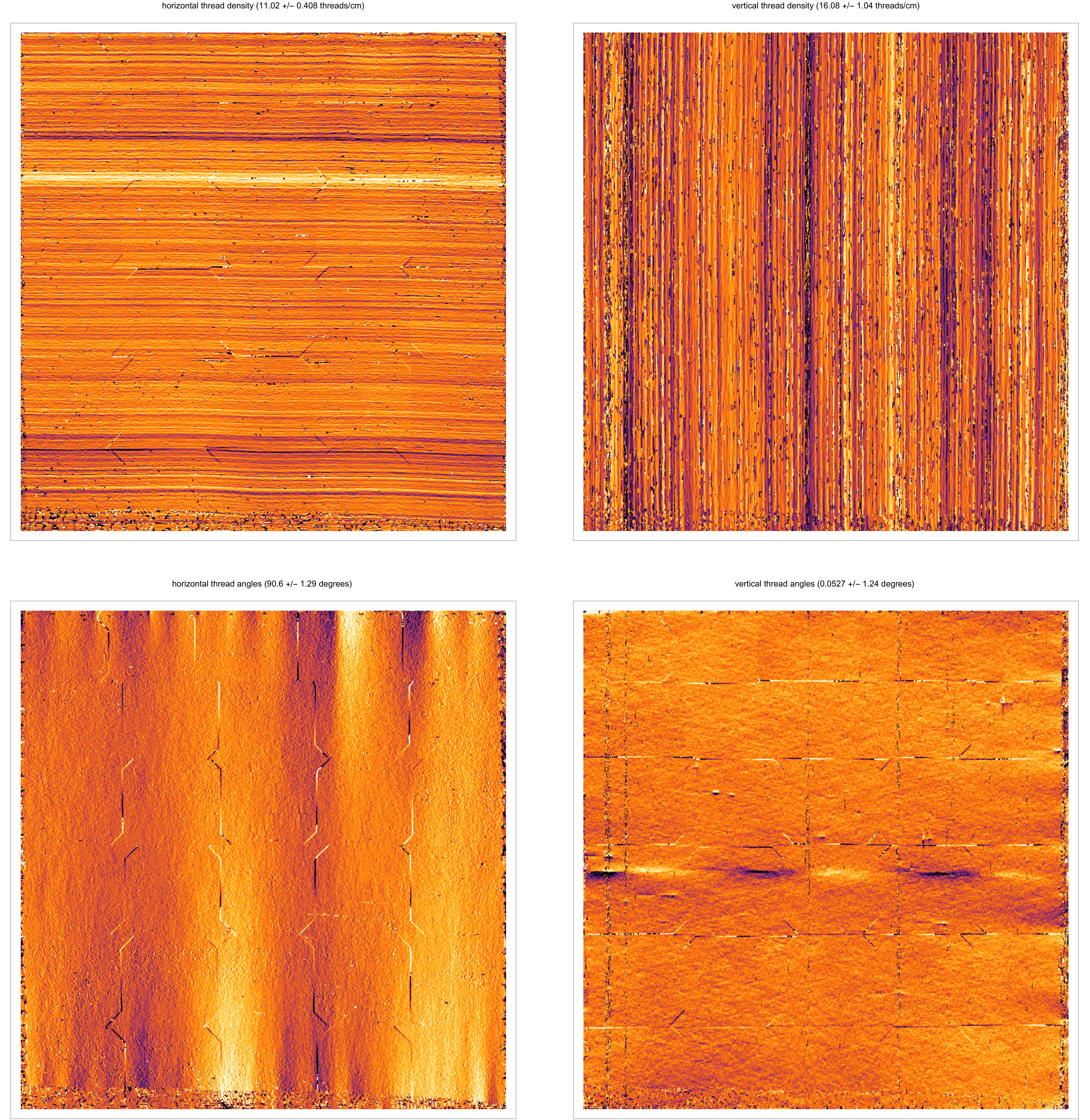 Weave maps are detailed visualisations of the thread patterns in a canvas, created by applying thread counting on high-resolution x-radiographs. These are used for analysing the structure of the canvas and to compare canvases used in different paintings. A comparison between weave maps can sometimes determine if two or more pieces of canvas derive from the same batch and thereby shed light on the place and period in which a painting has been created.