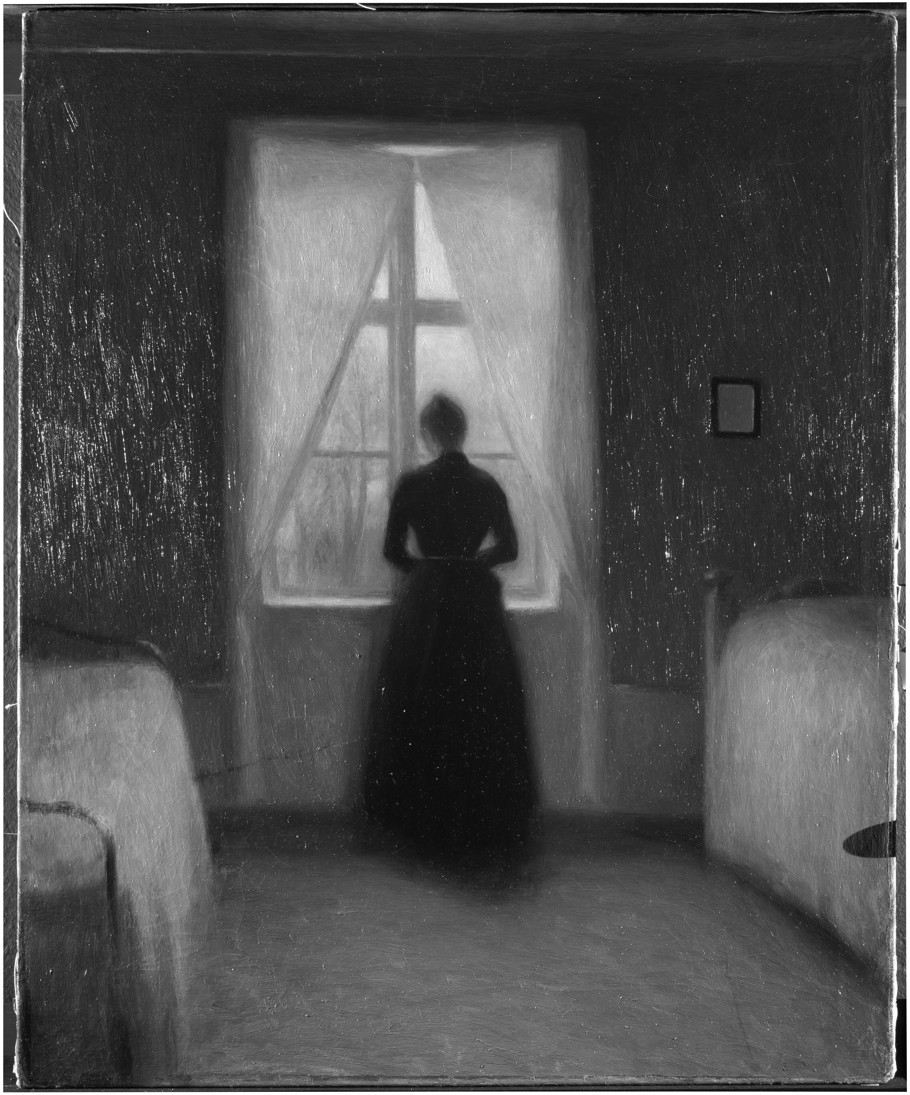 SOVEKAMMER - I Forgrunden tilvenstre, og afskaaret af Rammen, en Jernseng med hvidt Tæppe. I Baggrunden et Vindu med hvide tilbageheftede Gardiner, hvorigennem Udsigt til en Have med Træer under en graa Himmel. Ved Vinduet staar en ung sortklædt Kvinde med Ryggen mod Beskueren og ser ud i Haven. Paa Væggen tilhøjre for Vinduet et lille firkantet Spejl.