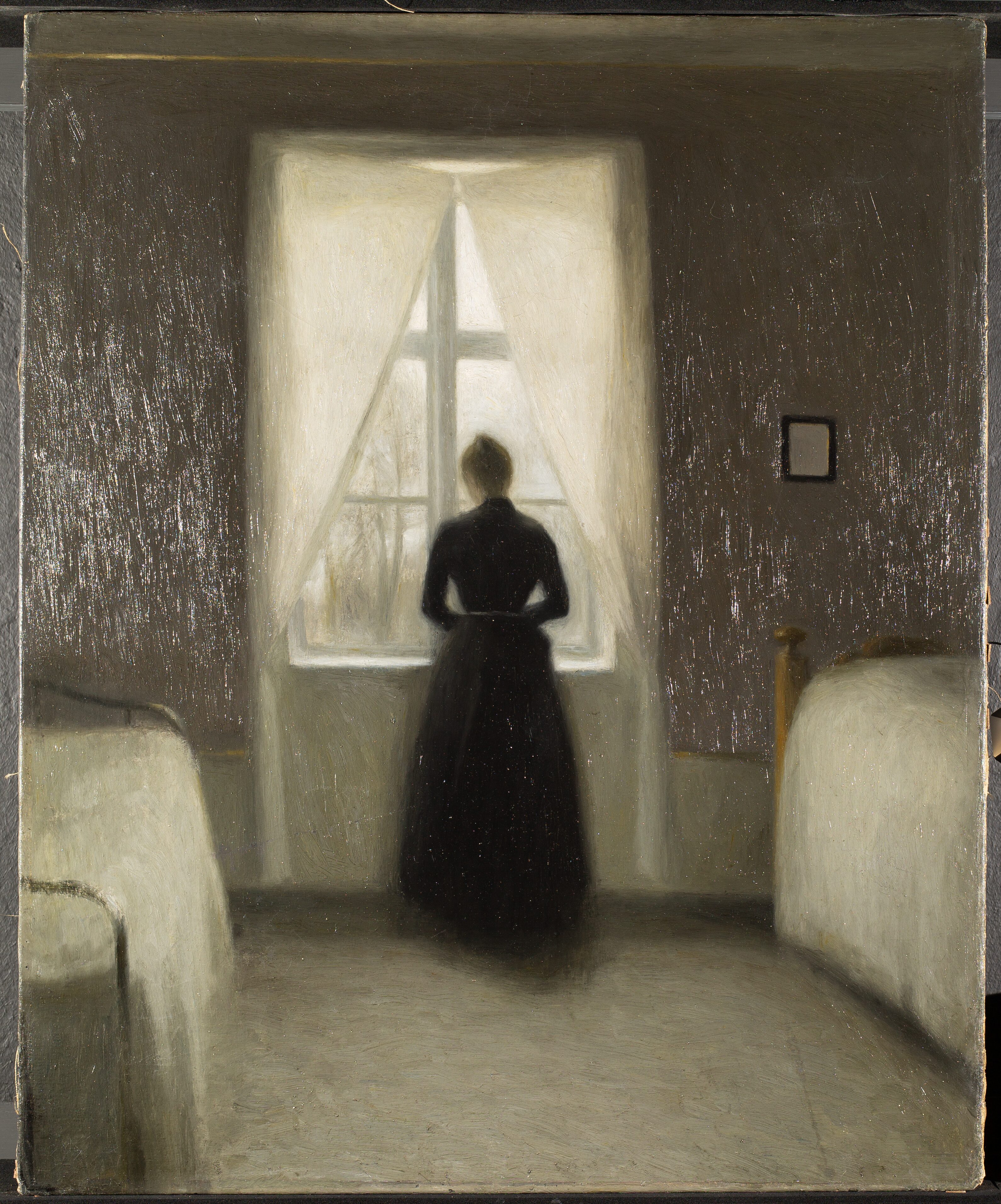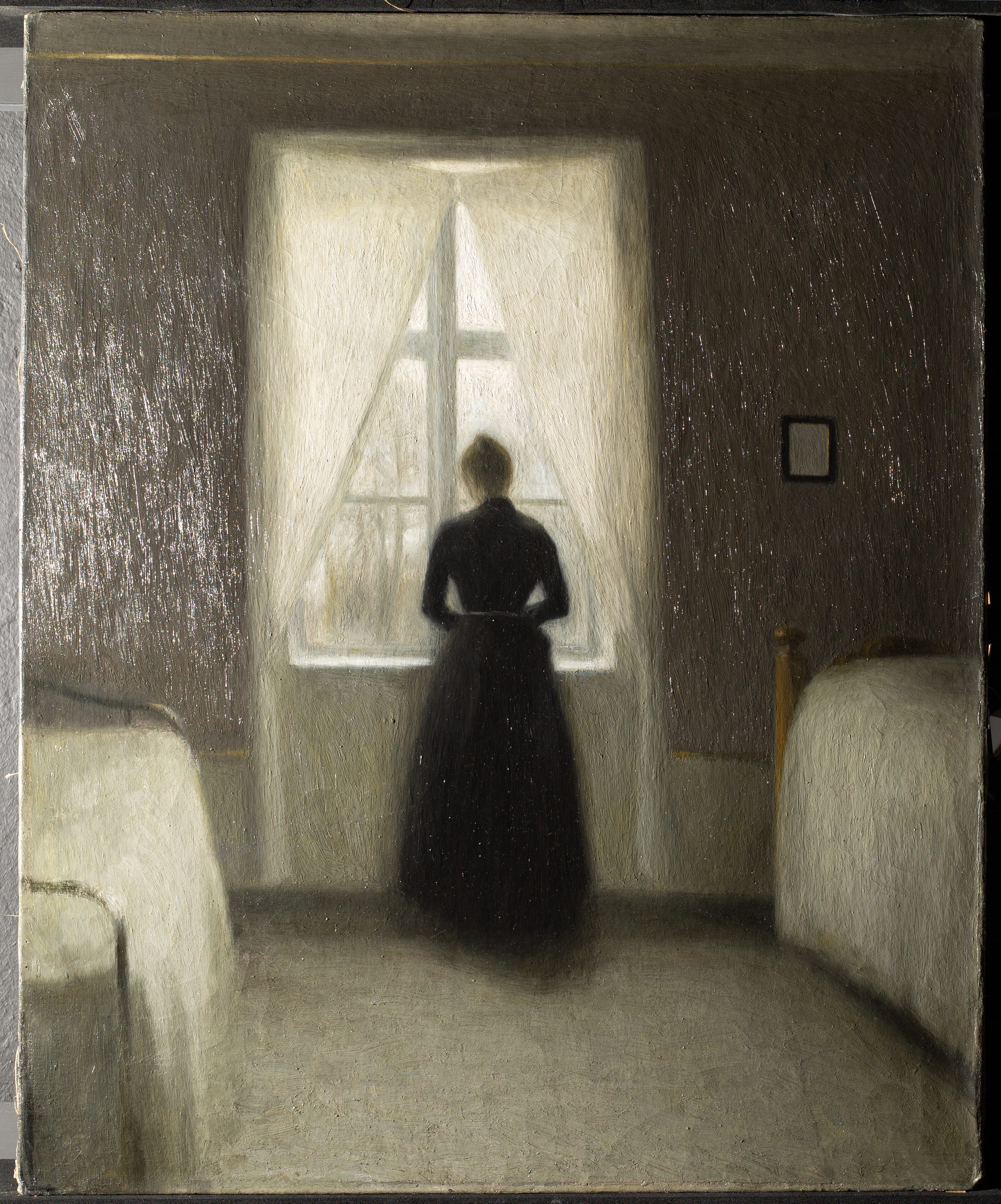 Paint layers are applied over the ground layer and are composed of pigments or colorants mixed with a binding medium. Throughout history, artists have used various binders. In the Middle Ages, egg yolk was commonly used in tempera painting for altar pieces, while during the Renaissance, oil became the preferred medium. In modern times, synthetic binders such as those found in acrylic paints are also widely used. In Hammershøi’s time, artists painted mainly with oil paint. The paint layer forms the visible image of the artwork and is often built up in multiple layers to create effects of color, texture, depth, and transparency.