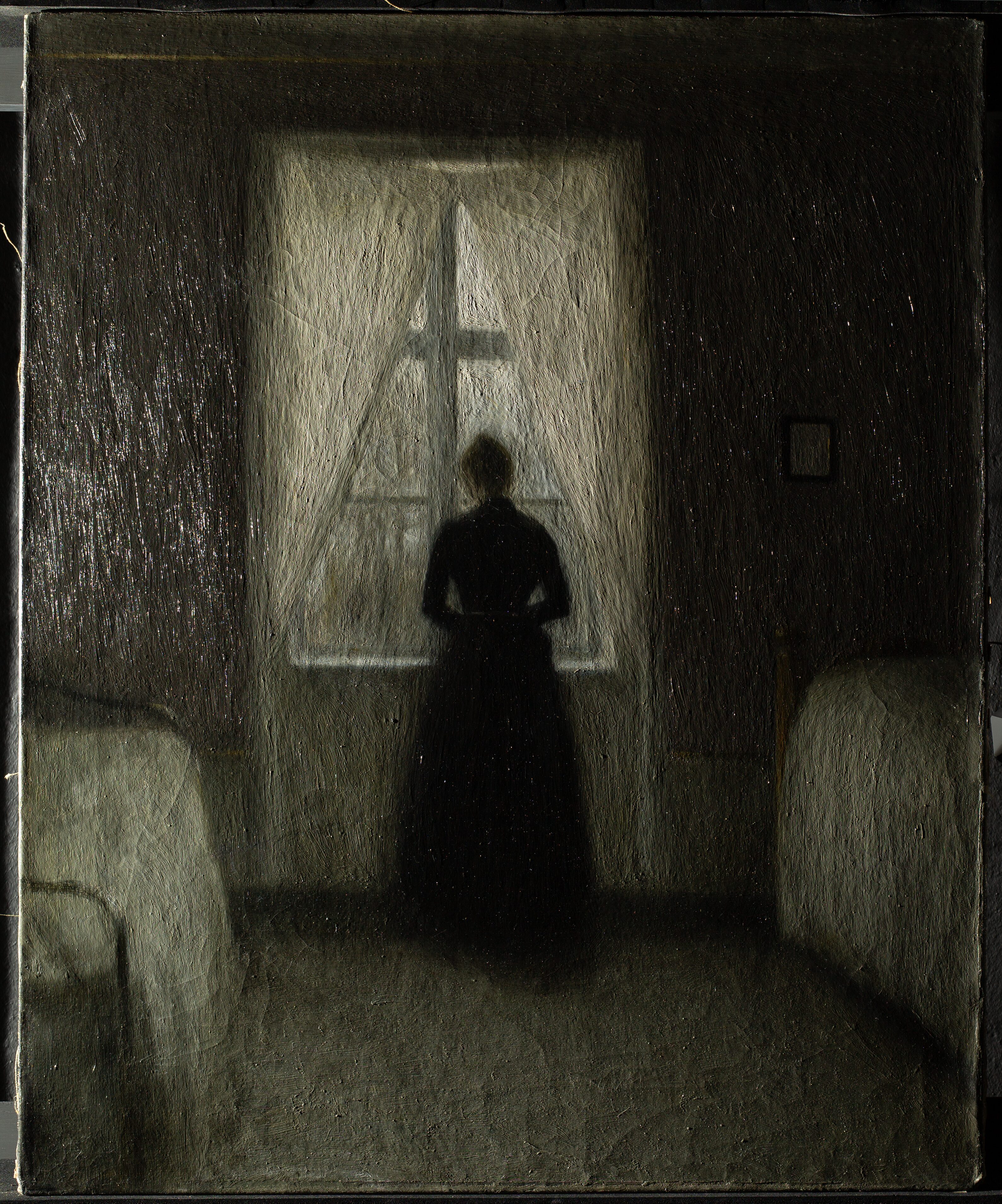 A varnish is sometimes applied as a final transparent layer over the dried paint layer to protect the artwork from dust, dirt, and mechanical damage. In addition to providing protection, varnish saturates the colours and evens out the surface gloss. Over time, this layer may yellow, or degrade. Until the 20th century, it was common practice to varnish oil paintings. In Hammershøi’s time, however, oil paintings were not always varnished, and we know that Hammershøi sometimes deliberately chose to leave his works unvarnished.