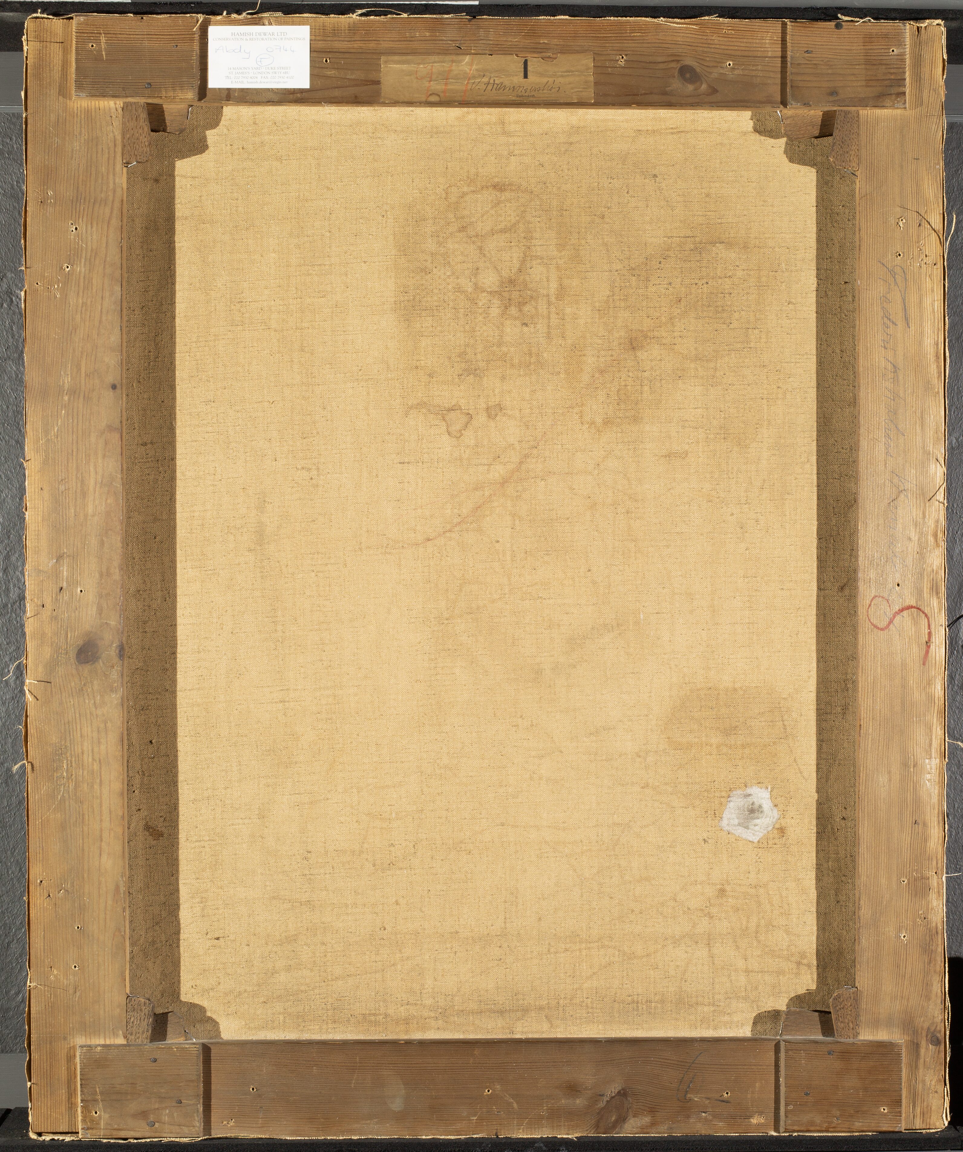 At the left-hand side of the top bar, in print and handwriting, a conservation studio label. At the centre of the top bar, a label with Hammershøi’s signature and the number ‘911’ in red crayon. On the right hand bar as seen from the reverse, in pencil: ‘Frederiksholms Kanal 24’ and, in red crayon an S-shaped figure. At the right-hand side of the bottom bar, in blue crayon: ‘6’.