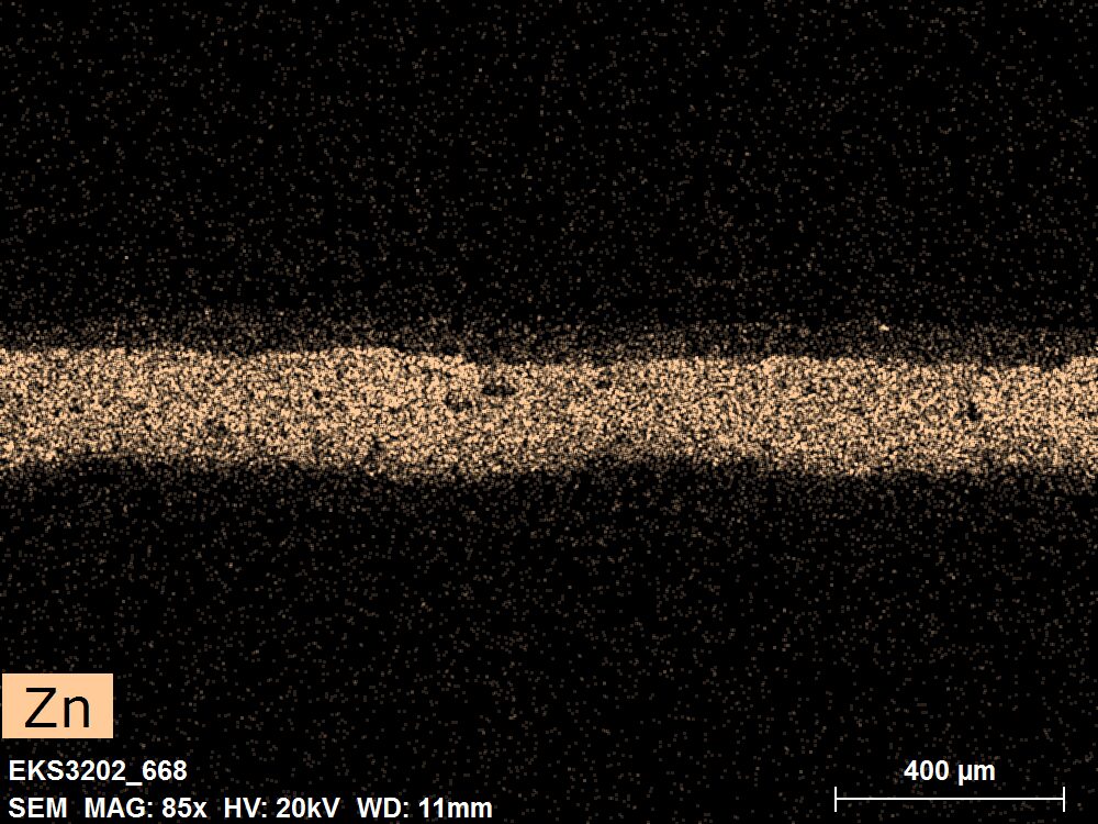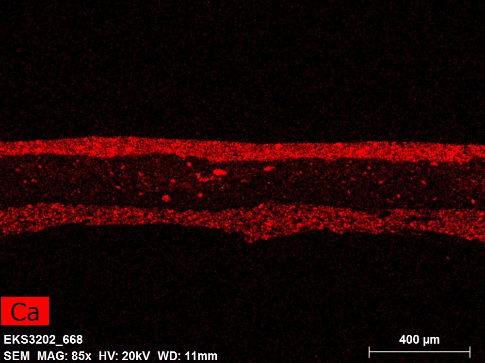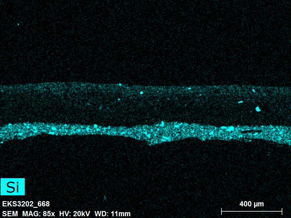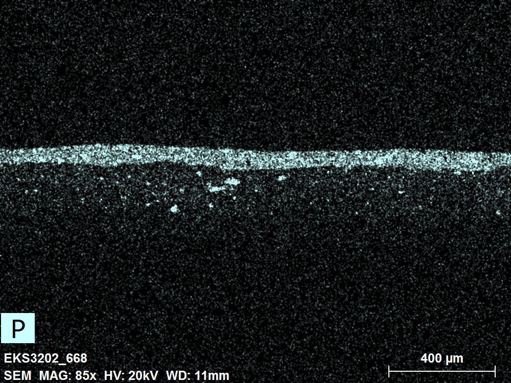 SEM-EDXS is a technique that provides highly detailed images at the microscopic level while simultaneously identifying the elemental composition of a sample. It is particularly valuable for studying the stratigraphy of paint cross sections at very fine scales, for the chemical characterisation of pigments, fillers and degradation products, and for detecting trace elements that may indicate very specific materials. Below, the elements listed in parentheses refer to minor elements whose relative abundance is below 10% of the total signal. The F1 map below represents the Pb M line. Read more under SEM-EDXS in the glossary.
