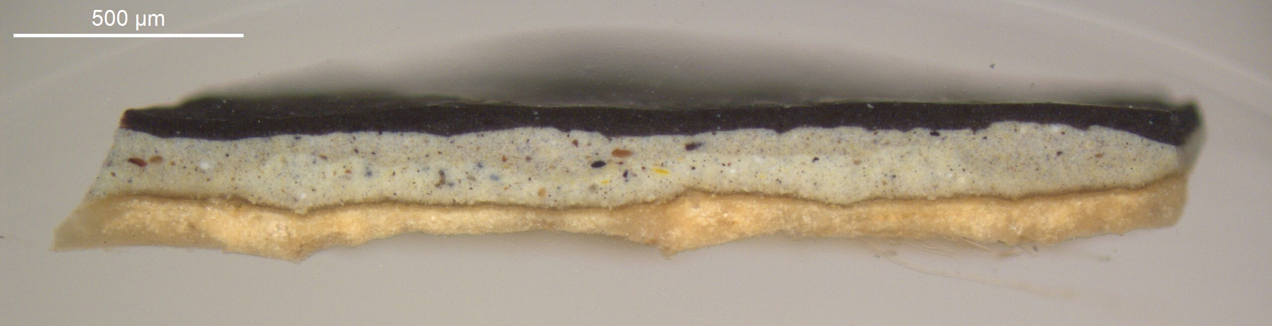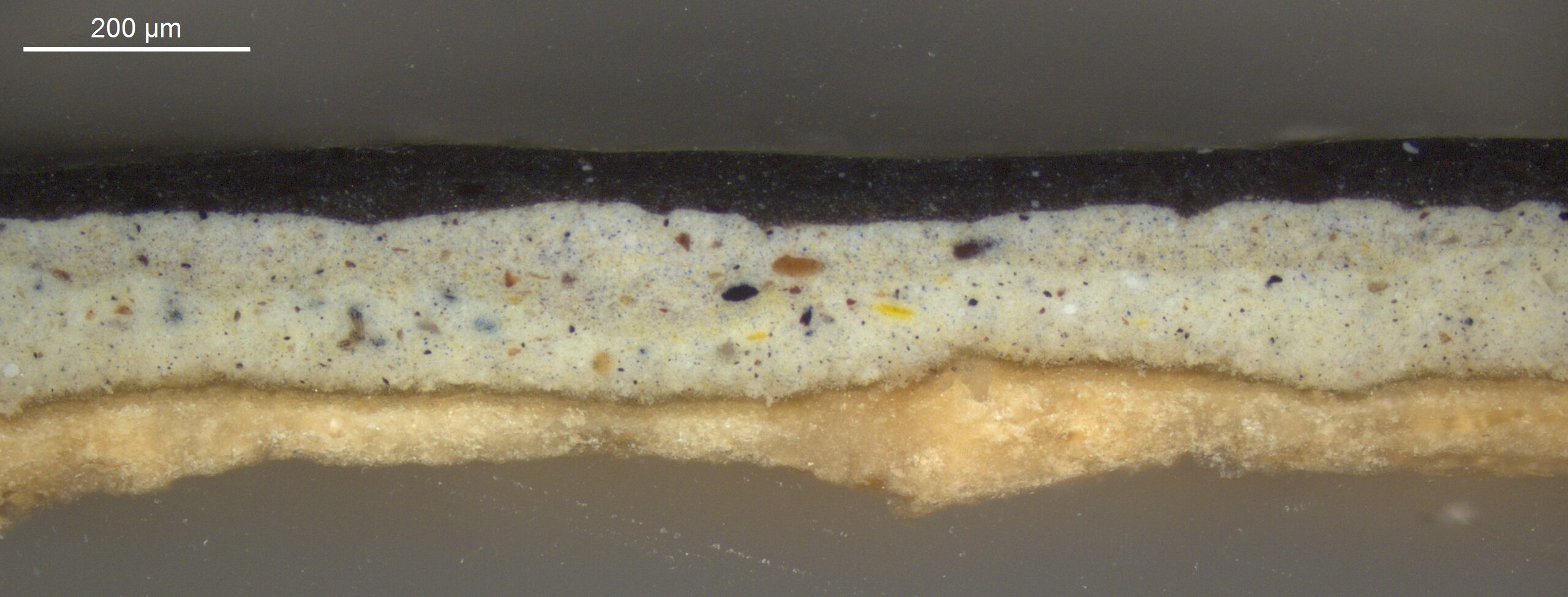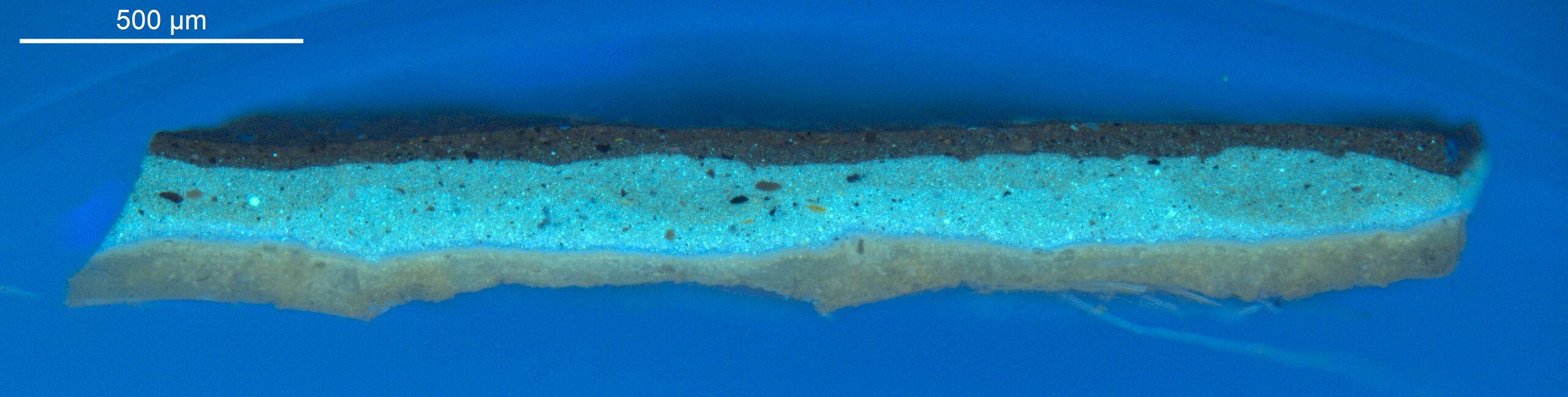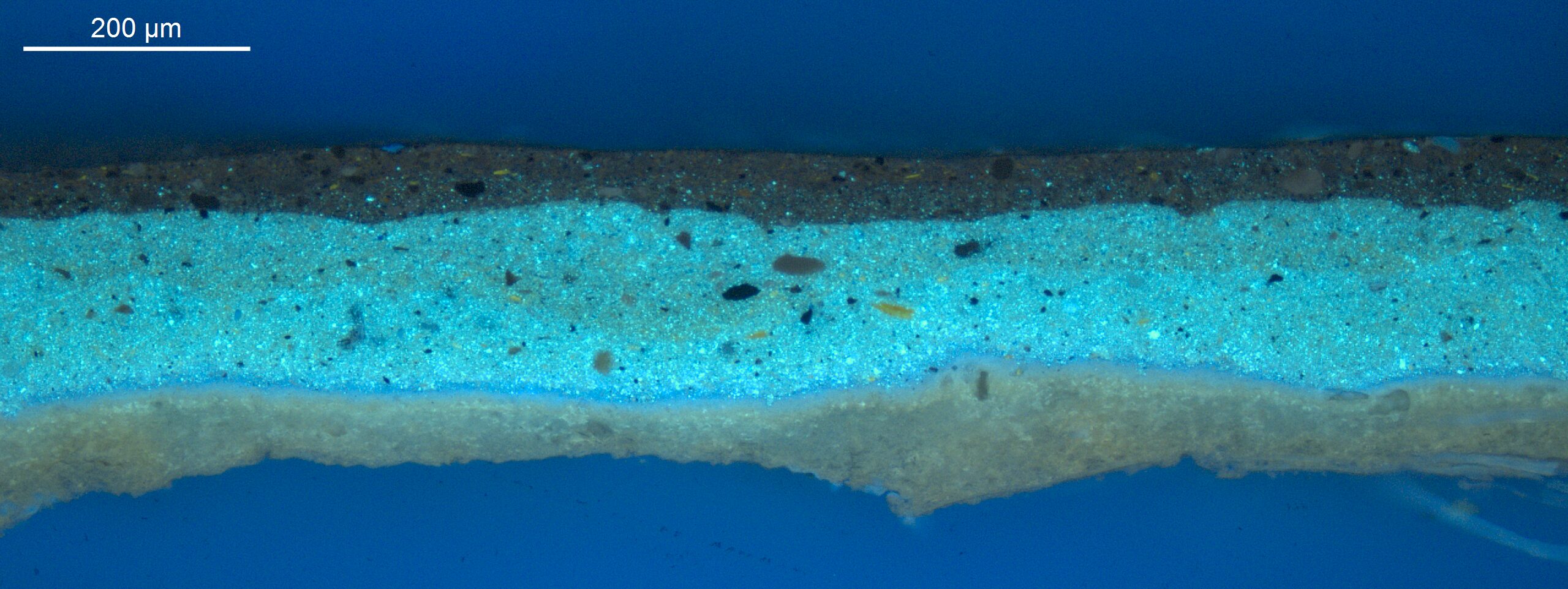 Optical microscopy uses visible light and lenses to magnify and examine the surface and structure of a painting. When applied to cross sections of paint samples, it allows for detailed observation of a painting’s stratigraphy (layer structure) and pigment particles. It is often employed with various illumination techniques, such as dark field and UV fluorescence, to enhance the analysis. Layer number 1 in the results section below the images refers to the layer at the bottom of the cross section.