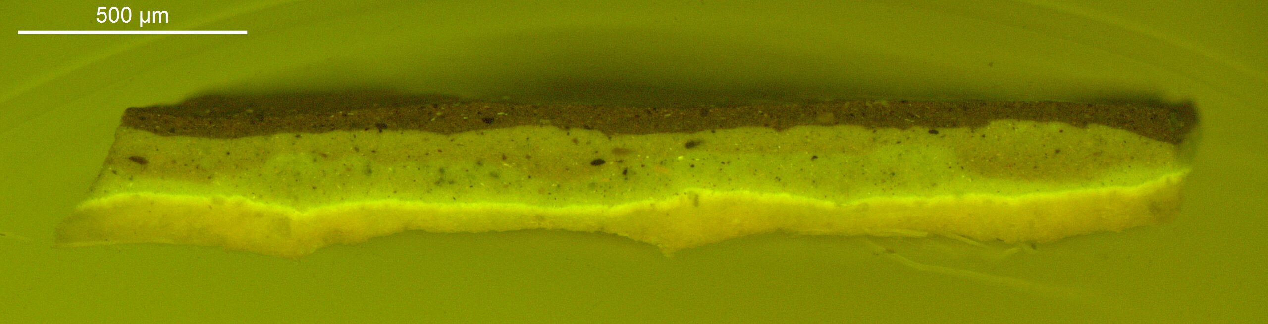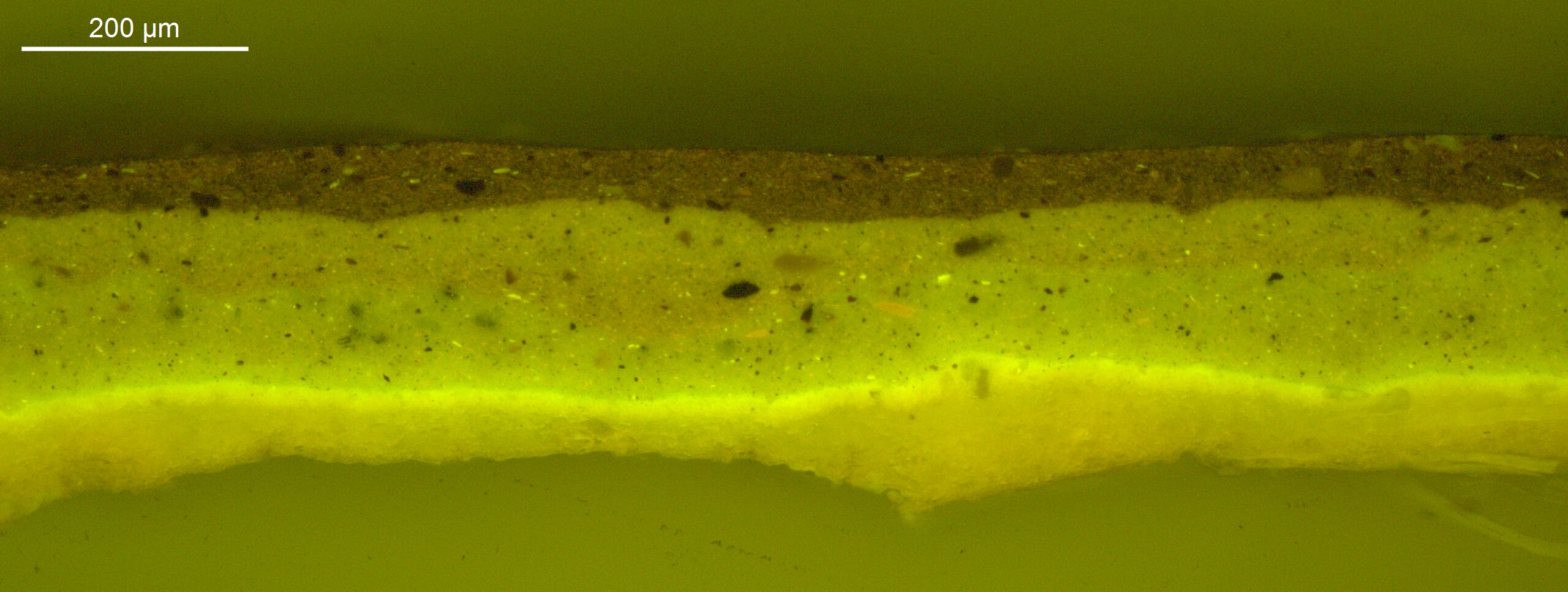 A distinctly warm yellow colour on the reverse of a sample from the ground may be from a sizing or another preparatory layer.
