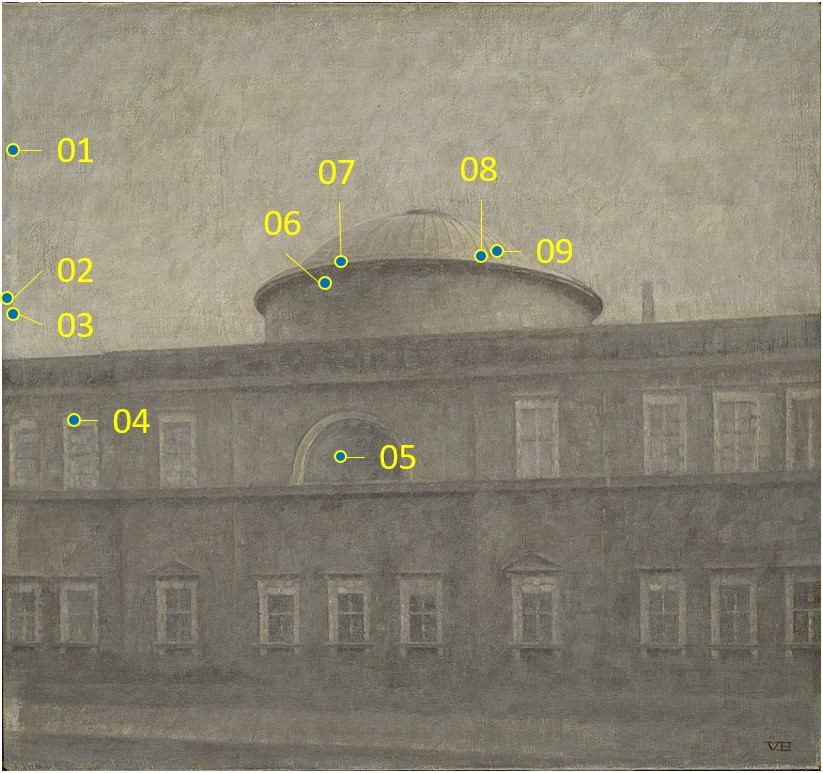 Spot XRF is a point-based analytical technique that identifies the elements present in a small area on the surface of a painting. It is commonly used to determine the chemical composition of specific locations on a painted surface. Below, the elements listed in parentheses refer to minor elements whose relative abundance is below 10% of the total signal.