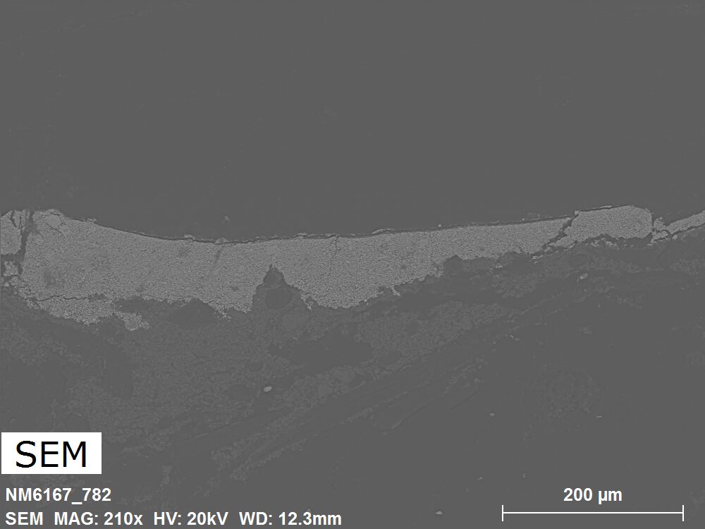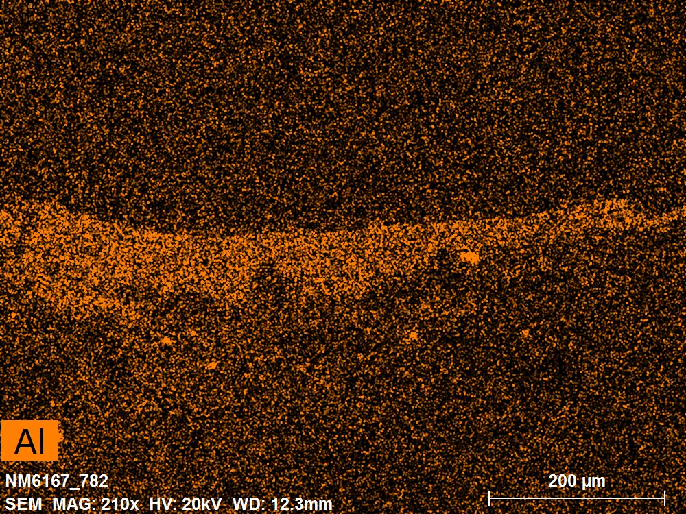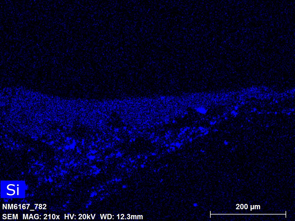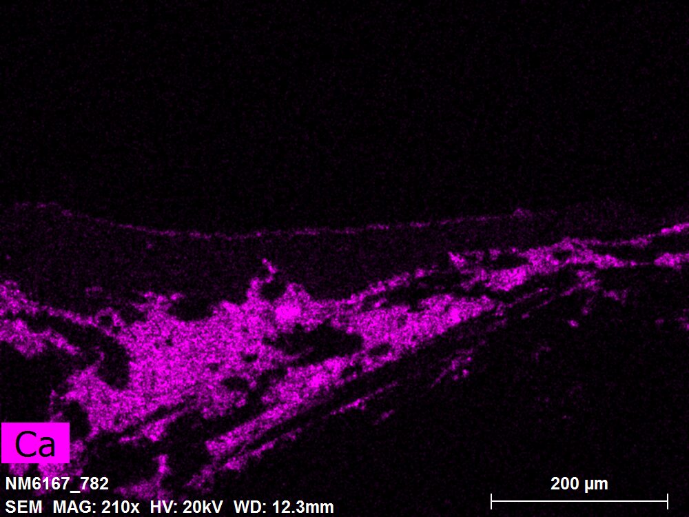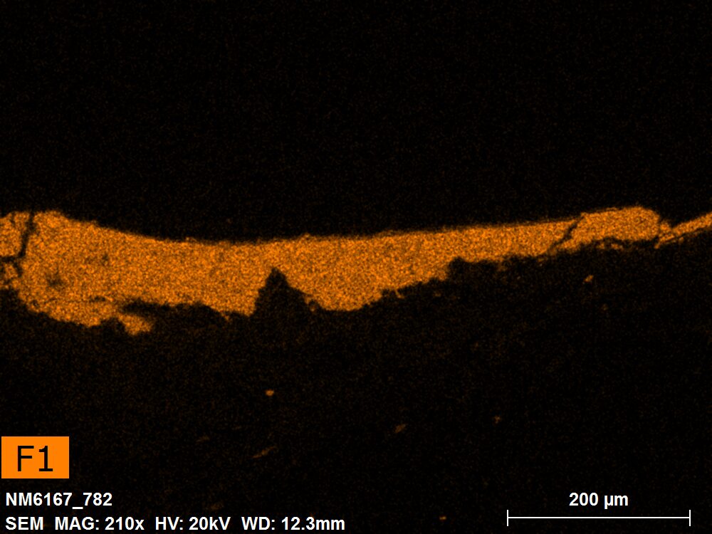 SEM-EDXS is a technique that provides highly detailed images at the microscopic level while simultaneously identifying the elemental composition of a sample. It is particularly valuable for studying the stratigraphy of paint cross sections at very fine scales, for the chemical characterisation of pigments, fillers and degradation products, and for detecting trace elements that may indicate very specific materials. Below, the elements listed in parentheses refer to minor elements whose relative abundance is below 10% of the total signal. The F1 map below represents the Pb M line. Read more under SEM-EDXS in the glossary.