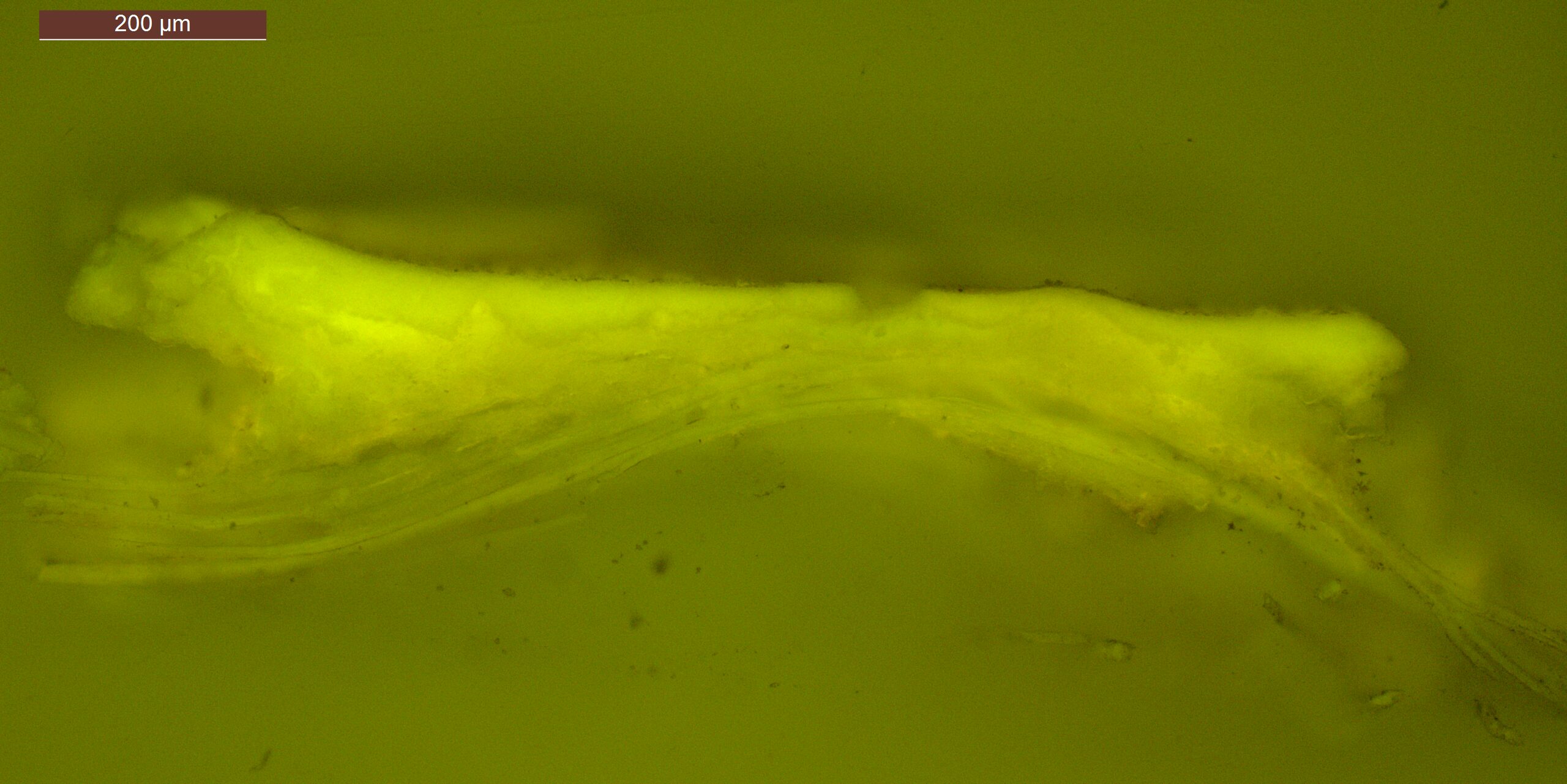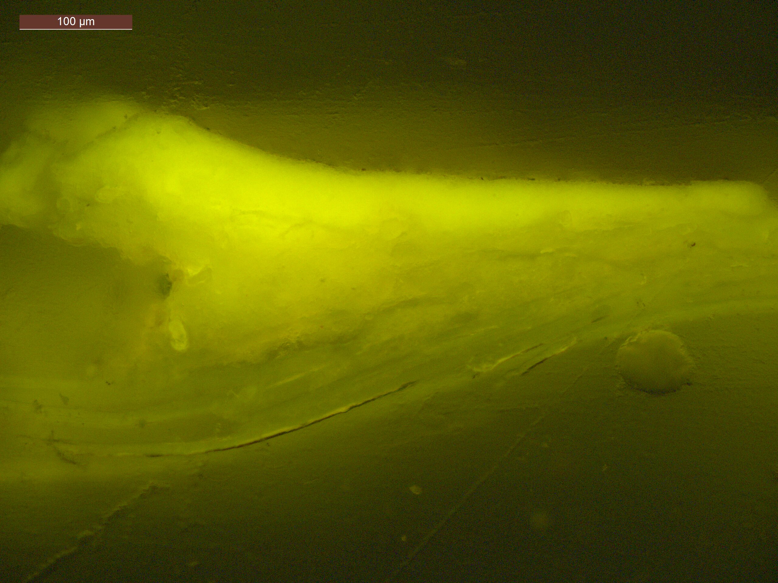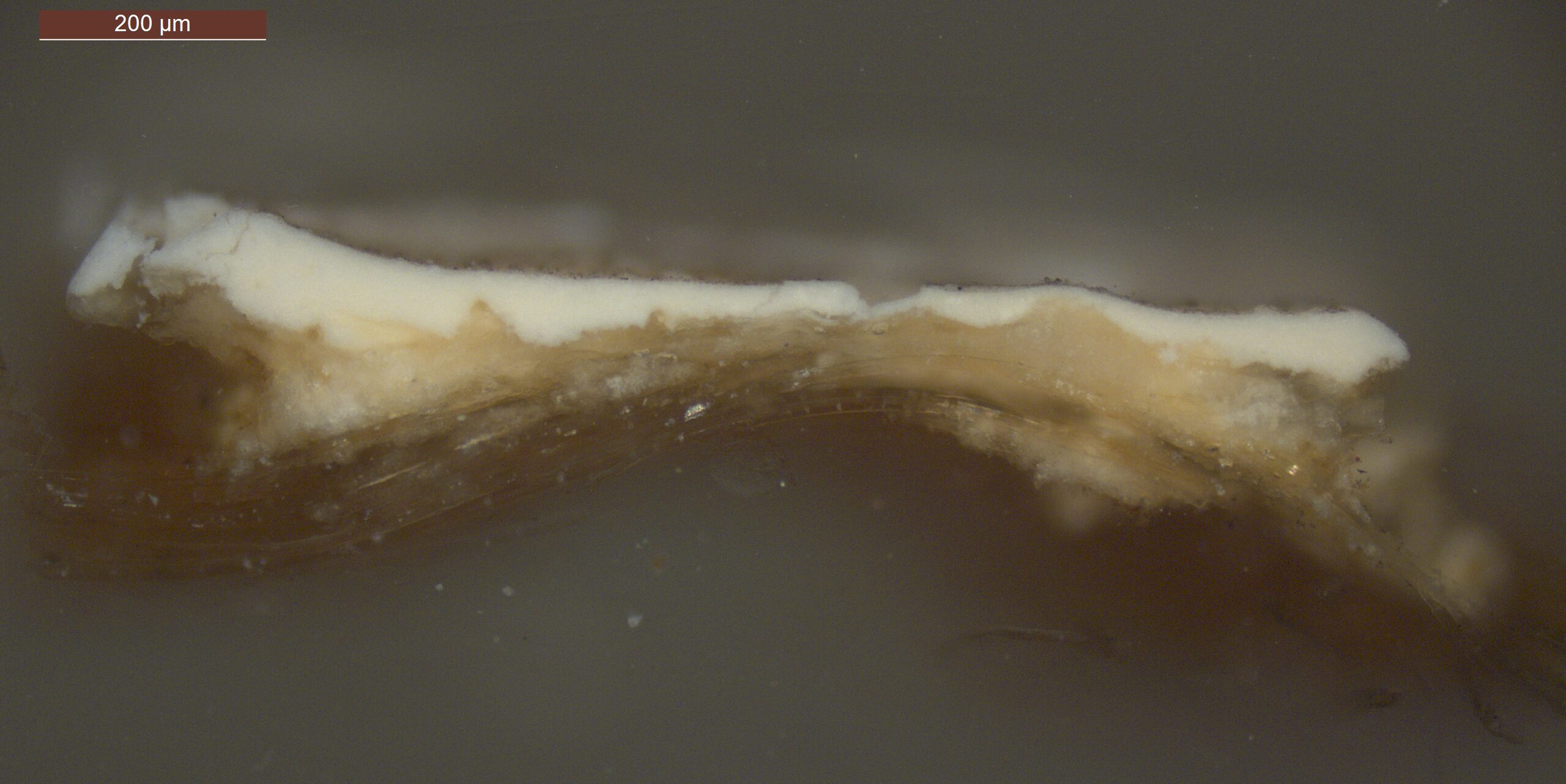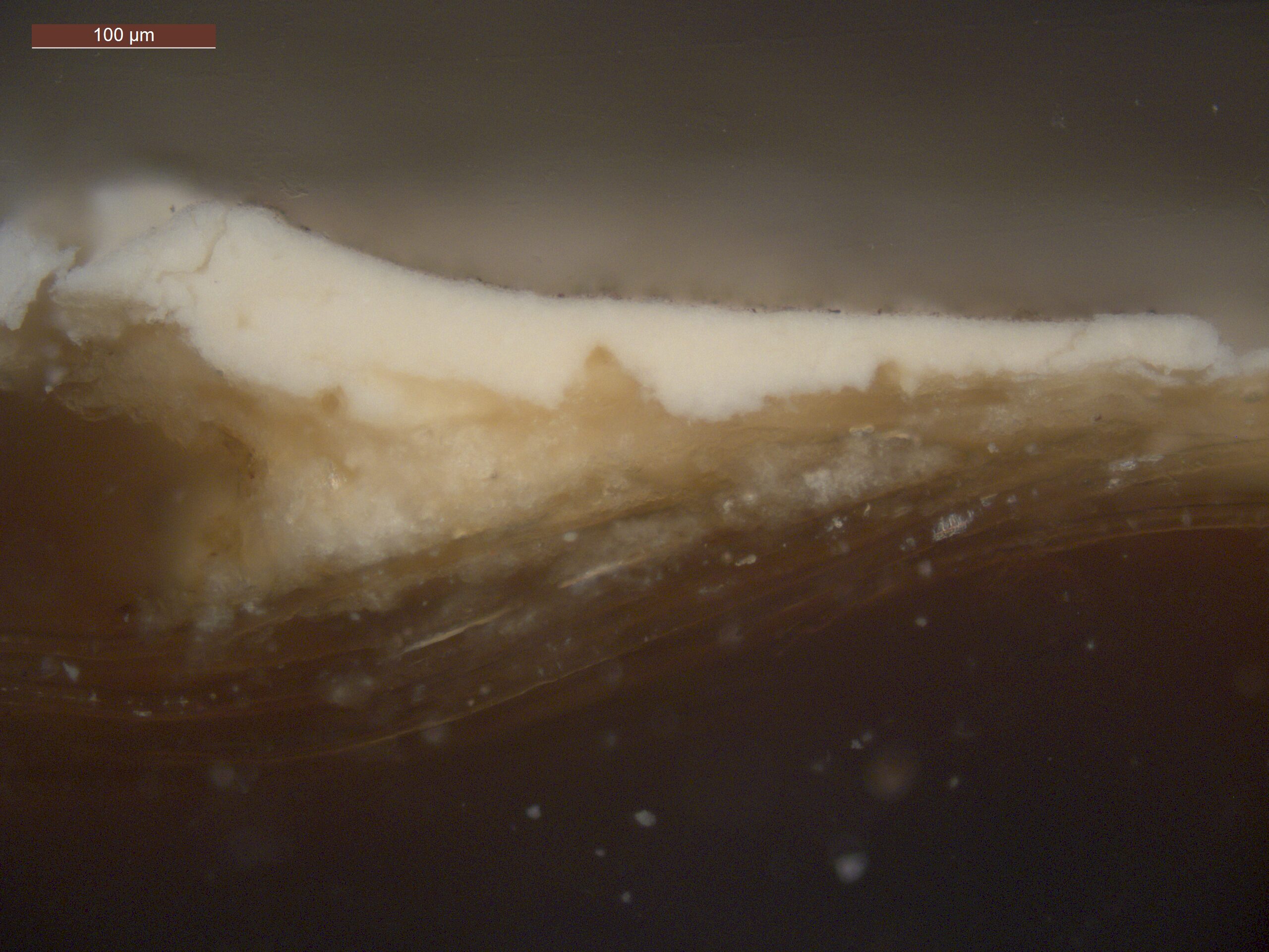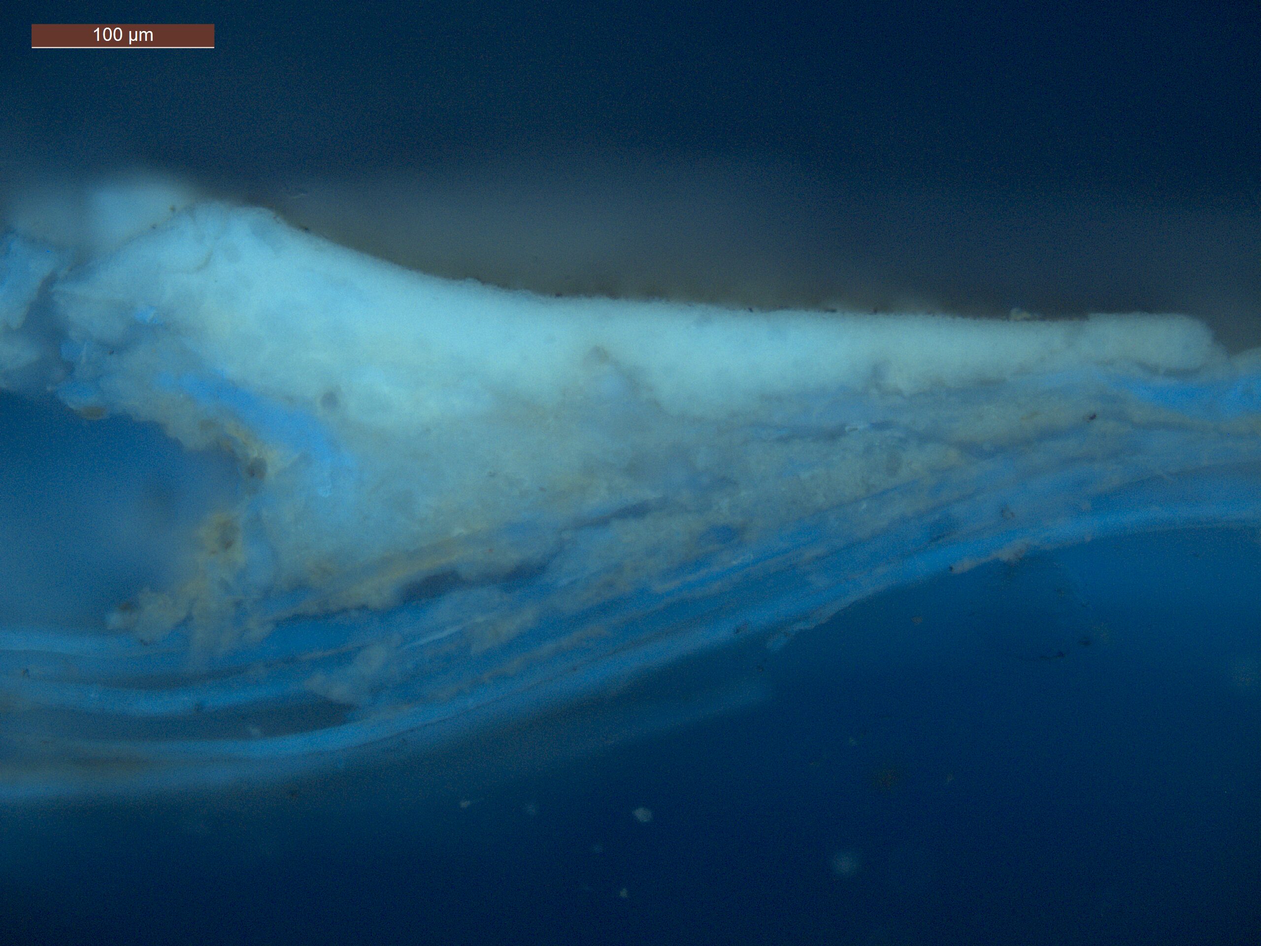 Optical microscopy uses visible light and lenses to magnify and examine the surface and structure of a painting. When applied to cross sections of paint samples, it allows for detailed observation of a painting’s stratigraphy (layer structure) and pigment particles. It is often employed with various illumination techniques, such as dark field and UV fluorescence, to enhance the analysis. Layer number 1 in the results section below the images refers to the layer at the bottom of the cross section.