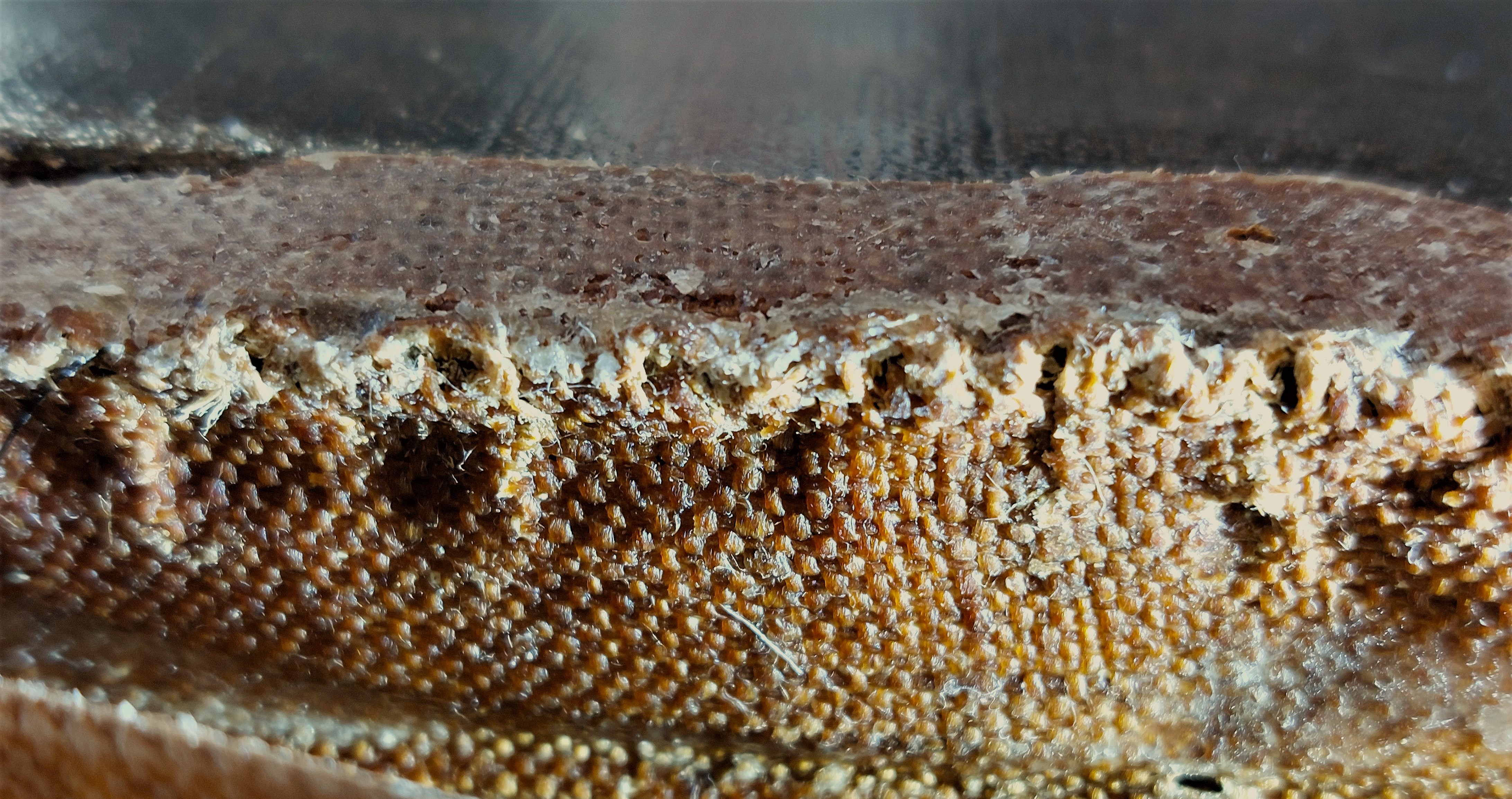 The tacking edge is cropped with the lining canvas on the left-hand side.