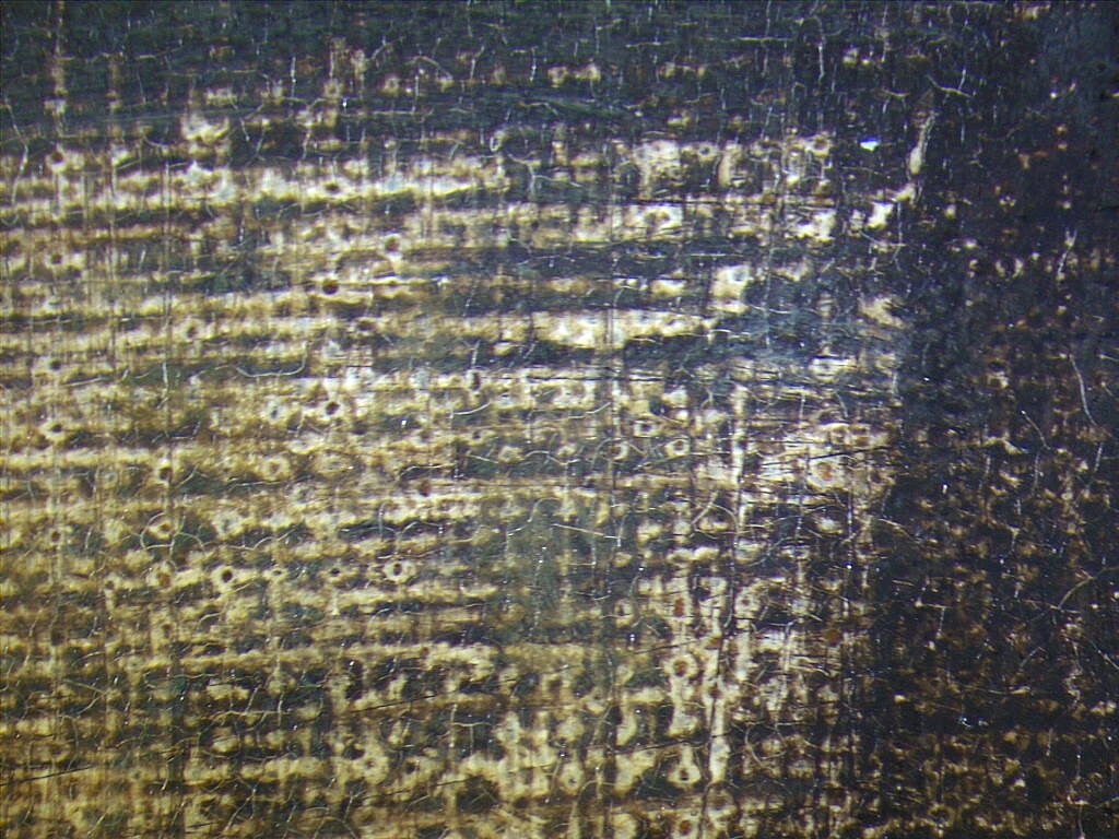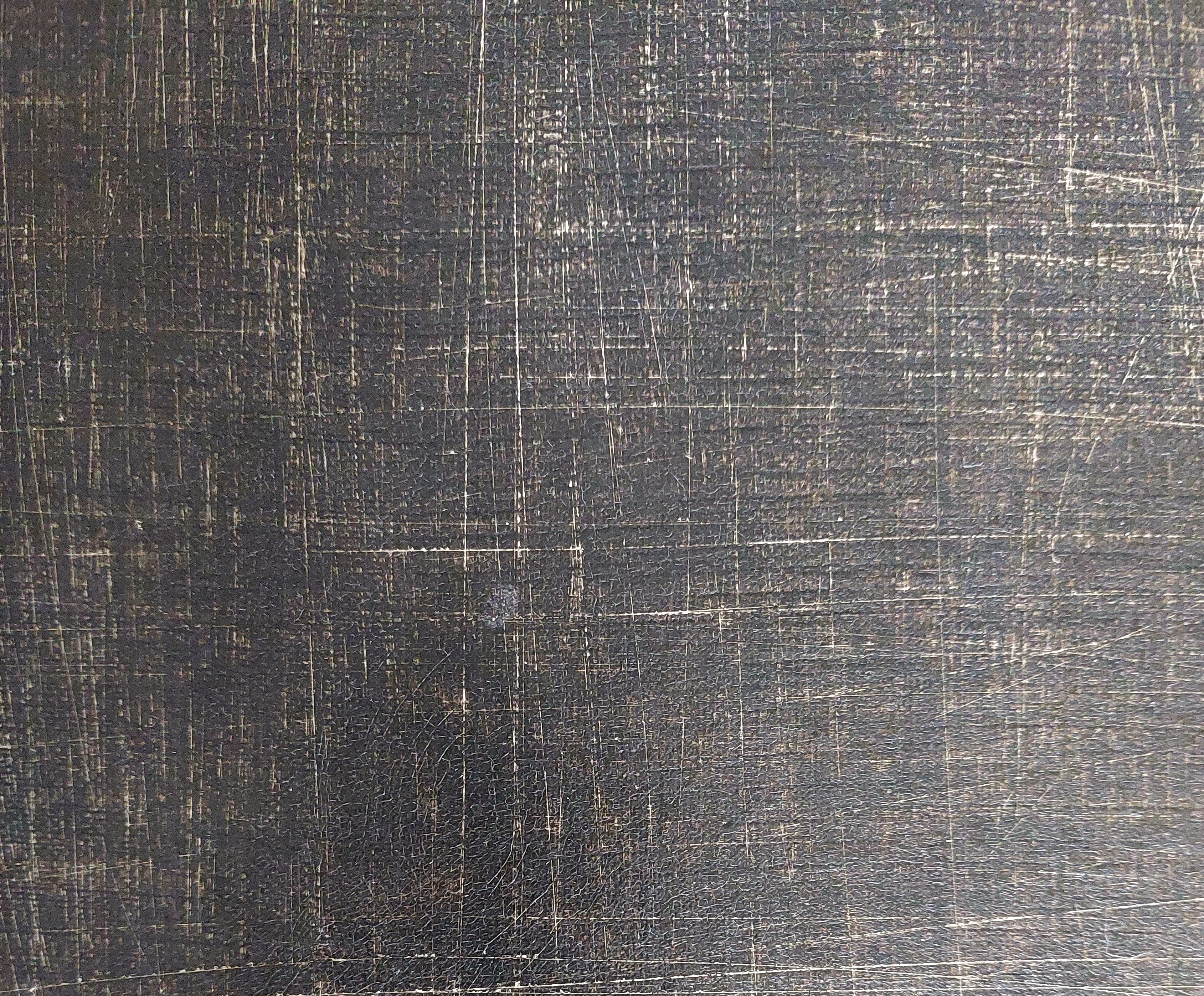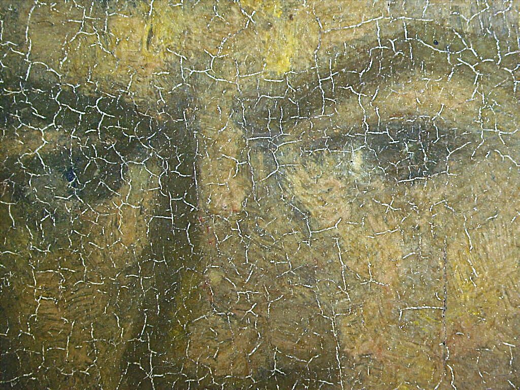 The scraping of the paint, revealing the ground underneath, has also largely exposed the canvas knots, which may have darkened by the absorption of conservation-related materials. The general tonality of the painting may have become affected by the wax-resin lining and a past treatment with linseed oil as well as the application of a varnish.