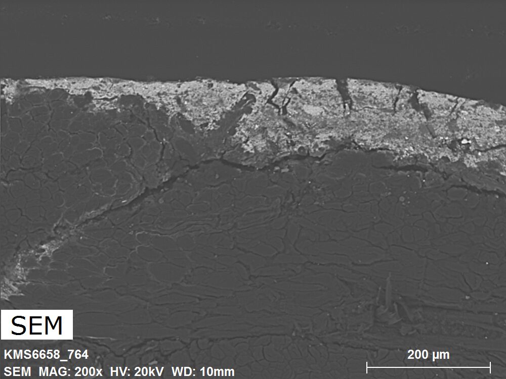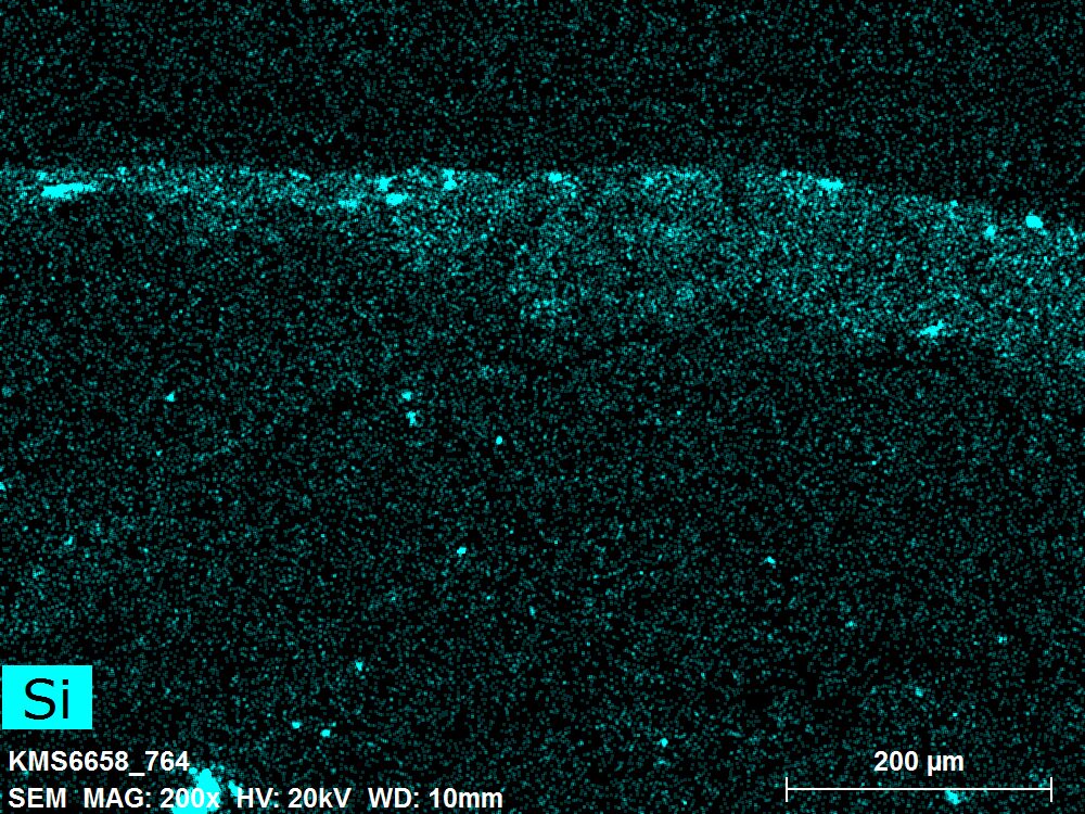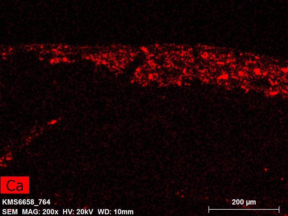 SEM-EDXS is a technique that provides highly detailed images at the microscopic level while simultaneously identifying the elemental composition of a sample. It is particularly valuable for studying the stratigraphy of paint cross sections at very fine scales, for the chemical characterisation of pigments, fillers and degradation products, and for detecting trace elements that may indicate very specific materials. Below, the elements listed in parentheses refer to minor elements whose relative abundance is below 10% of the total signal. The F1 map below represents the Pb M line. Read more under SEM-EDXS in the glossary.