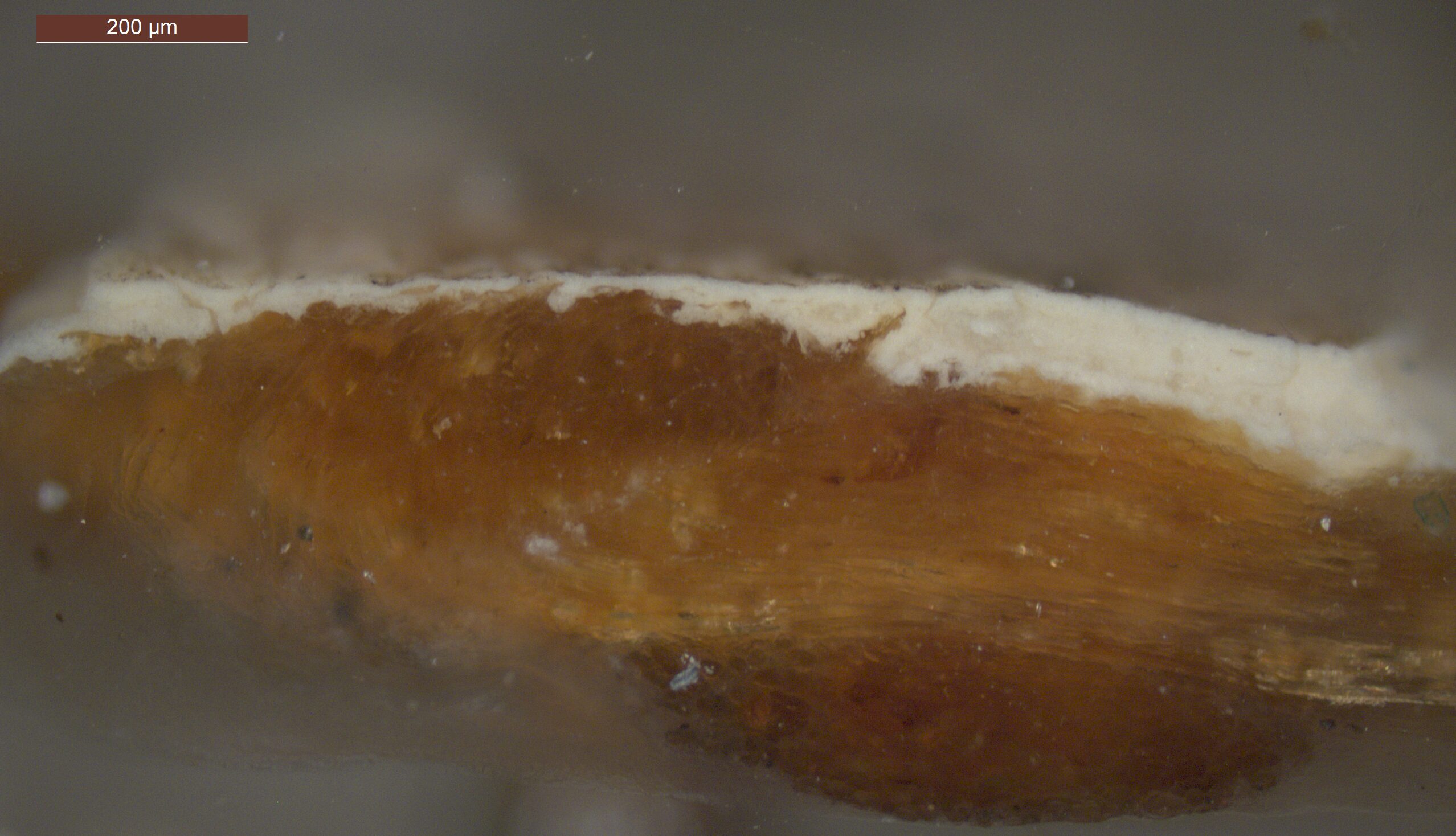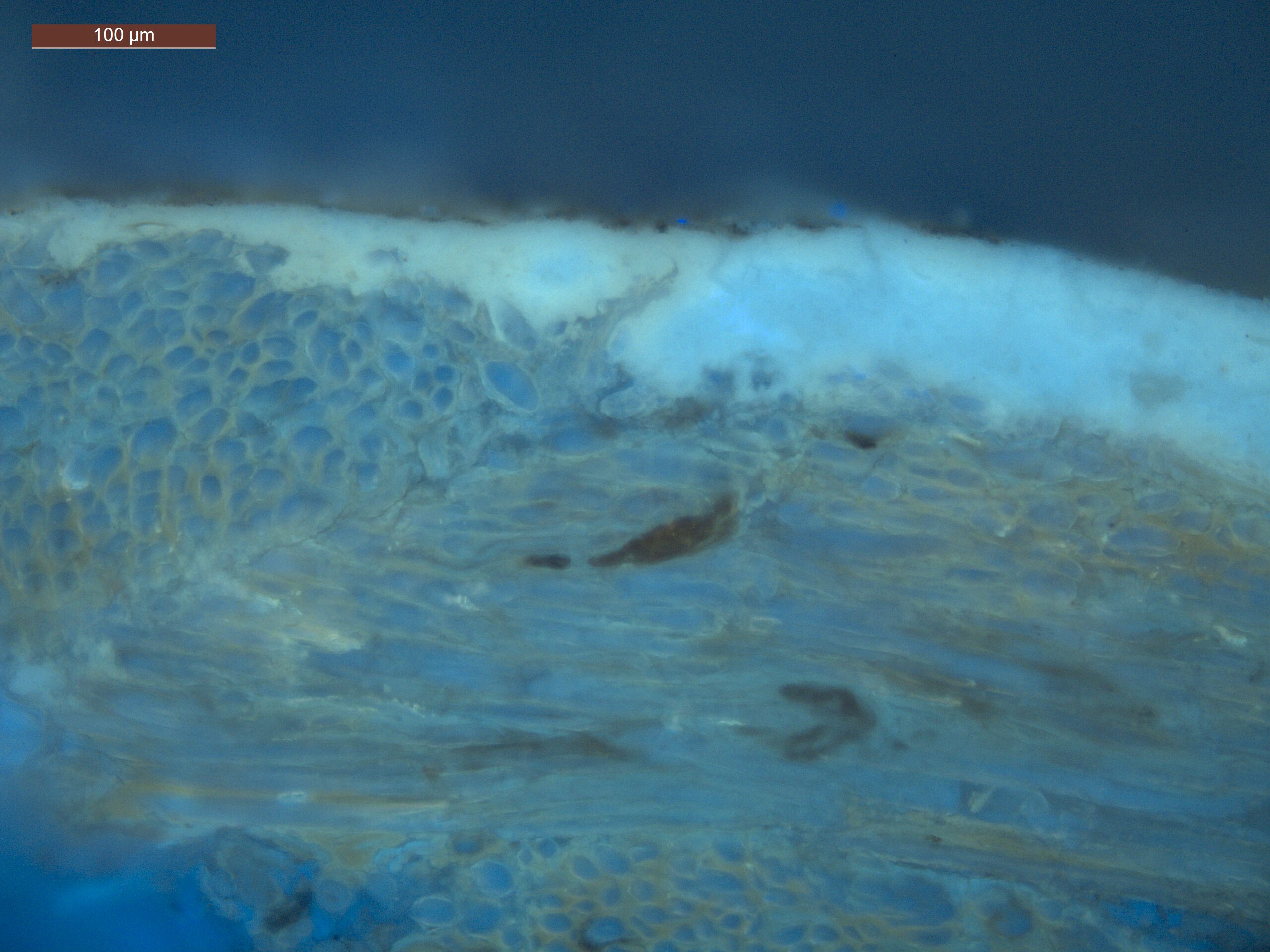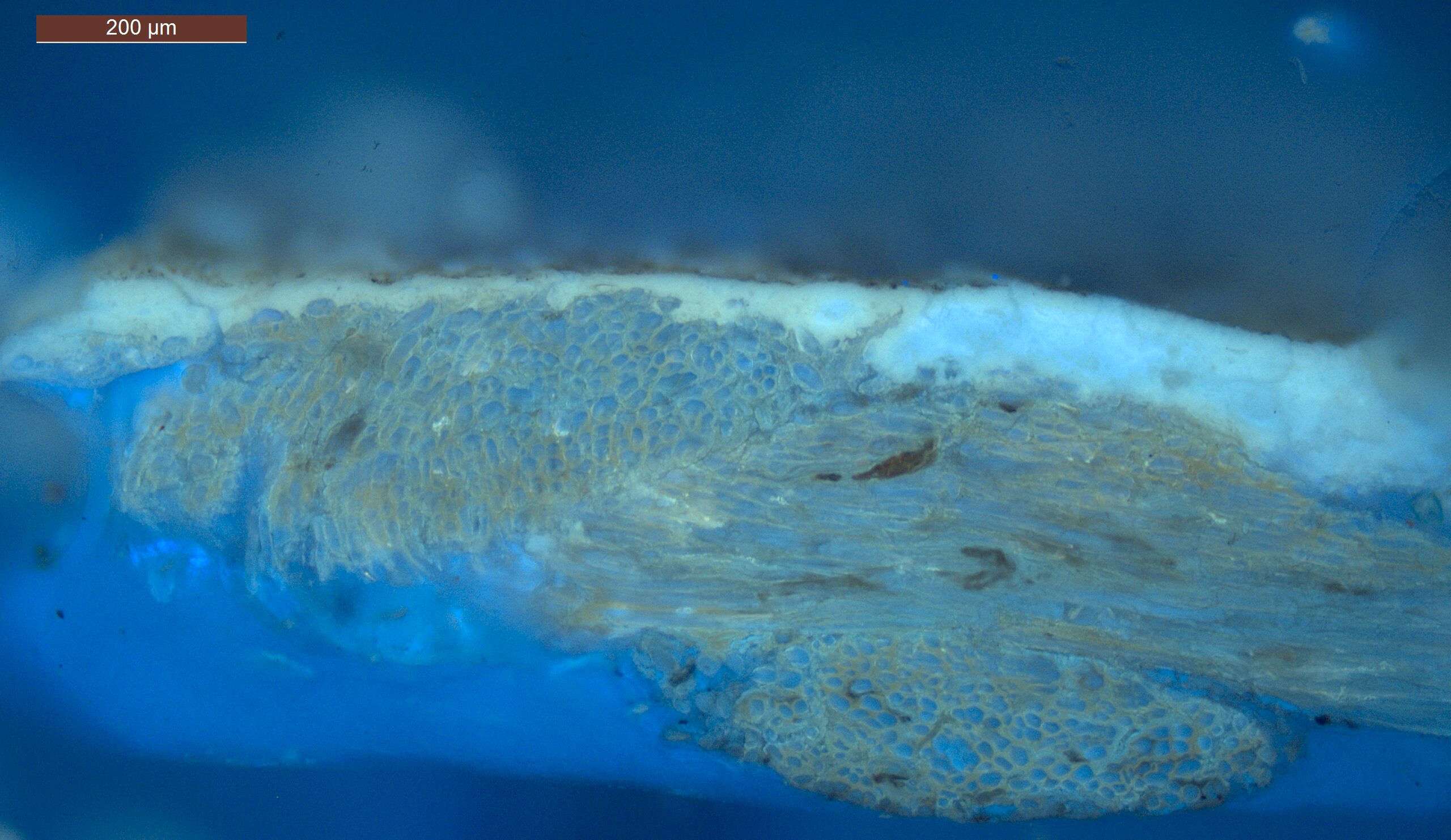 Optical microscopy uses visible light and lenses to magnify and examine the surface and structure of a painting. When applied to cross sections of paint samples, it allows for detailed observation of a painting’s stratigraphy (layer structure) and pigment particles. It is often employed with various illumination techniques, such as dark field and UV fluorescence, to enhance the analysis. Layer number 1 in the results section below the images refers to the layer at the bottom of the cross section.