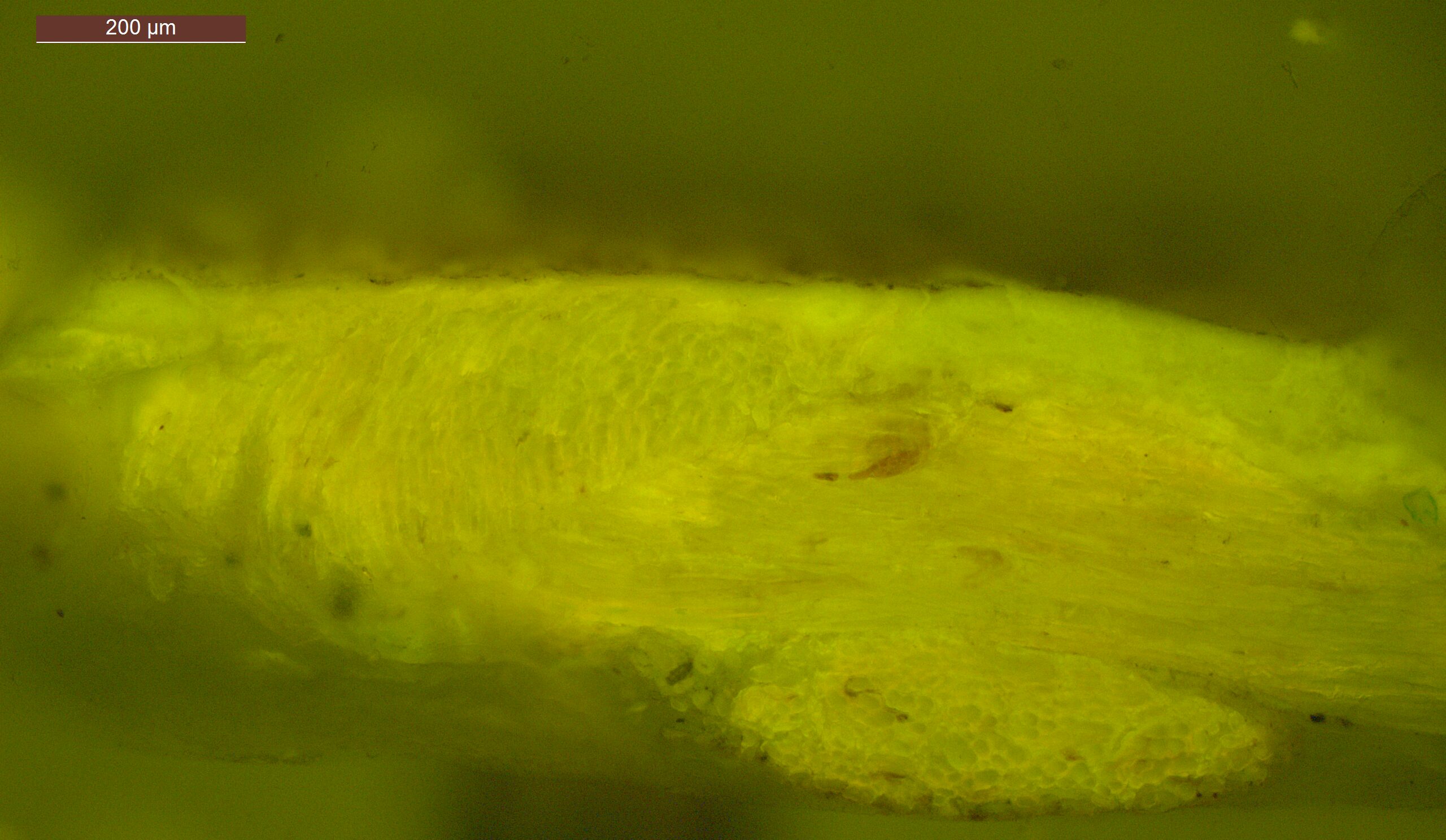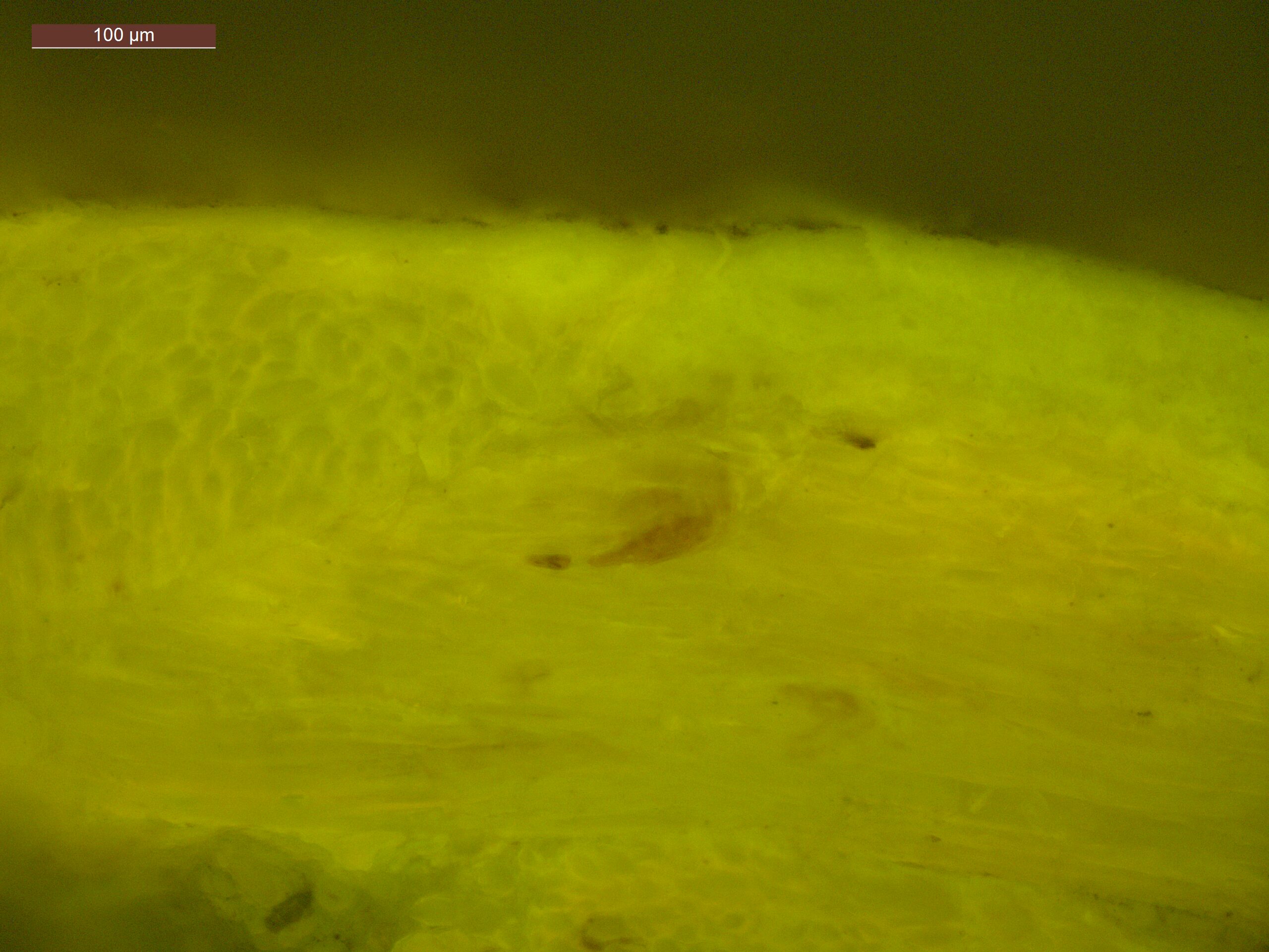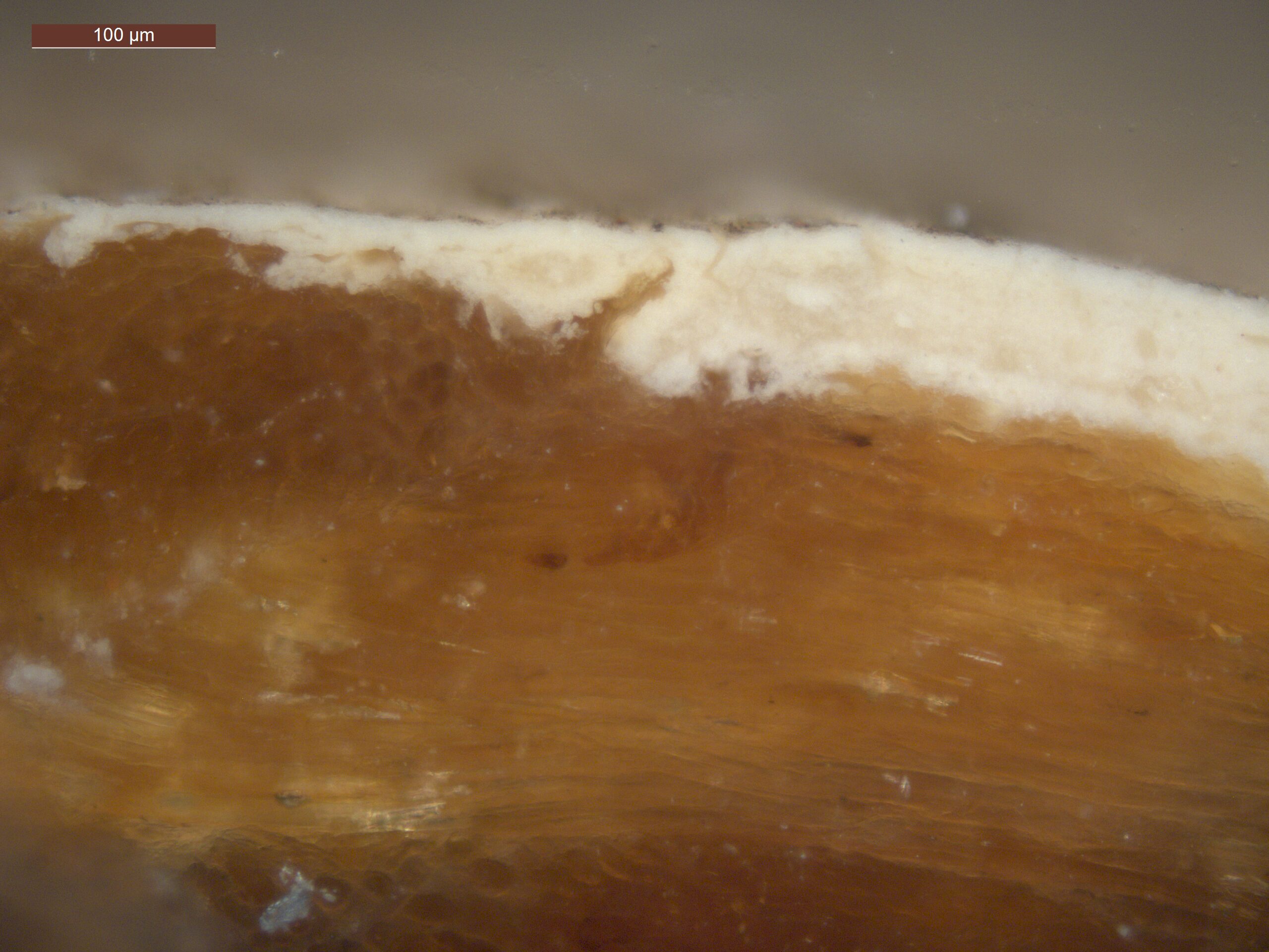 Optical microscopy uses visible light and lenses to magnify and examine the surface and structure of a painting. When applied to cross sections of paint samples, it allows for detailed observation of a painting’s stratigraphy (layer structure) and pigment particles. It is often employed with various illumination techniques, such as dark field and UV fluorescence, to enhance the analysis. Layer number 1 in the results section below the images refers to the layer at the bottom of the cross section.