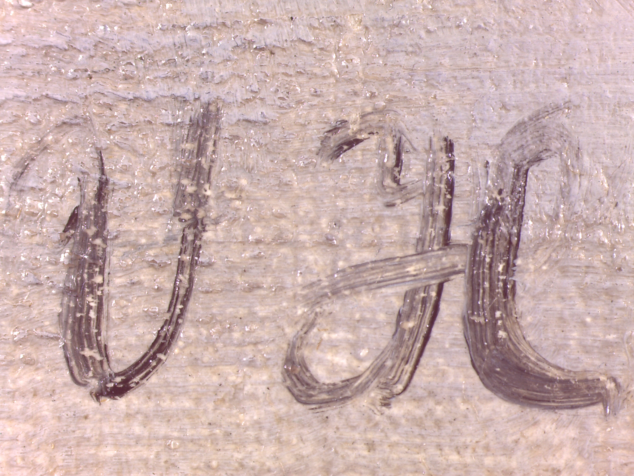 The signature was applied while the pale grey paint of the farmyard was still wet.