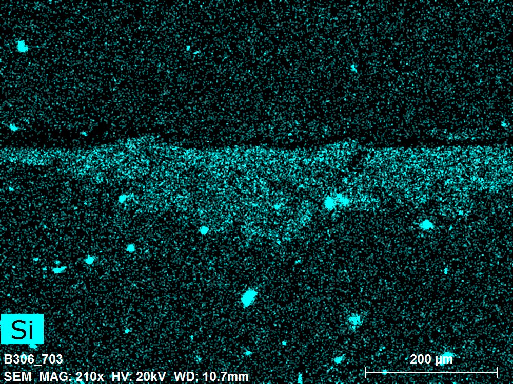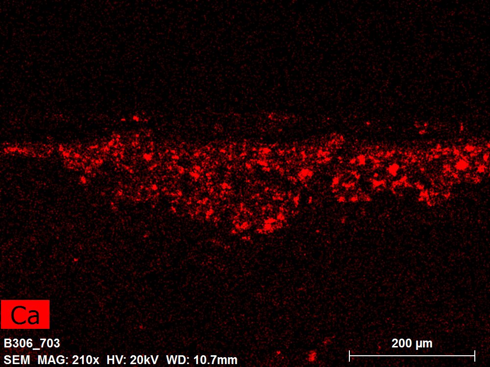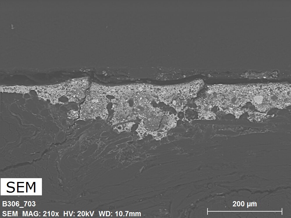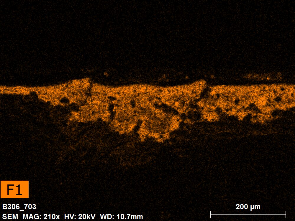 SEM-EDXS is a technique that provides highly detailed images at the microscopic level while simultaneously identifying the elemental composition of a sample. It is particularly valuable for studying the stratigraphy of paint cross sections at very fine scales, for the chemical characterisation of pigments, fillers and degradation products, and for detecting trace elements that may indicate very specific materials. Below, the elements listed in parentheses refer to minor elements whose relative abundance is below 10% of the total signal. The F1 map below represents the Pb M line. Read more under SEM-EDXS in the glossary.