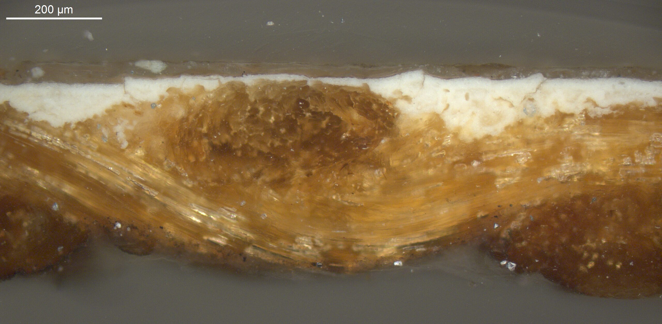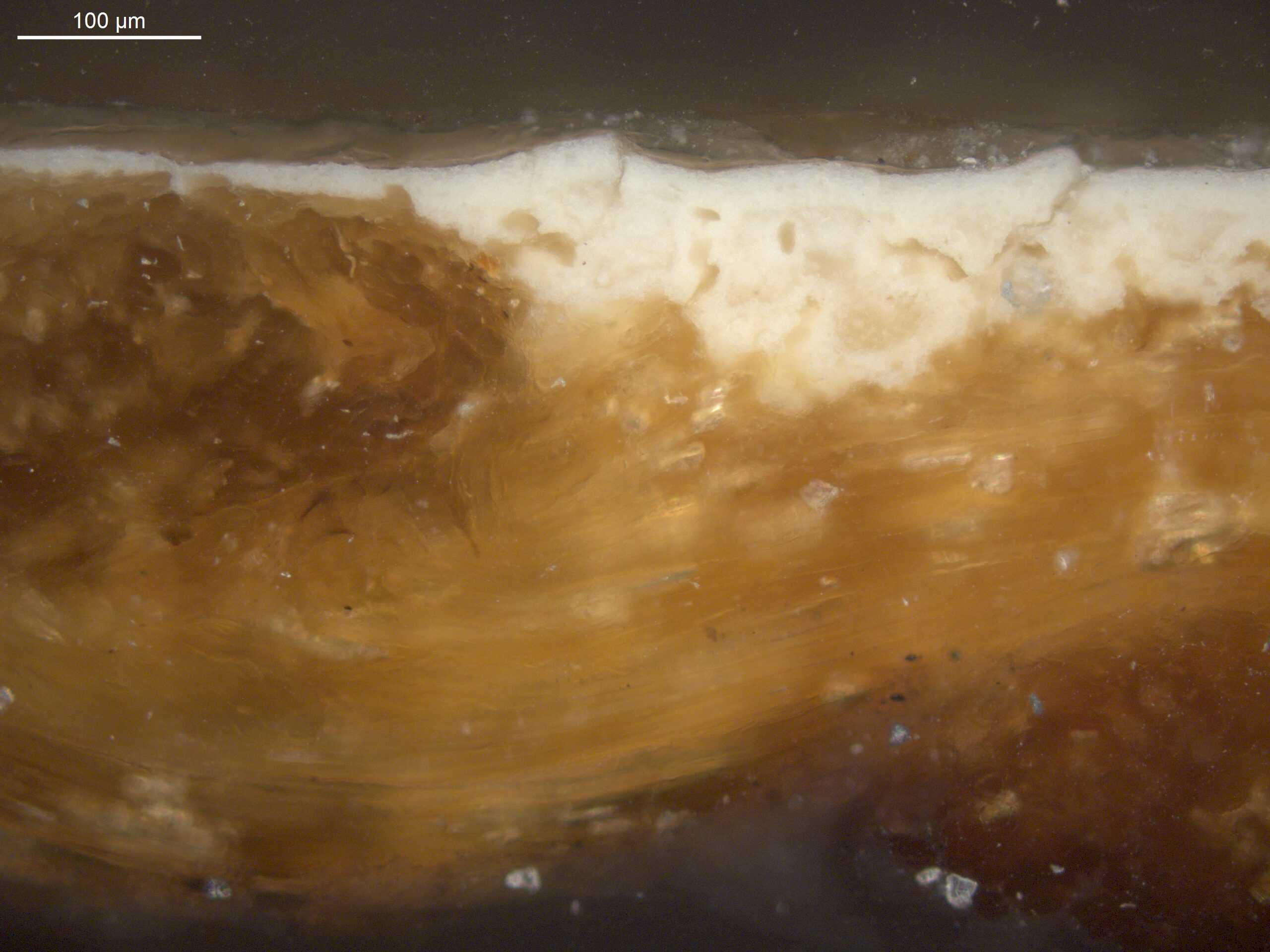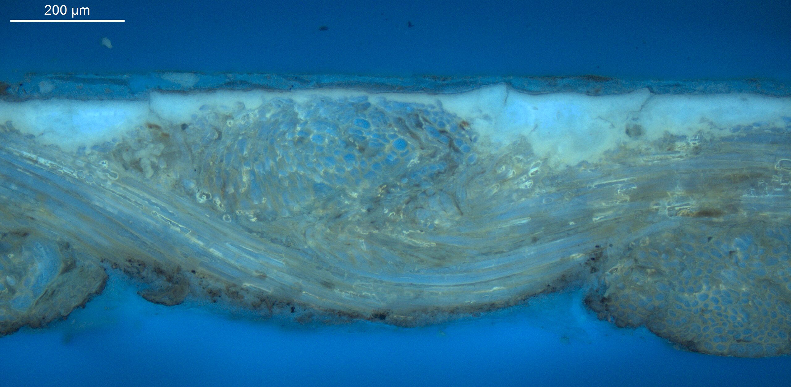 Optical microscopy uses visible light and lenses to magnify and examine the surface and structure of a painting. When applied to cross sections of paint samples, it allows for detailed observation of a painting’s stratigraphy (layer structure) and pigment particles. It is often employed with various illumination techniques, such as dark field and UV fluorescence, to enhance the analysis. Layer number 1 in the results section below the images refers to the layer at the bottom of the cross section.