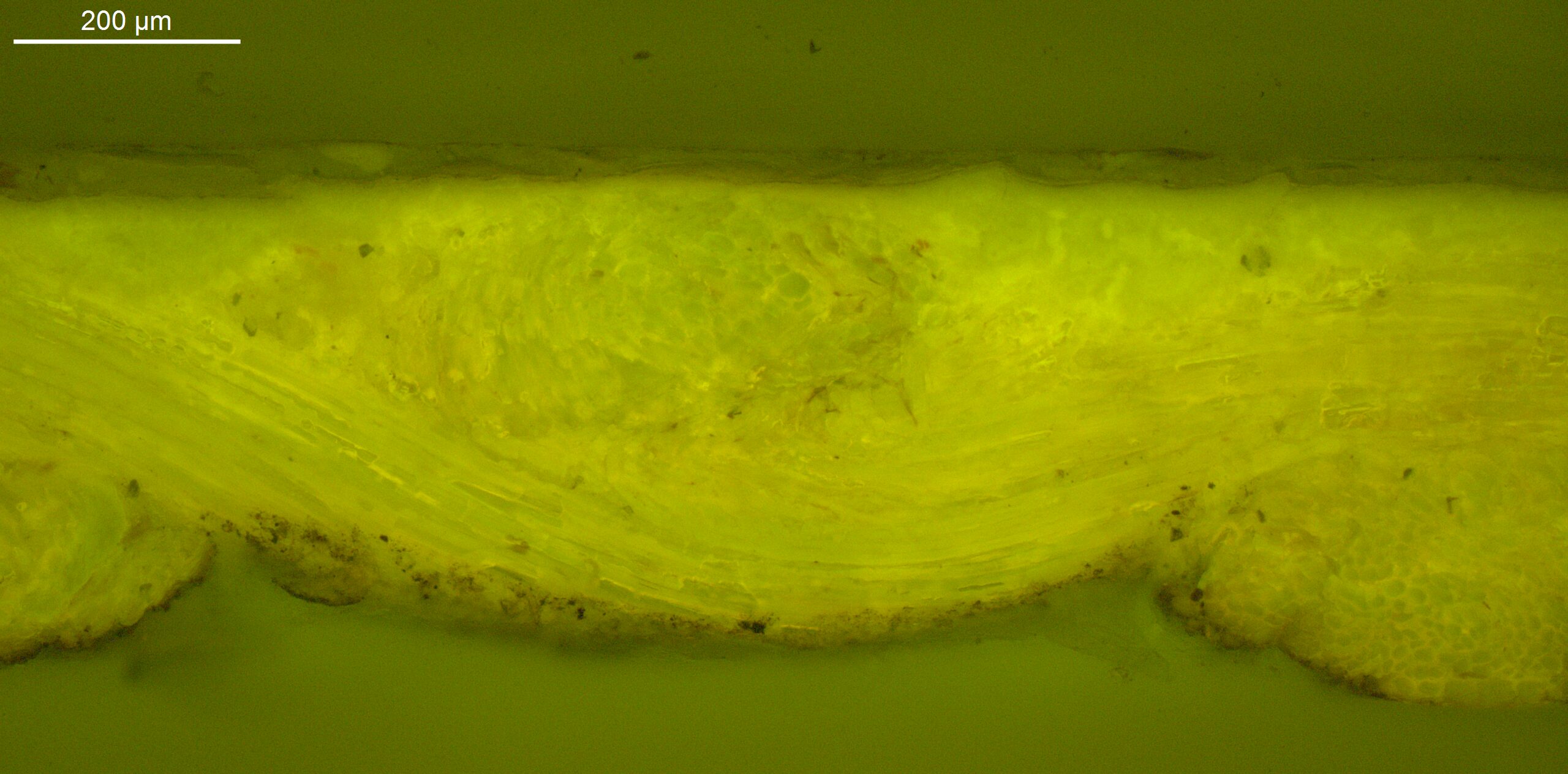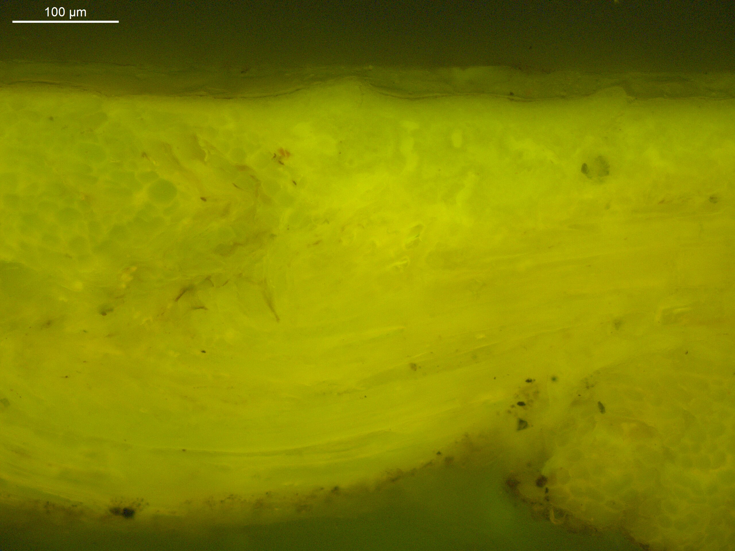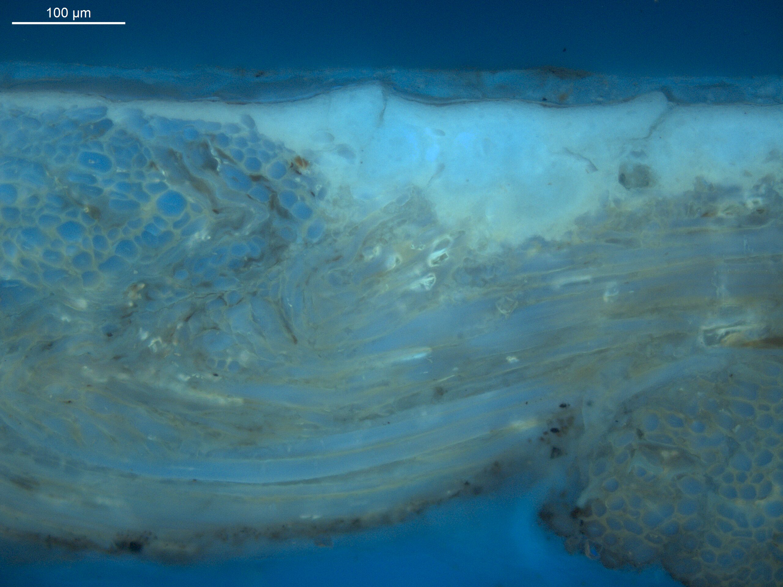 Optical microscopy uses visible light and lenses to magnify and examine the surface and structure of a painting. When applied to cross sections of paint samples, it allows for detailed observation of a painting’s stratigraphy (layer structure) and pigment particles. It is often employed with various illumination techniques, such as dark field and UV fluorescence, to enhance the analysis. Layer number 1 in the results section below the images refers to the layer at the bottom of the cross section.