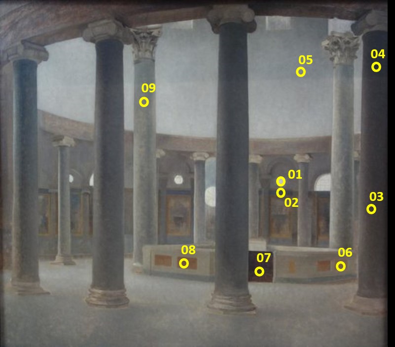 The painting was carried out in a wet-in-wet technique within the individual colour areas. The main central areas of the columns were applied in a thin fluid paint in short brush strokes with no predominant direction. The same applies to the majority of the floor and the dome, as opposed to the smaller geometrical shapes in the middle distance and the background where the brush strokes follow the shapes to a greater extent.