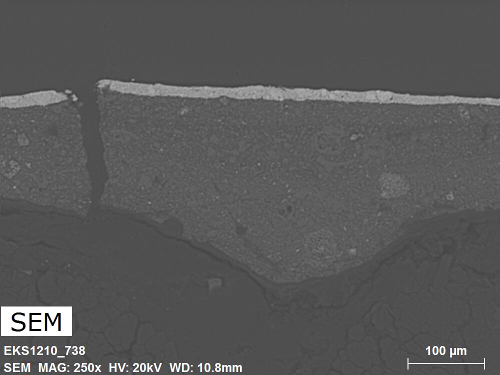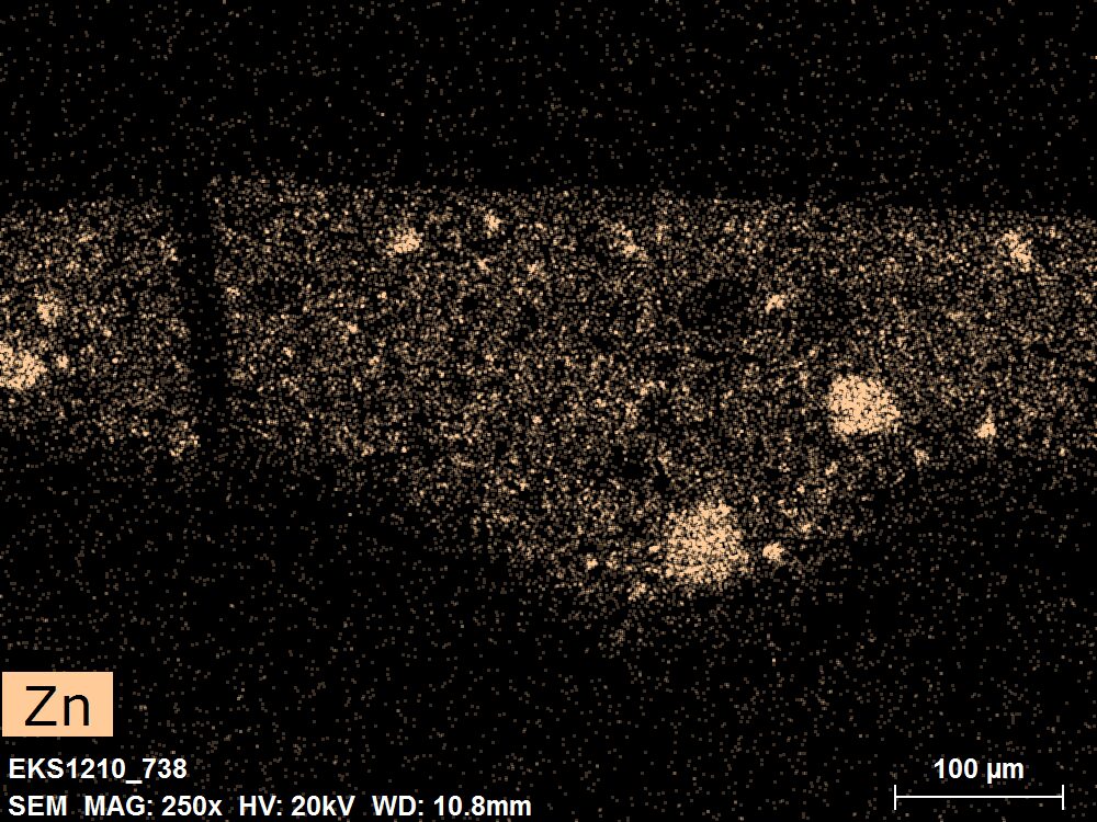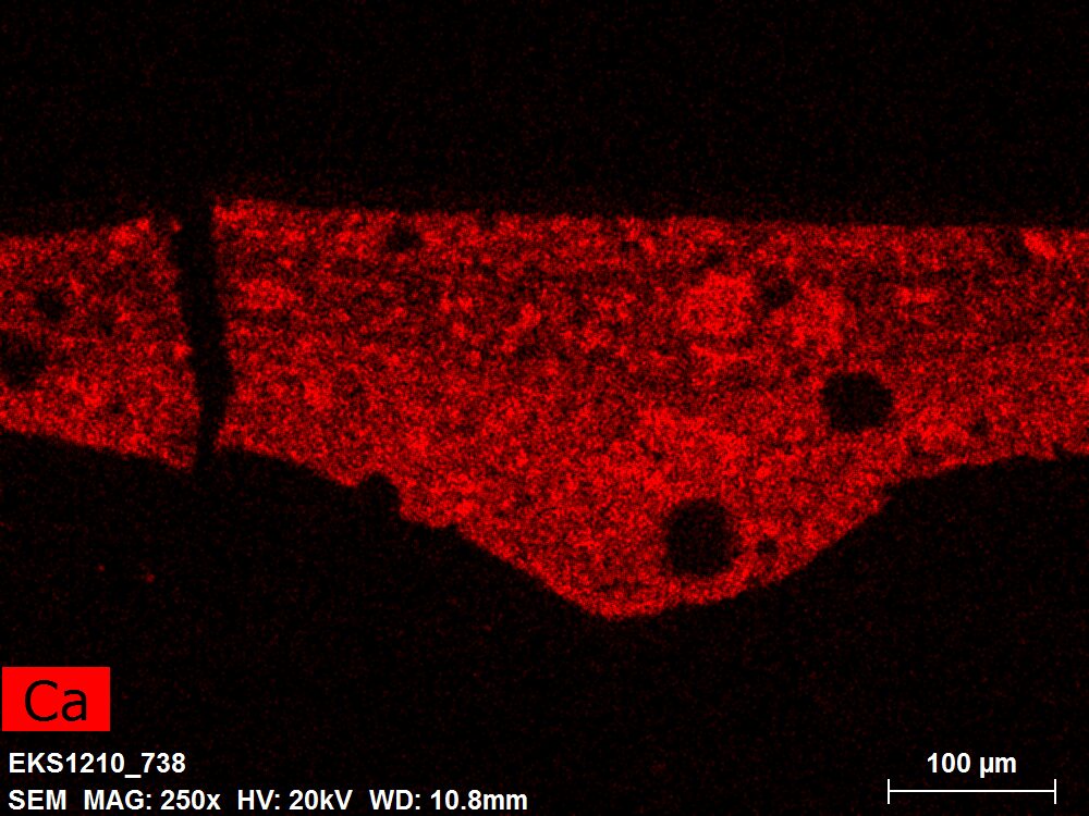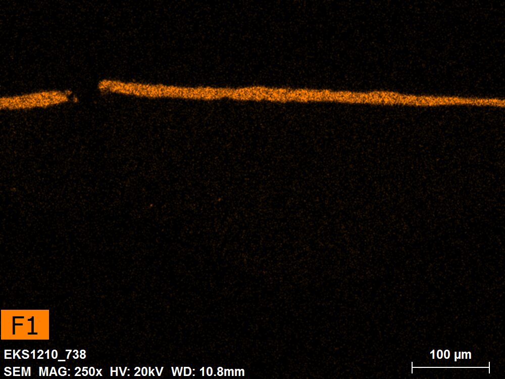 SEM-EDXS is a technique that provides highly detailed images at the microscopic level while simultaneously identifying the elemental composition of a sample. It is particularly valuable for studying the stratigraphy of paint cross sections at very fine scales, for the chemical characterisation of pigments, fillers and degradation products, and for detecting trace elements that may indicate very specific materials. Below, the elements listed in parentheses refer to minor elements whose relative abundance is below 10% of the total signal. The F1 map below represents the Pb M line. Read more under SEM-EDXS in the glossary.