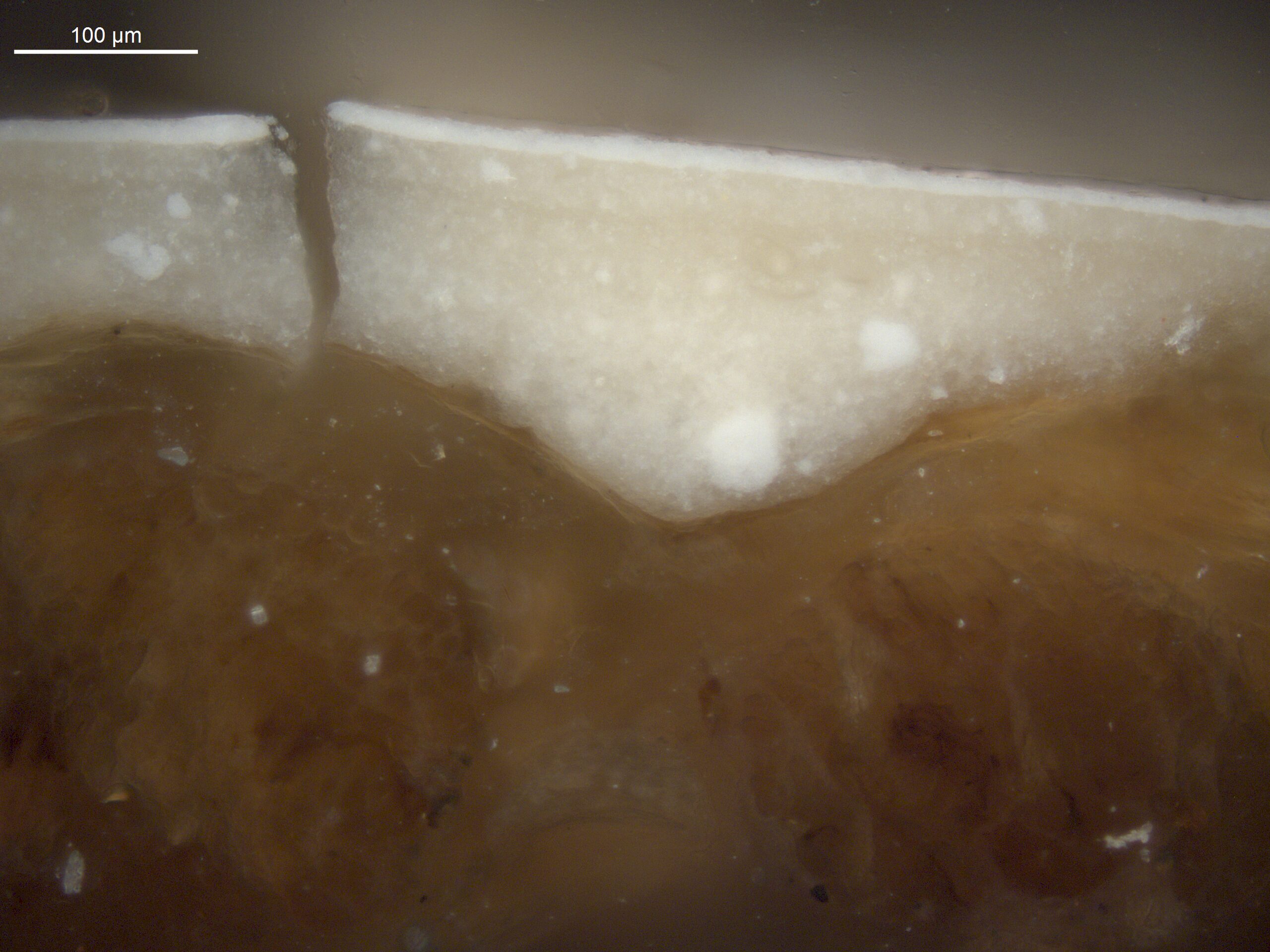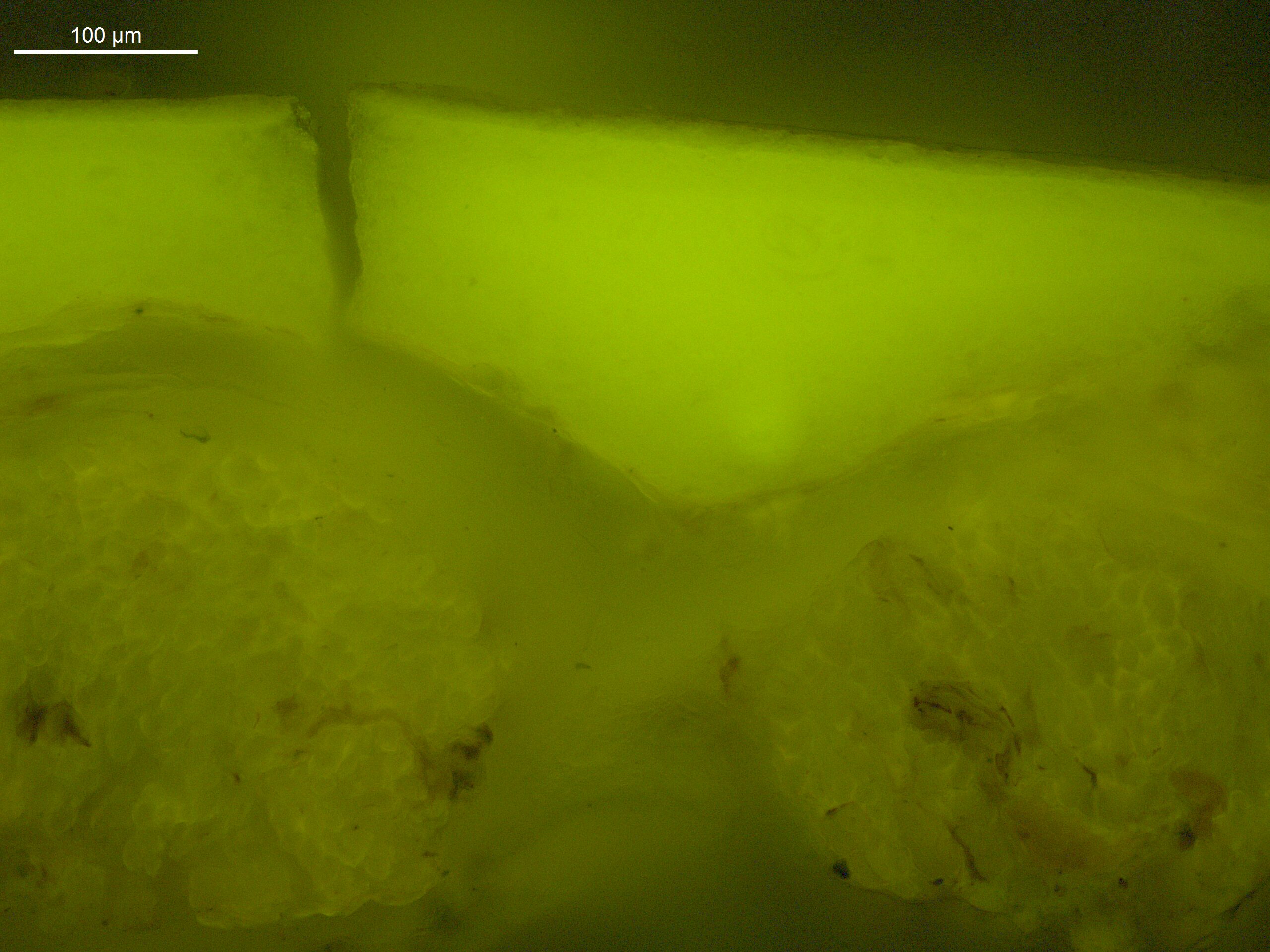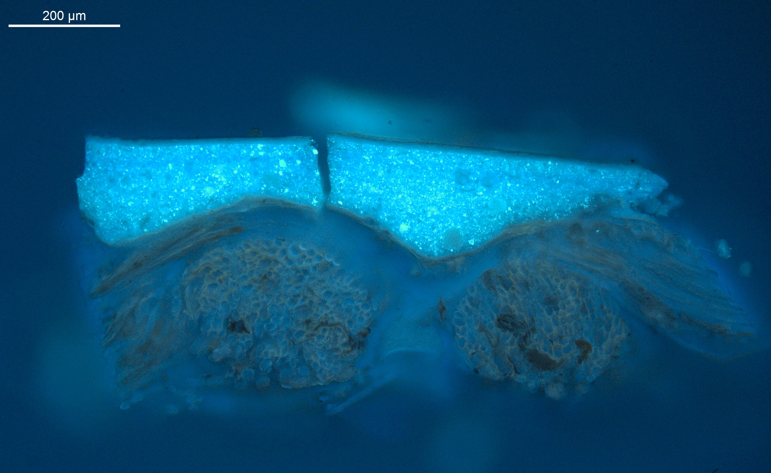 Optical microscopy uses visible light and lenses to magnify and examine the surface and structure of a painting. When applied to cross sections of paint samples, it allows for detailed observation of a painting’s stratigraphy (layer structure) and pigment particles. It is often employed with various illumination techniques, such as dark field and UV fluorescence, to enhance the analysis. Layer number 1 in the results section below the images refers to the layer at the bottom of the cross section.