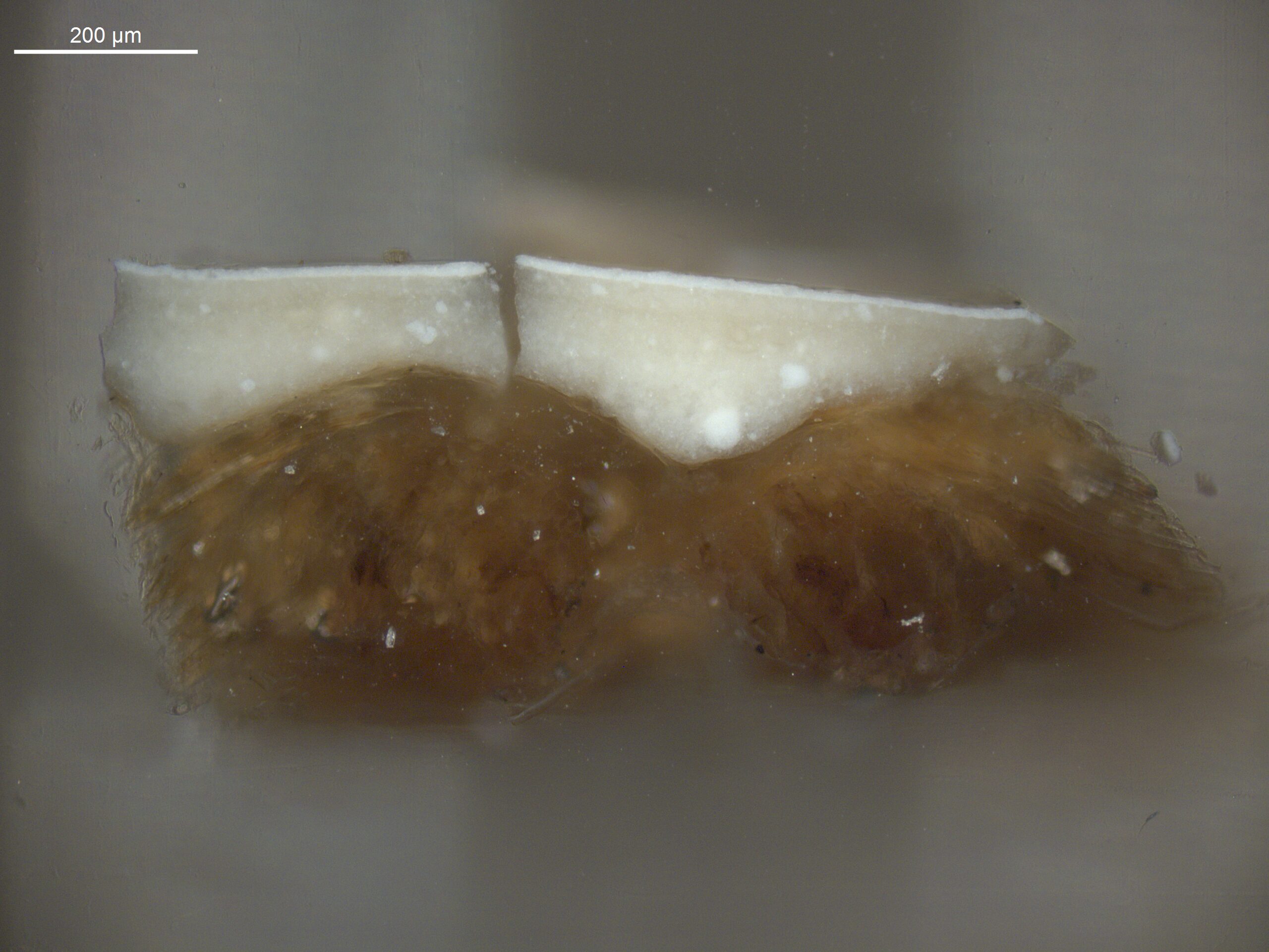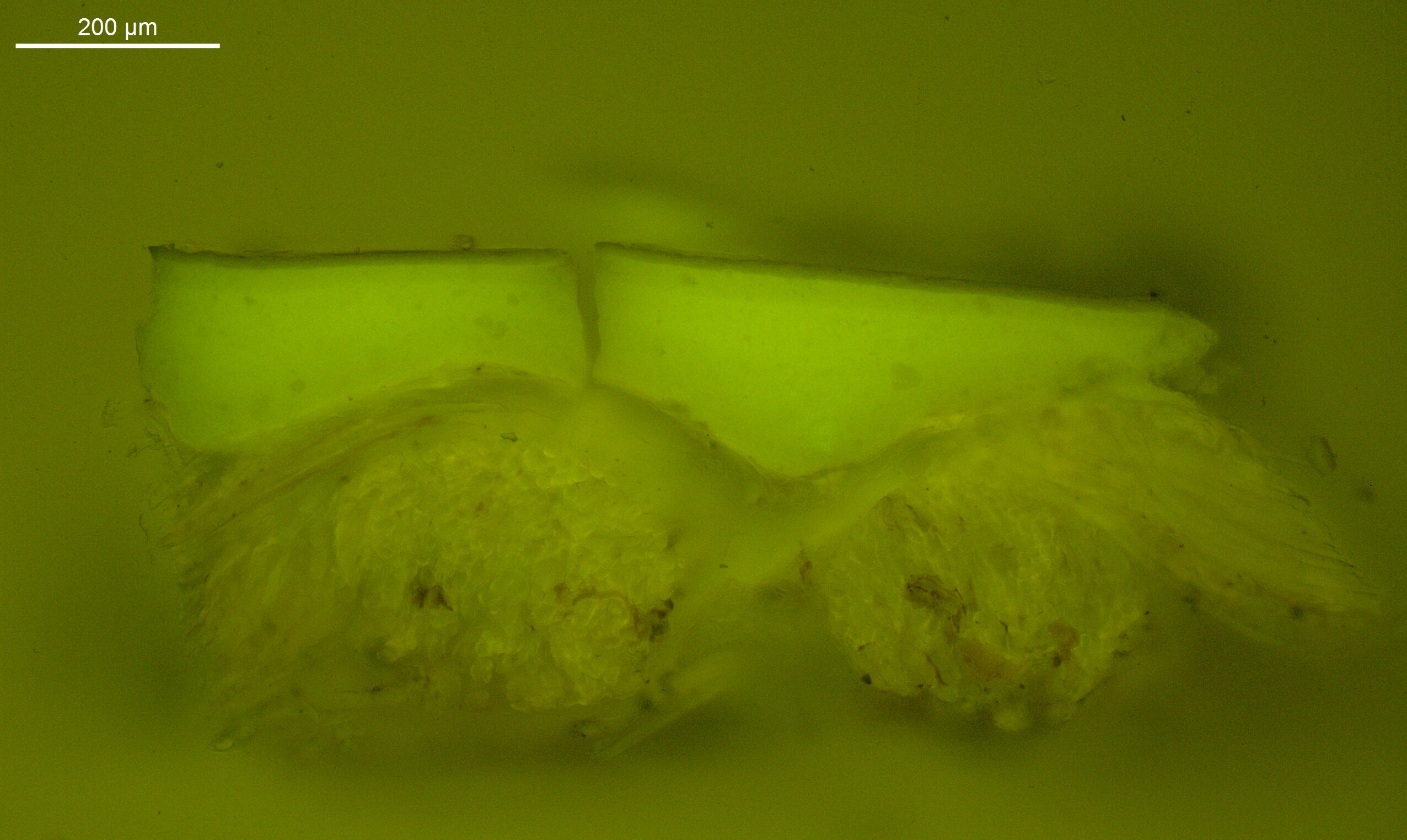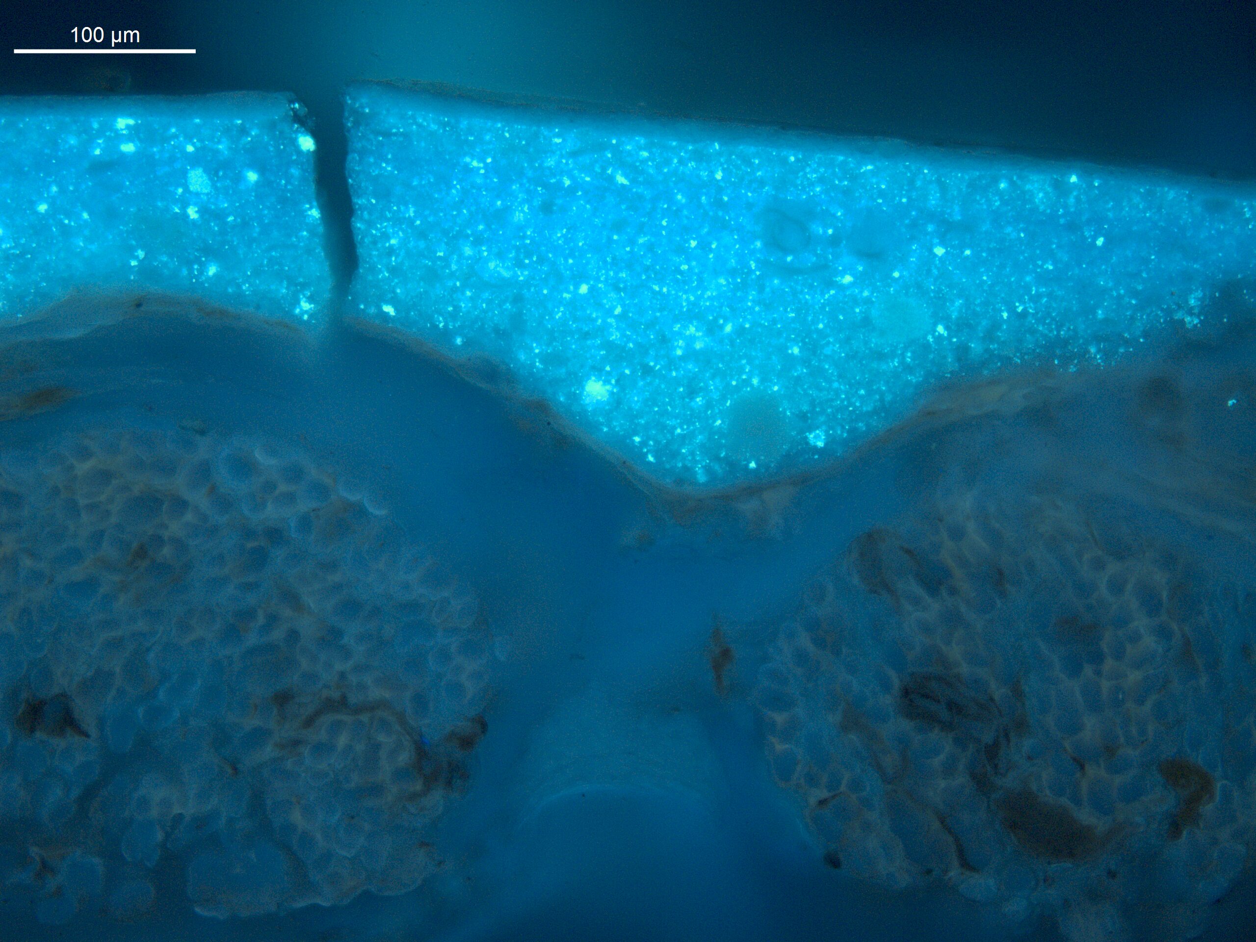Optical microscopy uses visible light and lenses to magnify and examine the surface and structure of a painting. When applied to cross sections of paint samples, it allows for detailed observation of a painting’s stratigraphy (layer structure) and pigment particles. It is often employed with various illumination techniques, such as dark field and UV fluorescence, to enhance the analysis. Layer number 1 in the results section below the images refers to the layer at the bottom of the cross section.