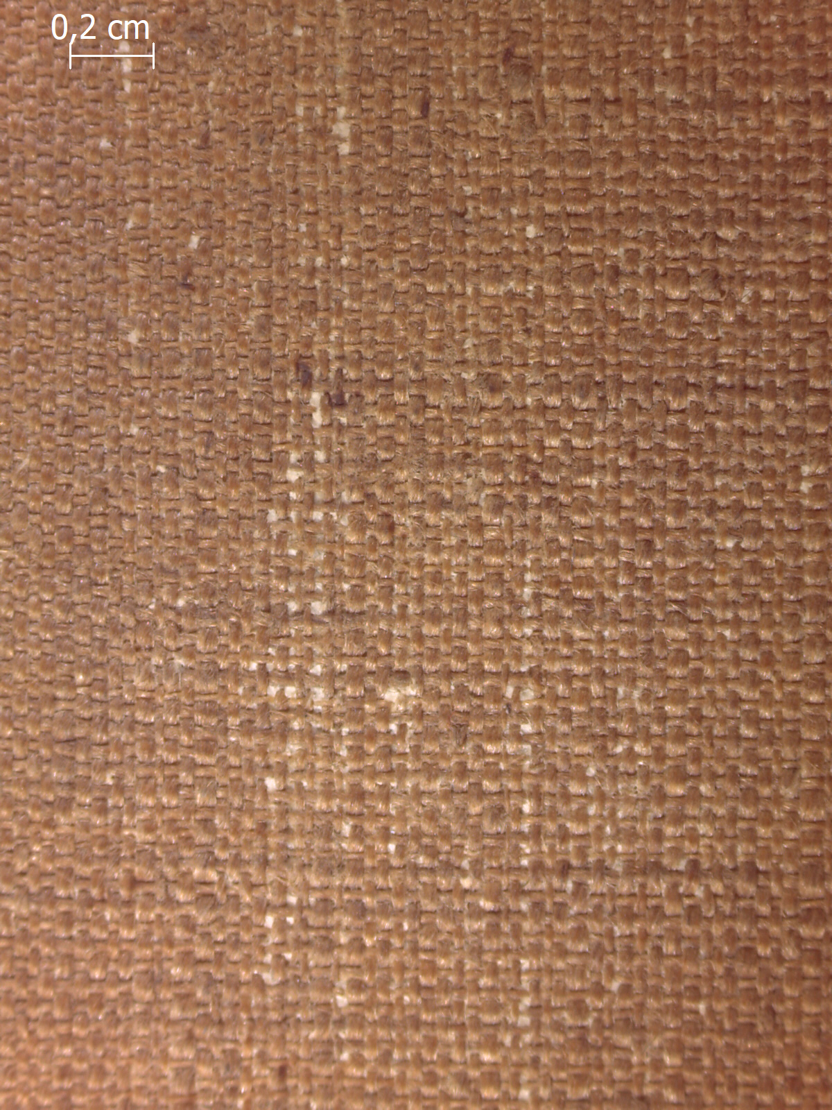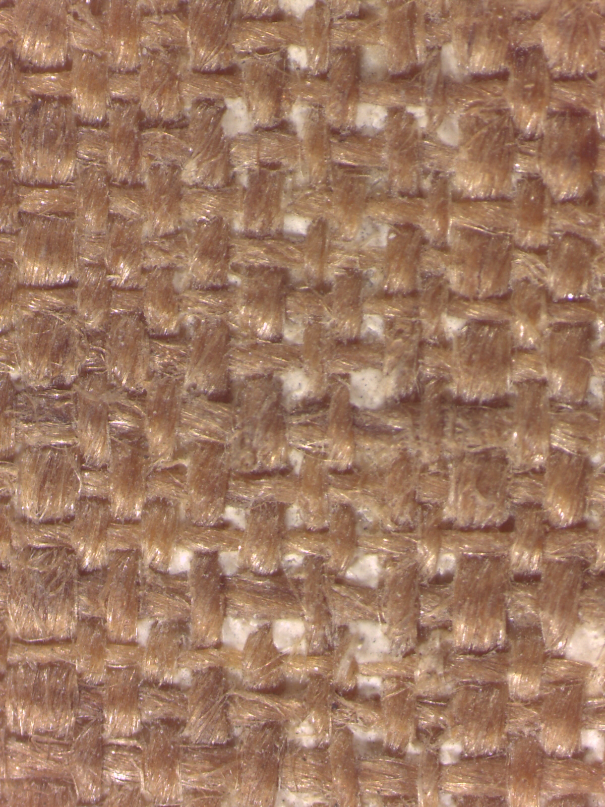 An industrial canvas with a slightly open weave. Fairly even, thin yarns with scattered small knots.