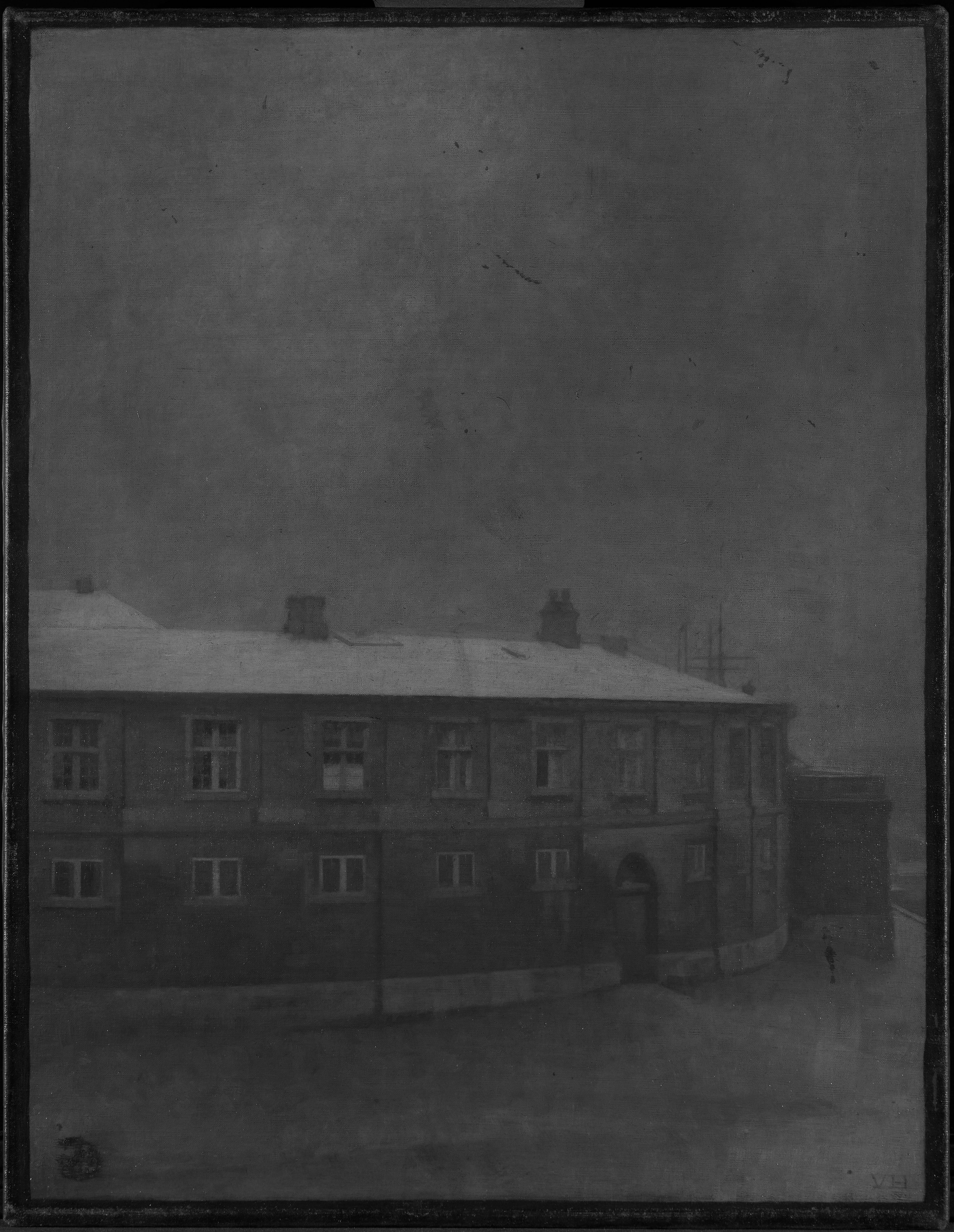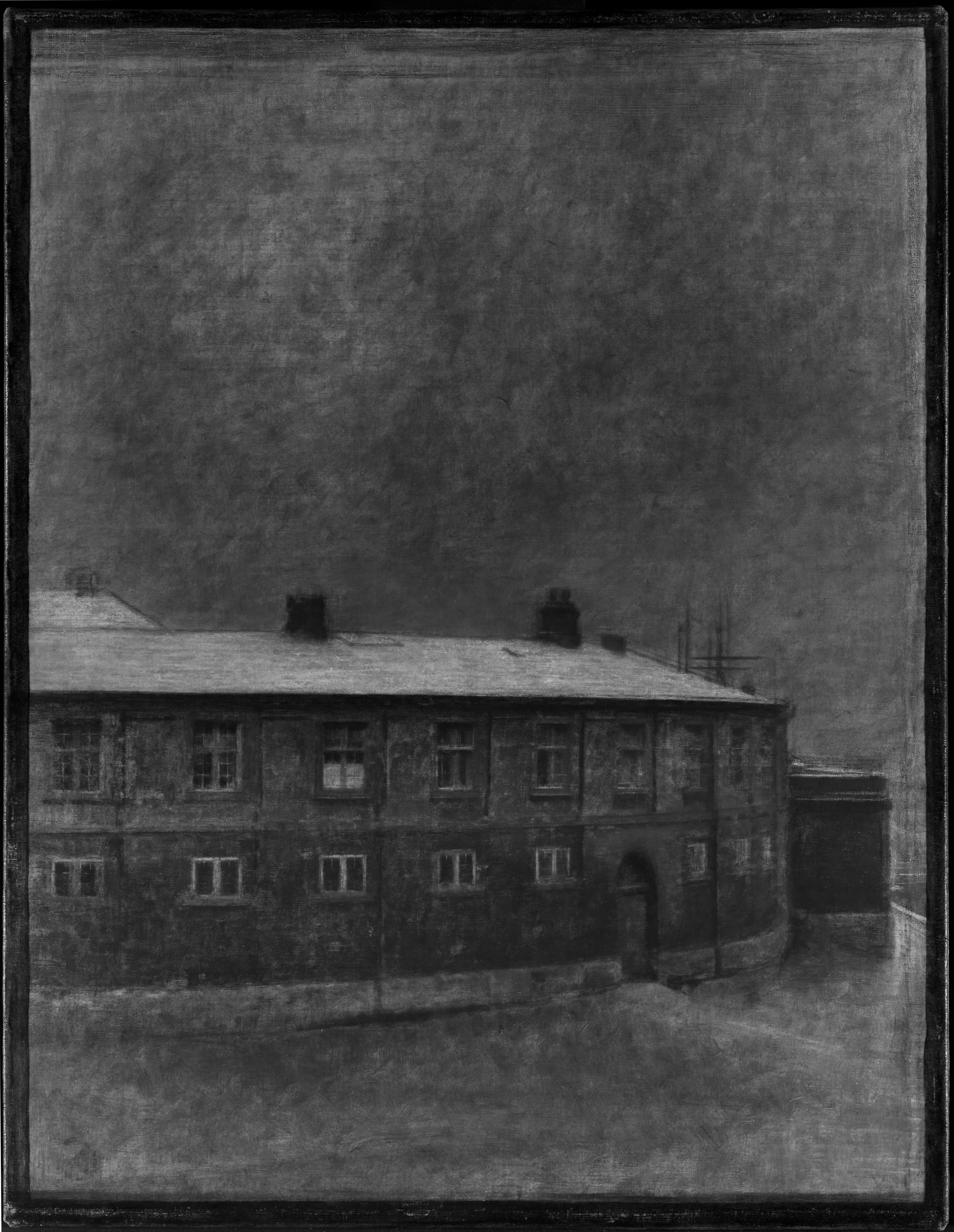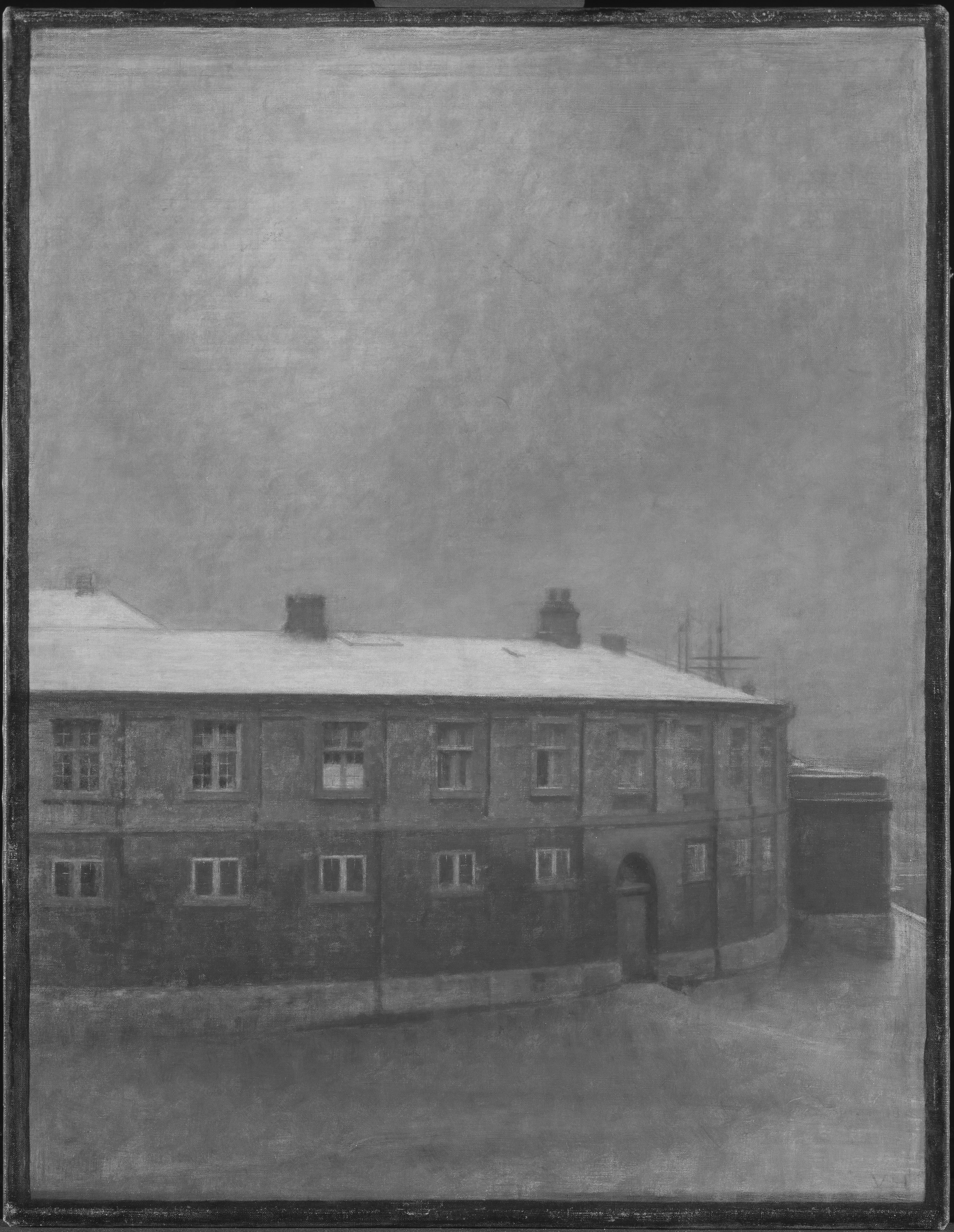 An initial application of a thinned, uneven dark to medium grey paint in the building and part of the foreground was followed by darker and paler, more opaque and bluish paint applied in scattered brush strokes, leaving the initial paint layer underneath exposed in many places. The pale sky was painted more densely and wet-in-wet, with blended brushstrokes. Darker areas in the sky were seemingly underpainted with a very thin layer of grey. Details such as window frames and bars are partly blurred and in some cases without much definition, but in other places created with white paint or by scratching in the wet paint, the latter method exploiting the colour of the ground. There is no predominant direction of the brush strokes except in the snow-covered roof where the main direction is horizontal.