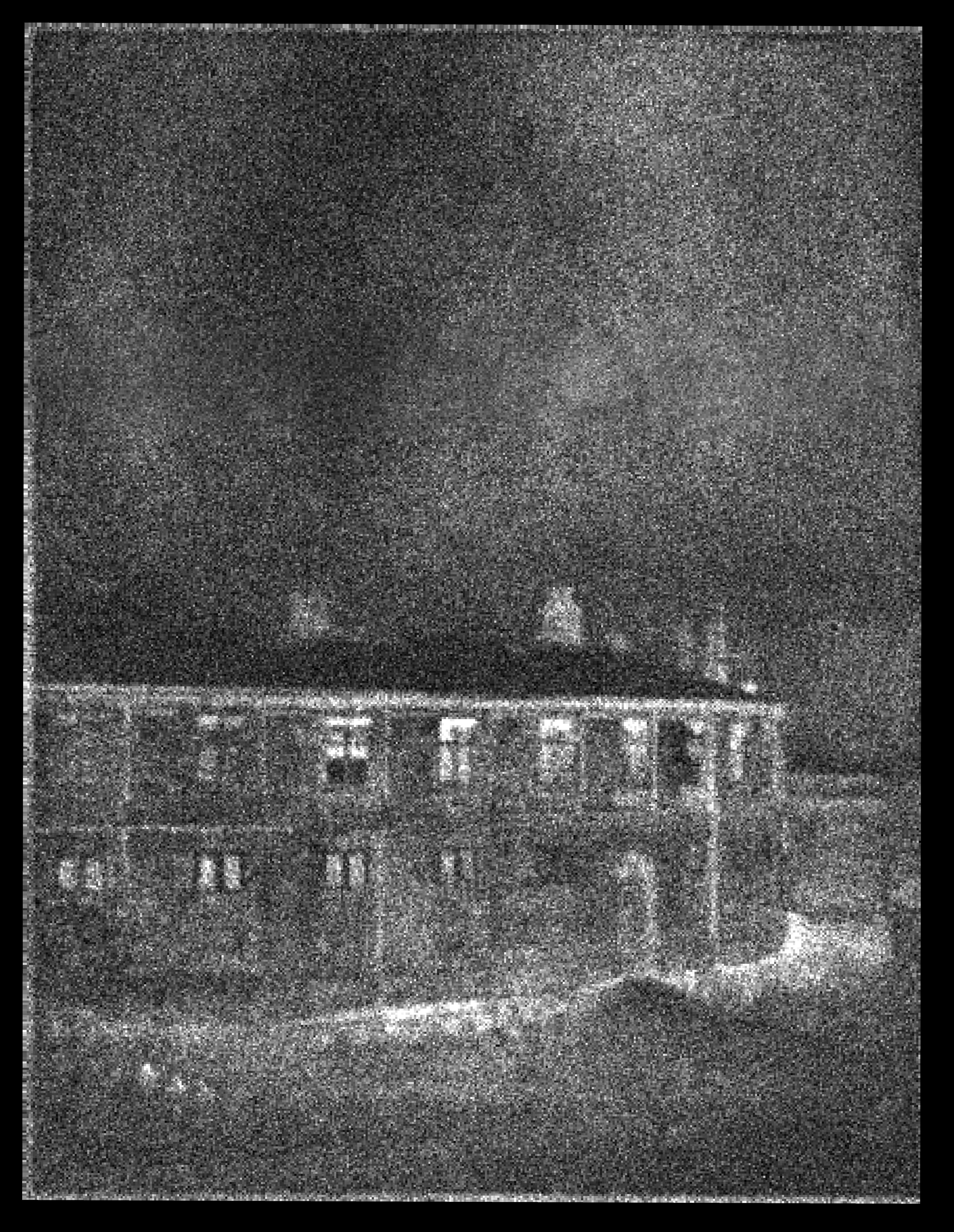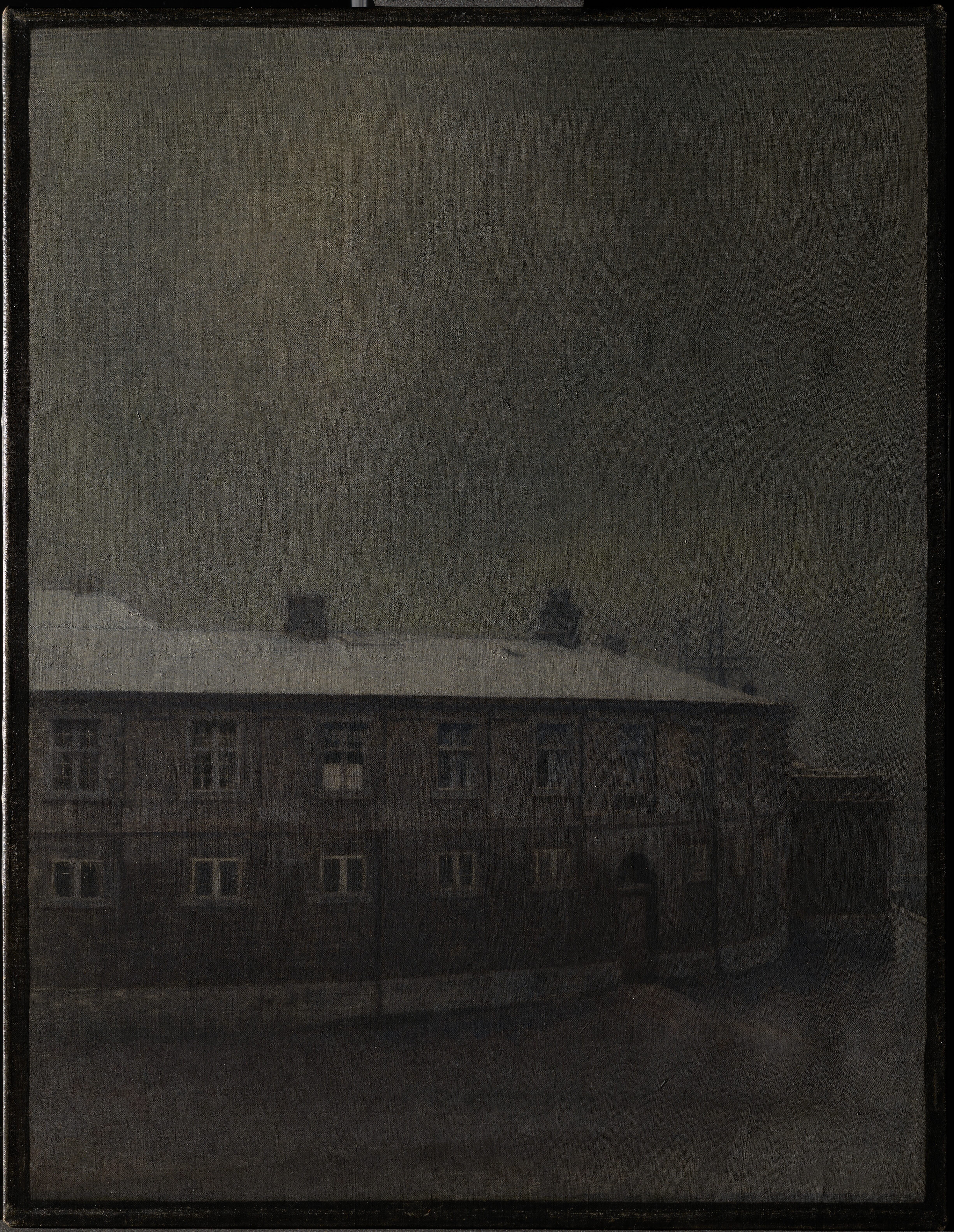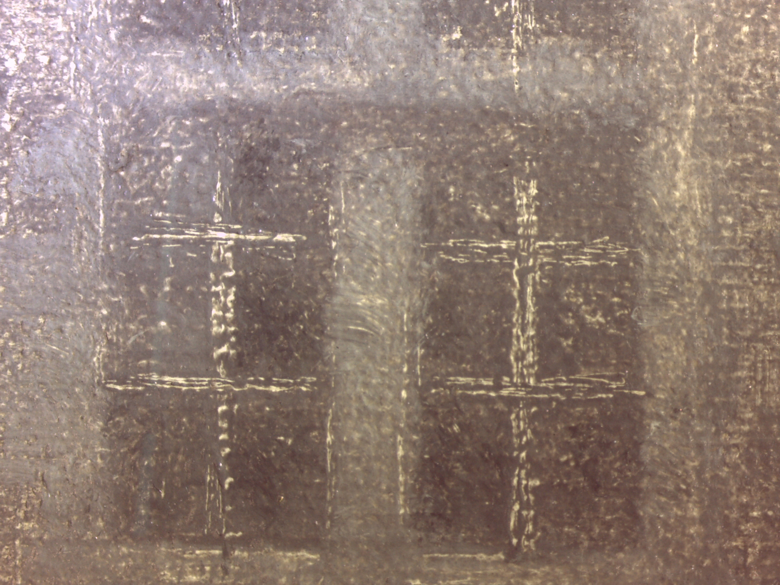 An initial application of a thinned, uneven dark to medium grey paint in the building and part of the foreground was followed by darker and paler, more opaque and bluish paint applied in scattered brush strokes, leaving the initial paint layer underneath exposed in many places. The pale sky was painted more densely and wet-in-wet, with blended brushstrokes. Darker areas in the sky were seemingly underpainted with a very thin layer of grey. Details such as window frames and bars are partly blurred and in some cases without much definition, but in other places created with white paint or by scratching in the wet paint, the latter method exploiting the colour of the ground. There is no predominant direction of the brush strokes except in the snow-covered roof where the main direction is horizontal.