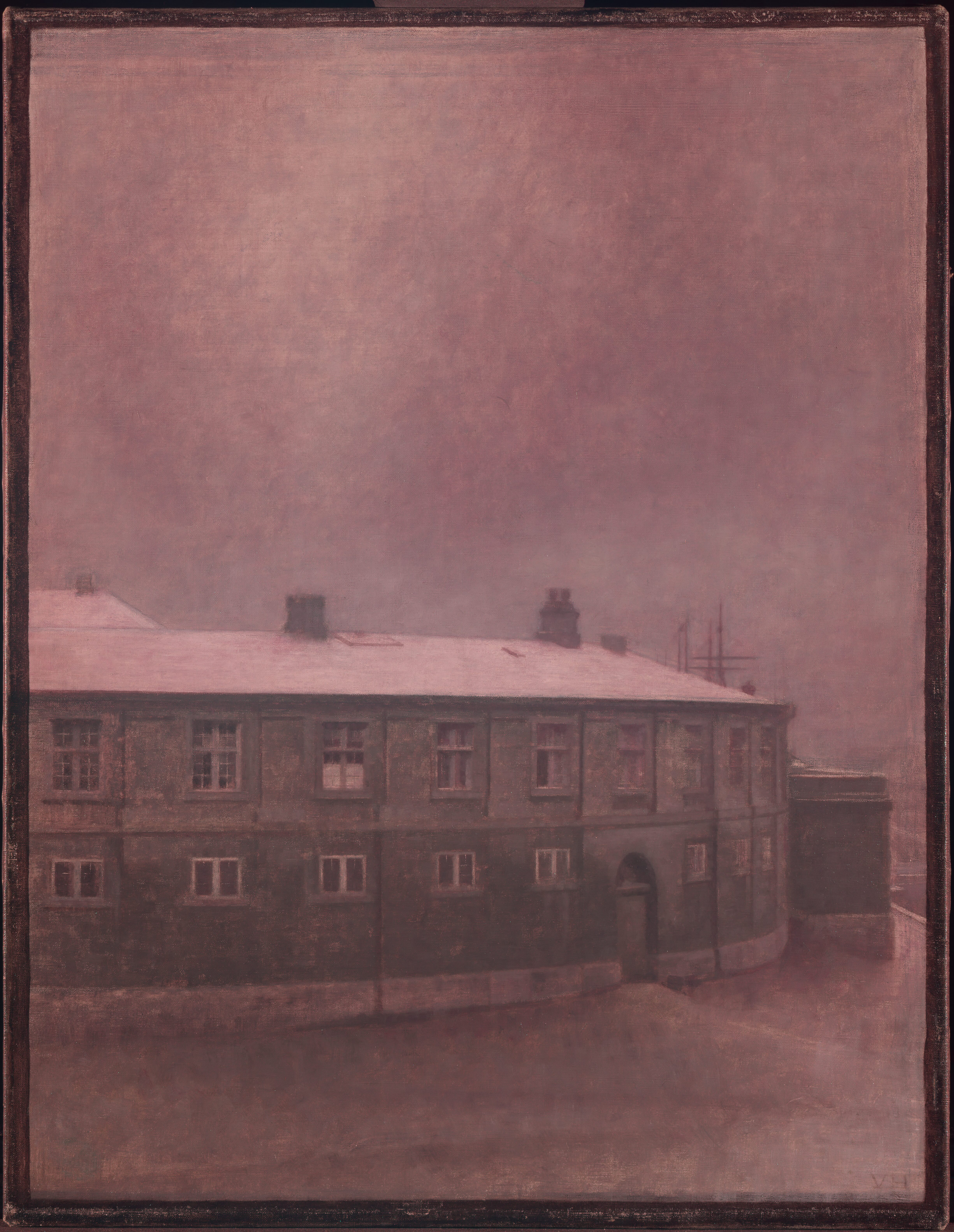 (Transl.): FROM THE OLD CHRISTIANSBORG. The stables. The bend with the gate to the stables. Thin coat of snow on the roof, above which mastheads are seen dimly. Snow air.