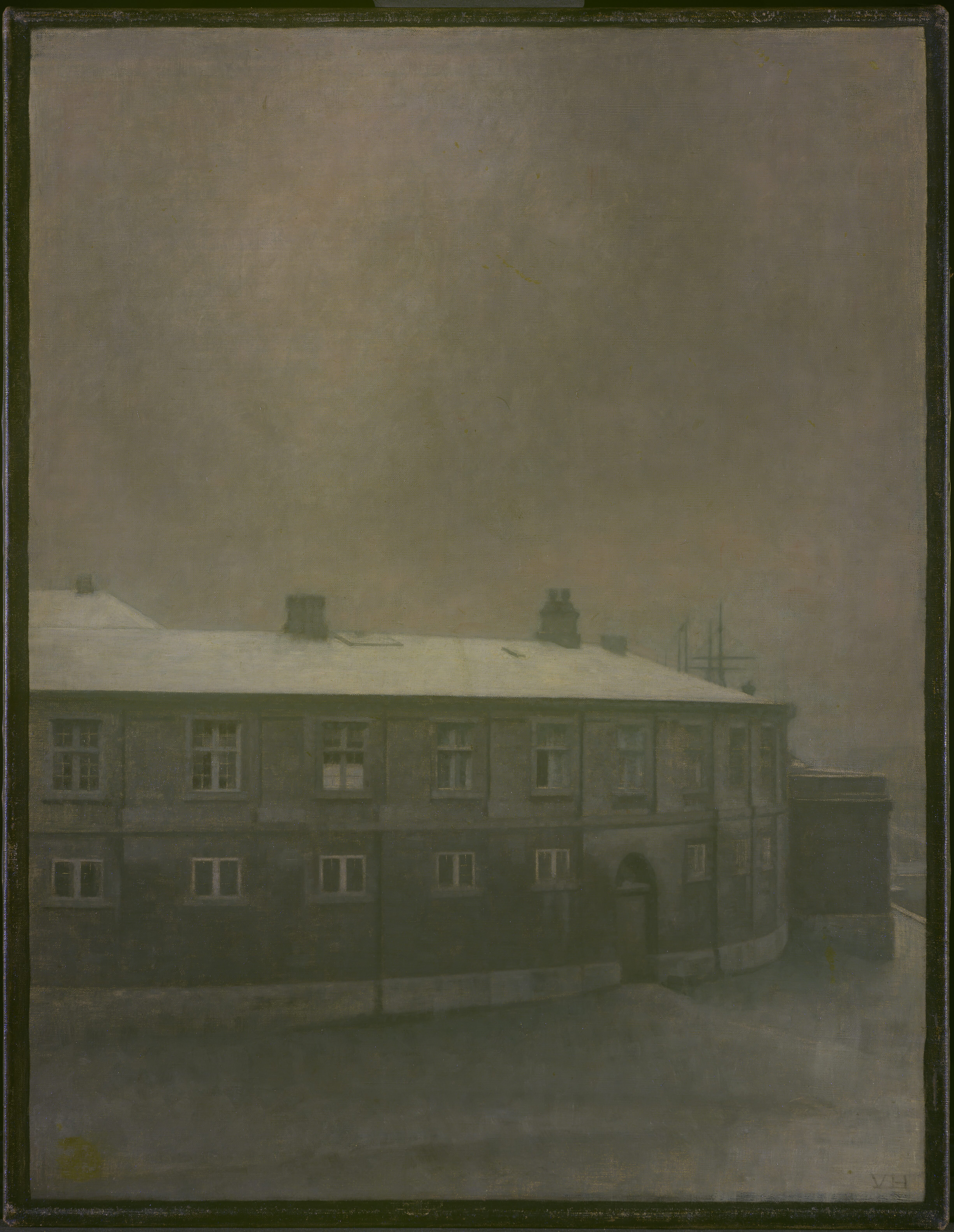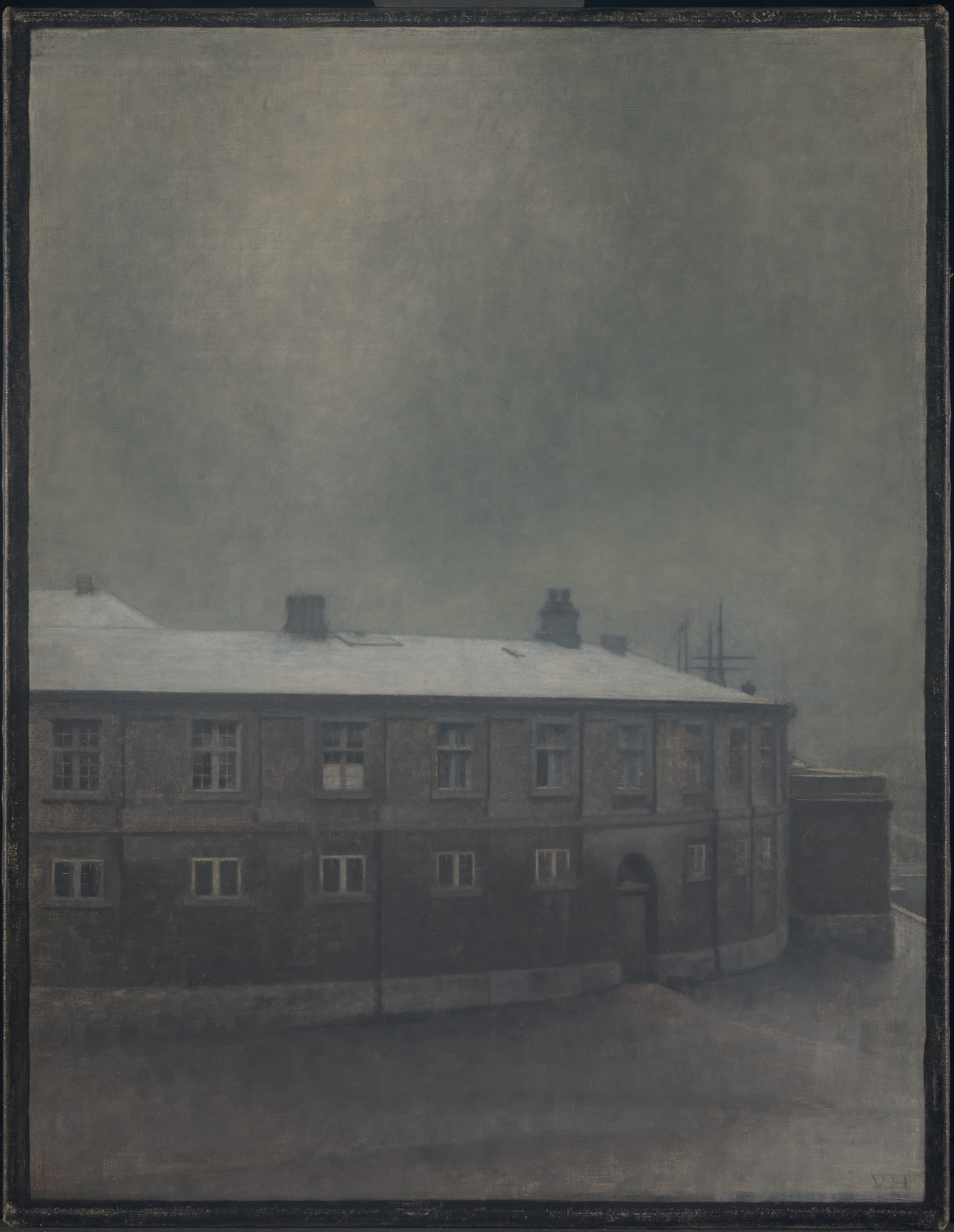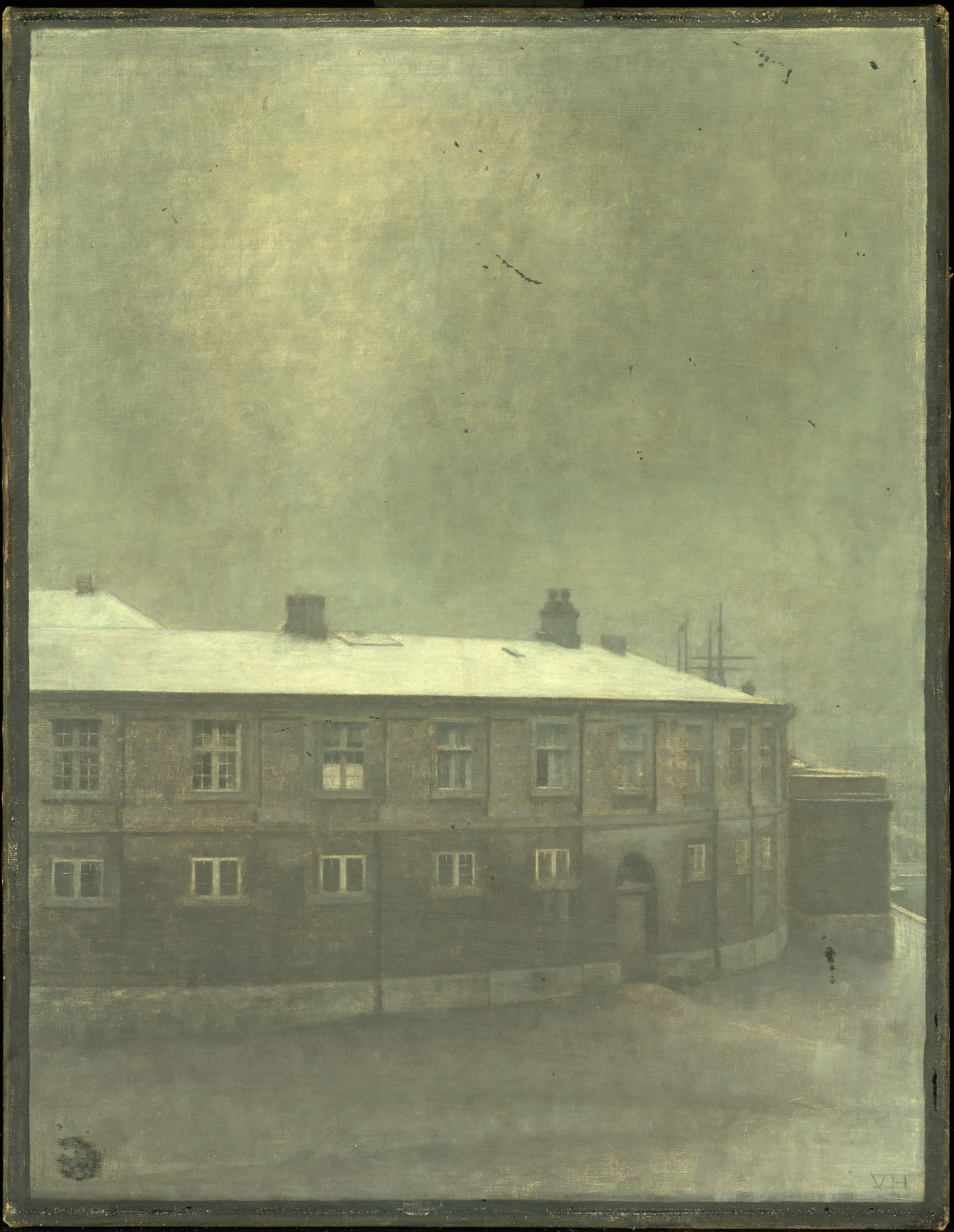 This especially selected view of the old Christiansborg Palace was probably painted from art collector and dentist Alfred Bramsens apartment at the corner of Stormgade in Copenhagen. Hammershøi examines the special weather conditions in the painting in this case the snowy air.