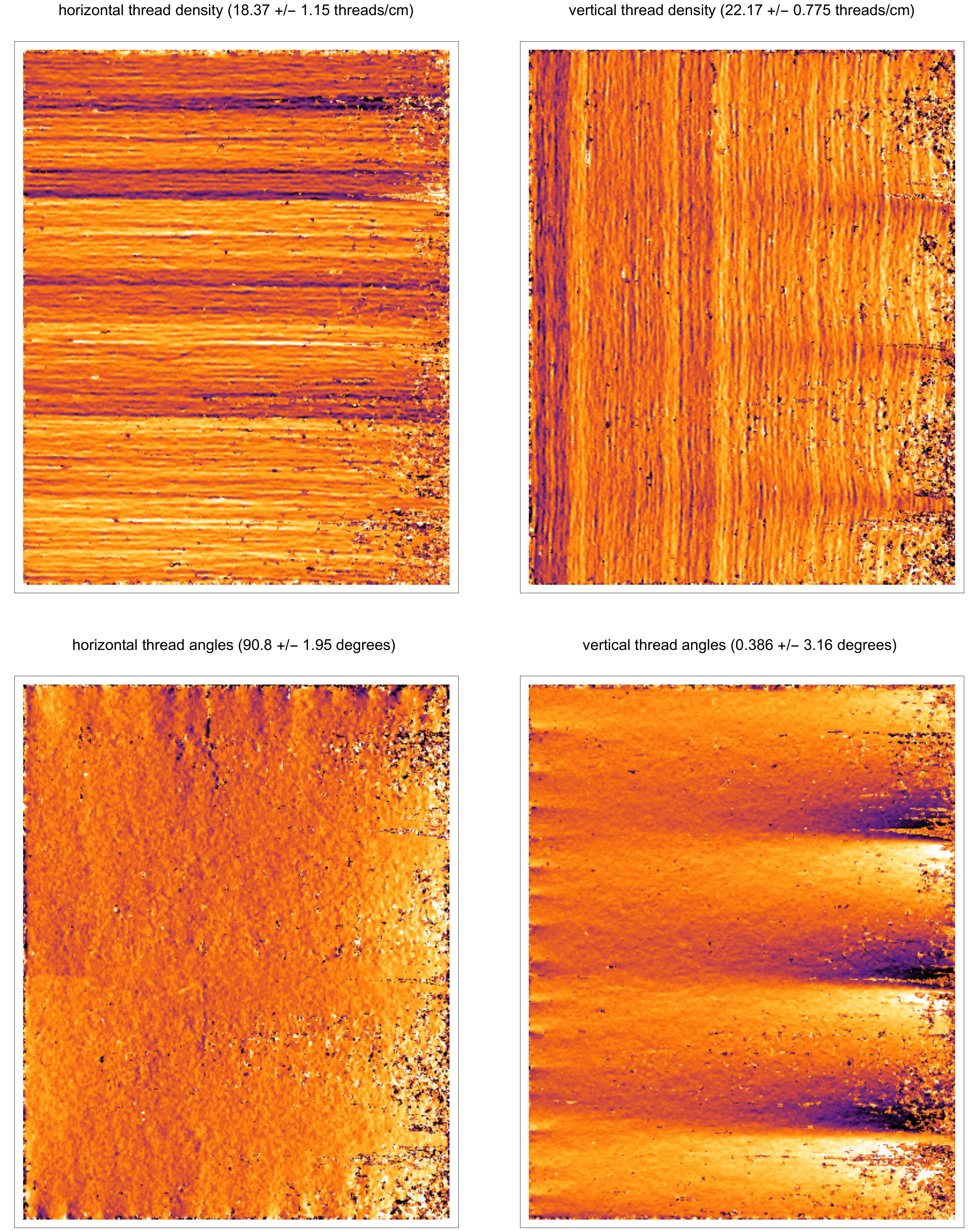 Weave maps are detailed visualisations of the thread patterns in a canvas, created by applying thread counting on high-resolution x-radiographs. These are used for analysing the structure of the canvas and to compare canvases used in different paintings. A comparison between weave maps can sometimes determine if two or more pieces of canvas derive from the same batch and thereby shed light on the place and period in which a painting has been created.