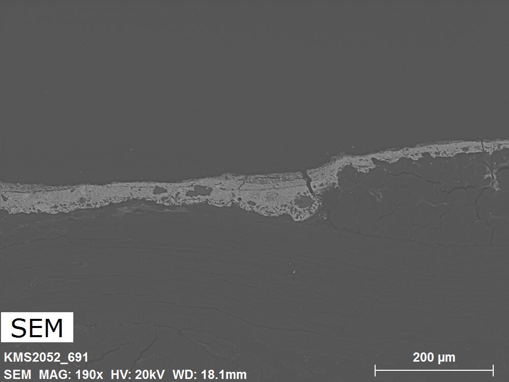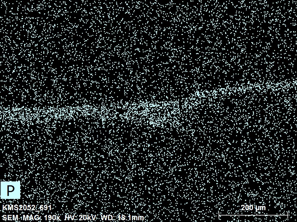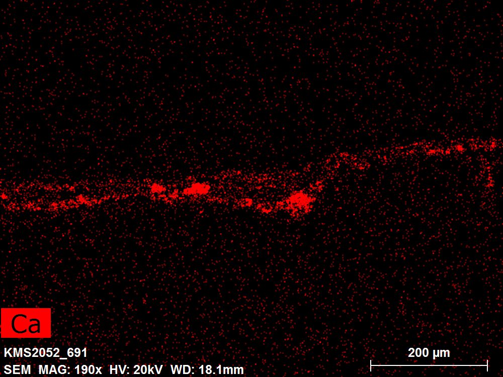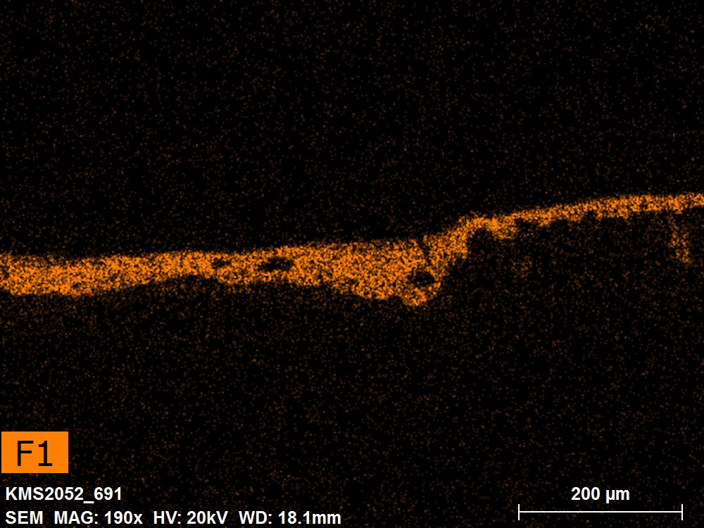 SEM-EDXS is a technique that provides highly detailed images at the microscopic level while simultaneously identifying the elemental composition of a sample. It is particularly valuable for studying the stratigraphy of paint cross sections at very fine scales, for the chemical characterisation of pigments, fillers and degradation products, and for detecting trace elements that may indicate very specific materials. Below, the elements listed in parentheses refer to minor elements whose relative abundance is below 10% of the total signal. The F1 map below represents the Pb M line. Read more under SEM-EDXS in the glossary.