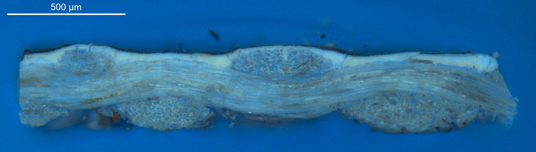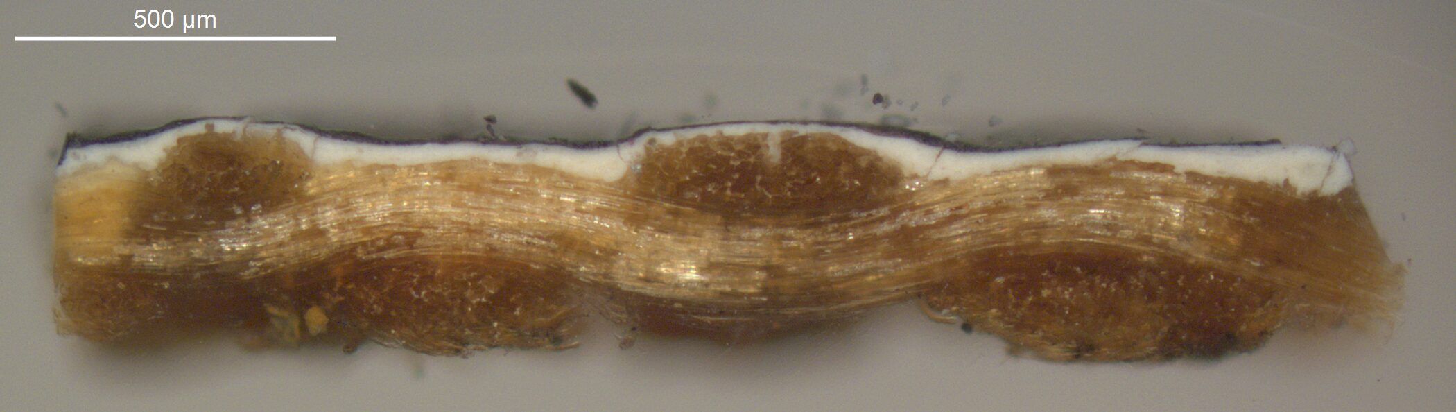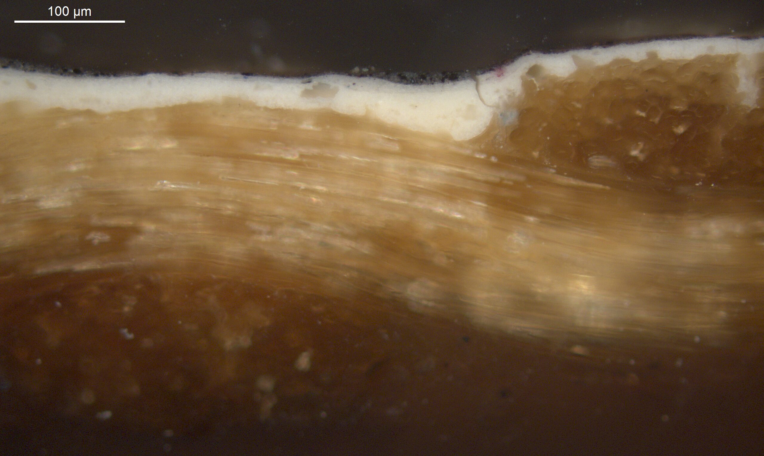 Optical microscopy uses visible light and lenses to magnify and examine the surface and structure of a painting. When applied to cross sections of paint samples, it allows for detailed observation of a painting’s stratigraphy (layer structure) and pigment particles. It is often employed with various illumination techniques, such as dark field and UV fluorescence, to enhance the analysis. Layer number 1 in the results section below the images refers to the layer at the bottom of the cross section.