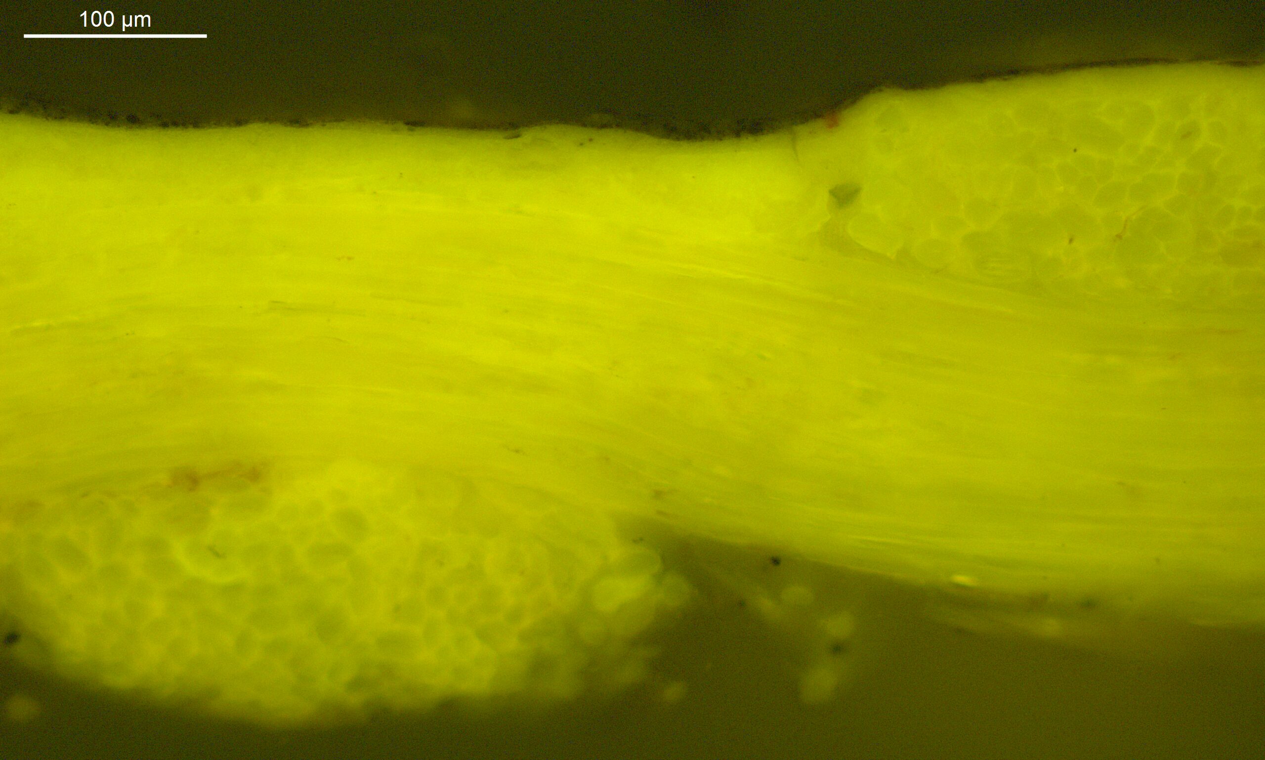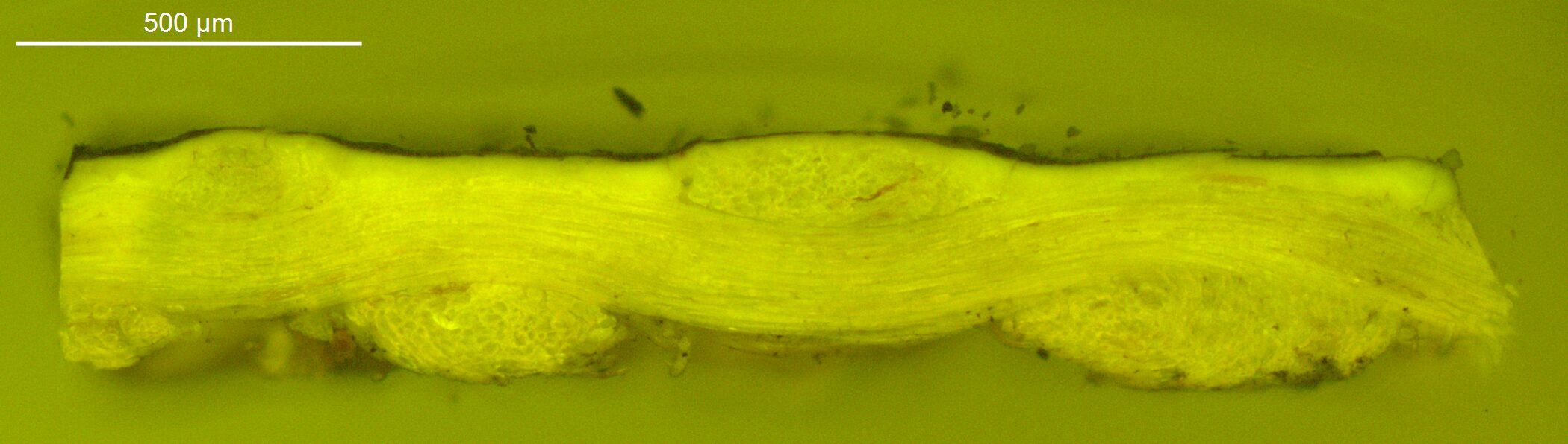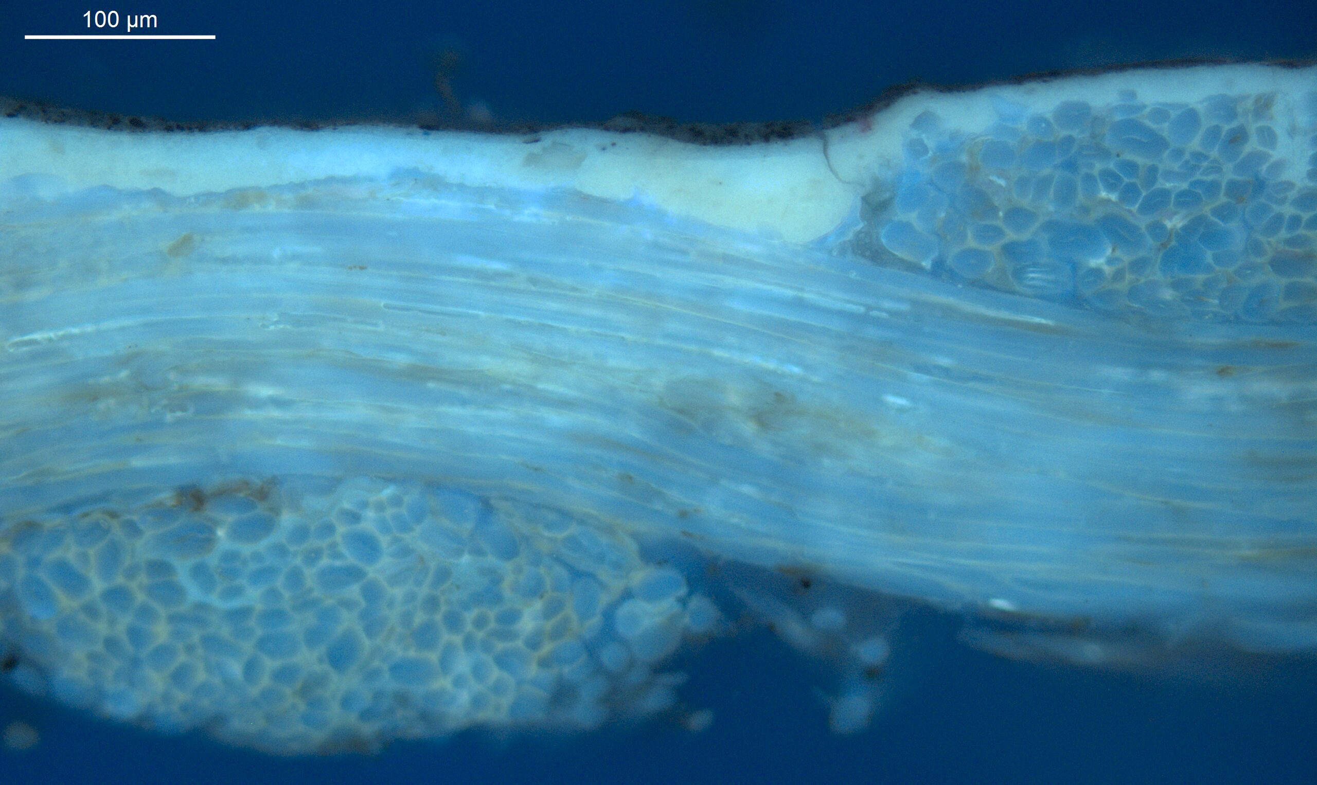 Optical microscopy uses visible light and lenses to magnify and examine the surface and structure of a painting. When applied to cross sections of paint samples, it allows for detailed observation of a painting’s stratigraphy (layer structure) and pigment particles. It is often employed with various illumination techniques, such as dark field and UV fluorescence, to enhance the analysis. Layer number 1 in the results section below the images refers to the layer at the bottom of the cross section.
