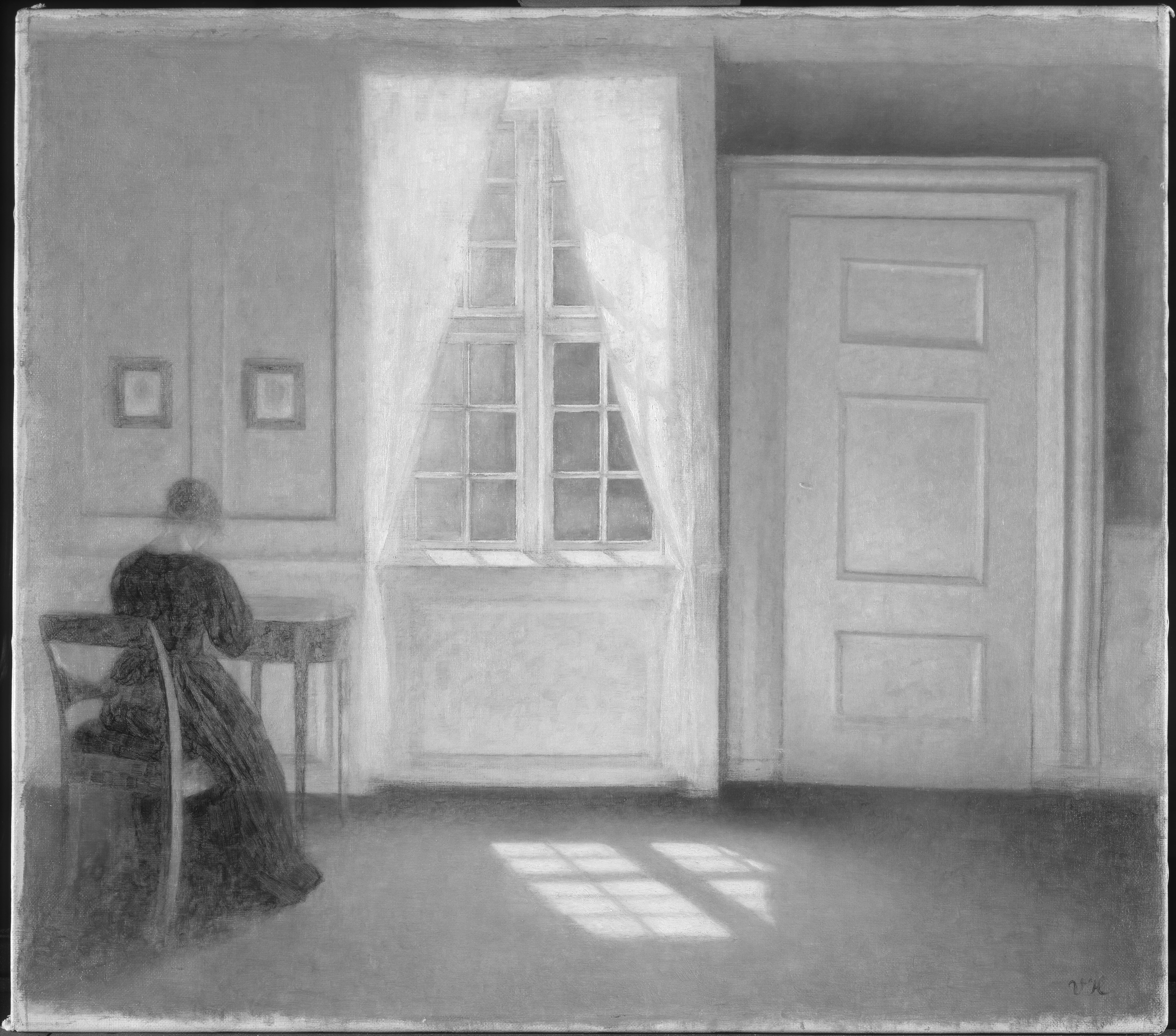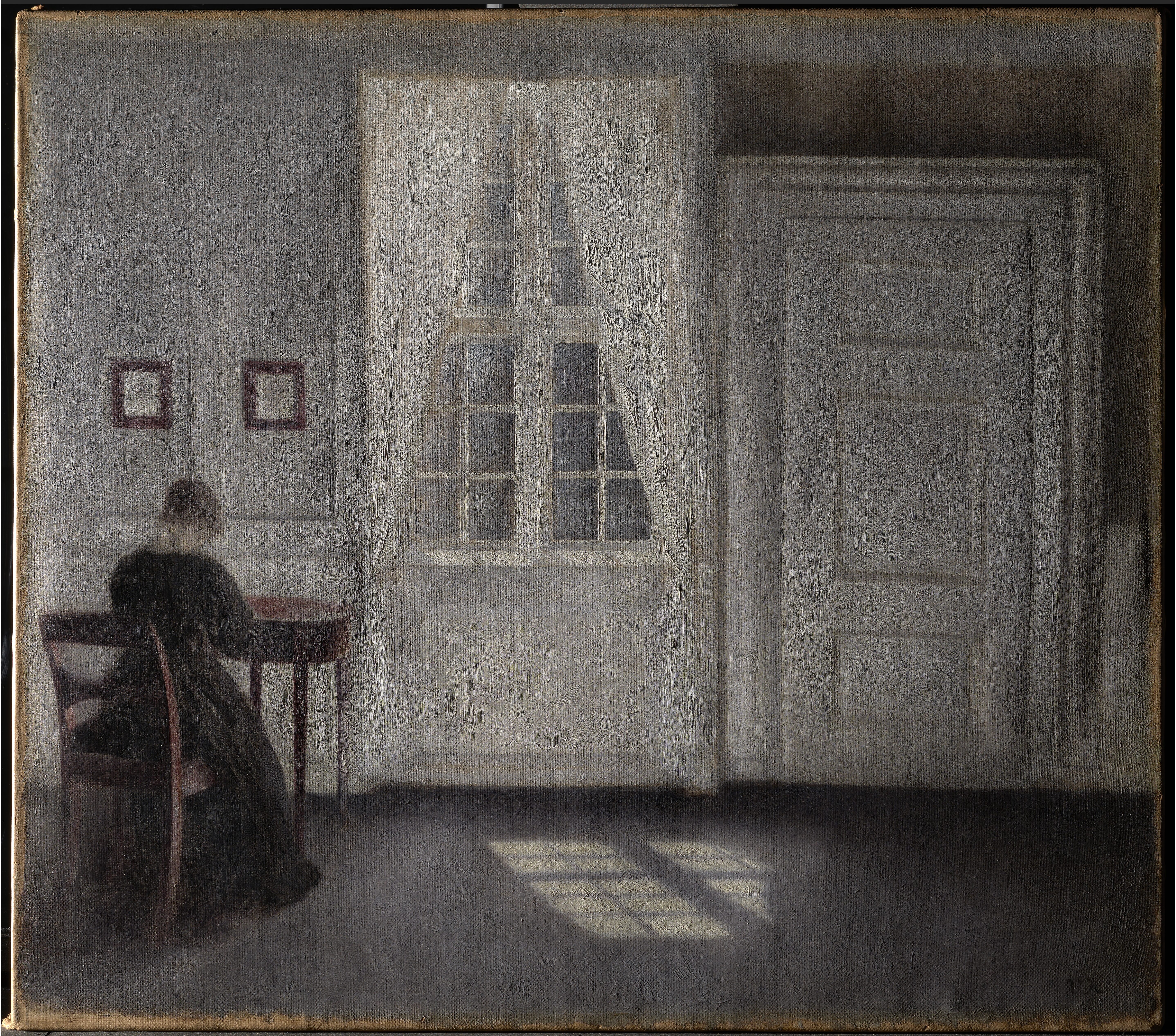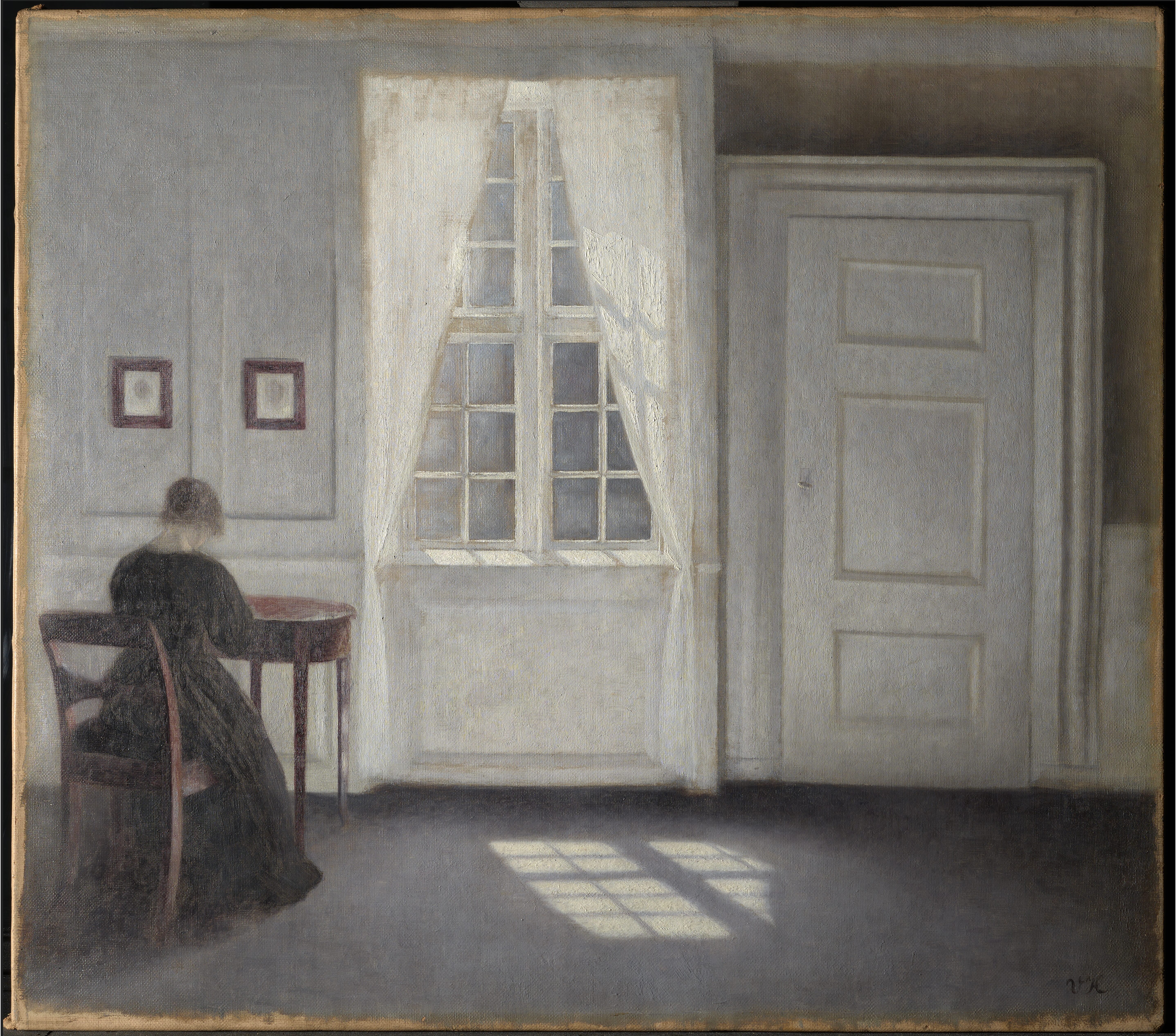 The room is facing the inner courtyard of the old building, and it seems as if Hammershøi for a while preferred this as his favourite painting spot. He made several frontal compositions as the present, with a curated selection of figure and furniture seen against the wall, the window and the door and painted the spot at different times of the day. Most likely, Ida posed as the woman seen from the back. Cf. Hvidt and Oelsner, 2018. p.257-261.