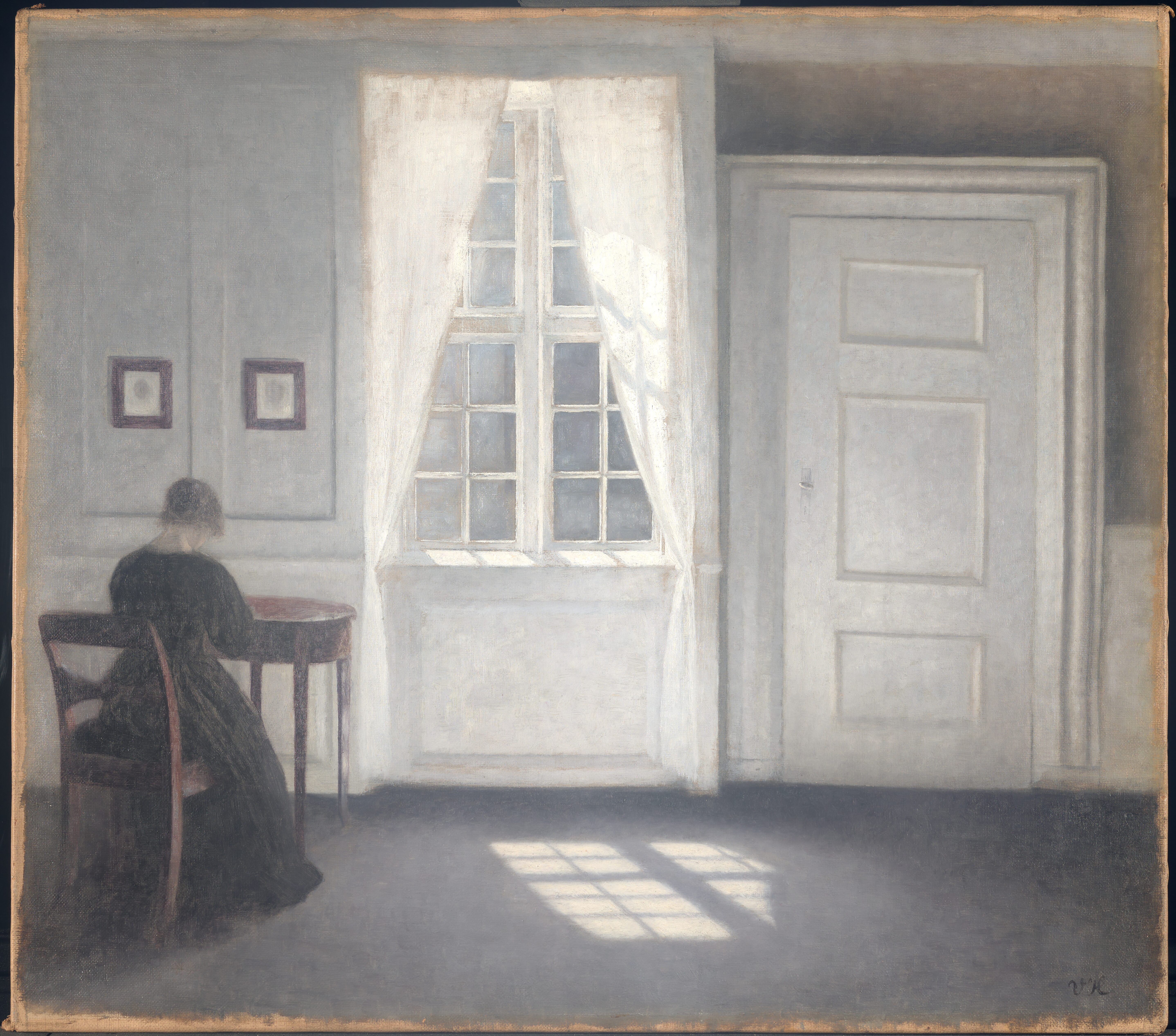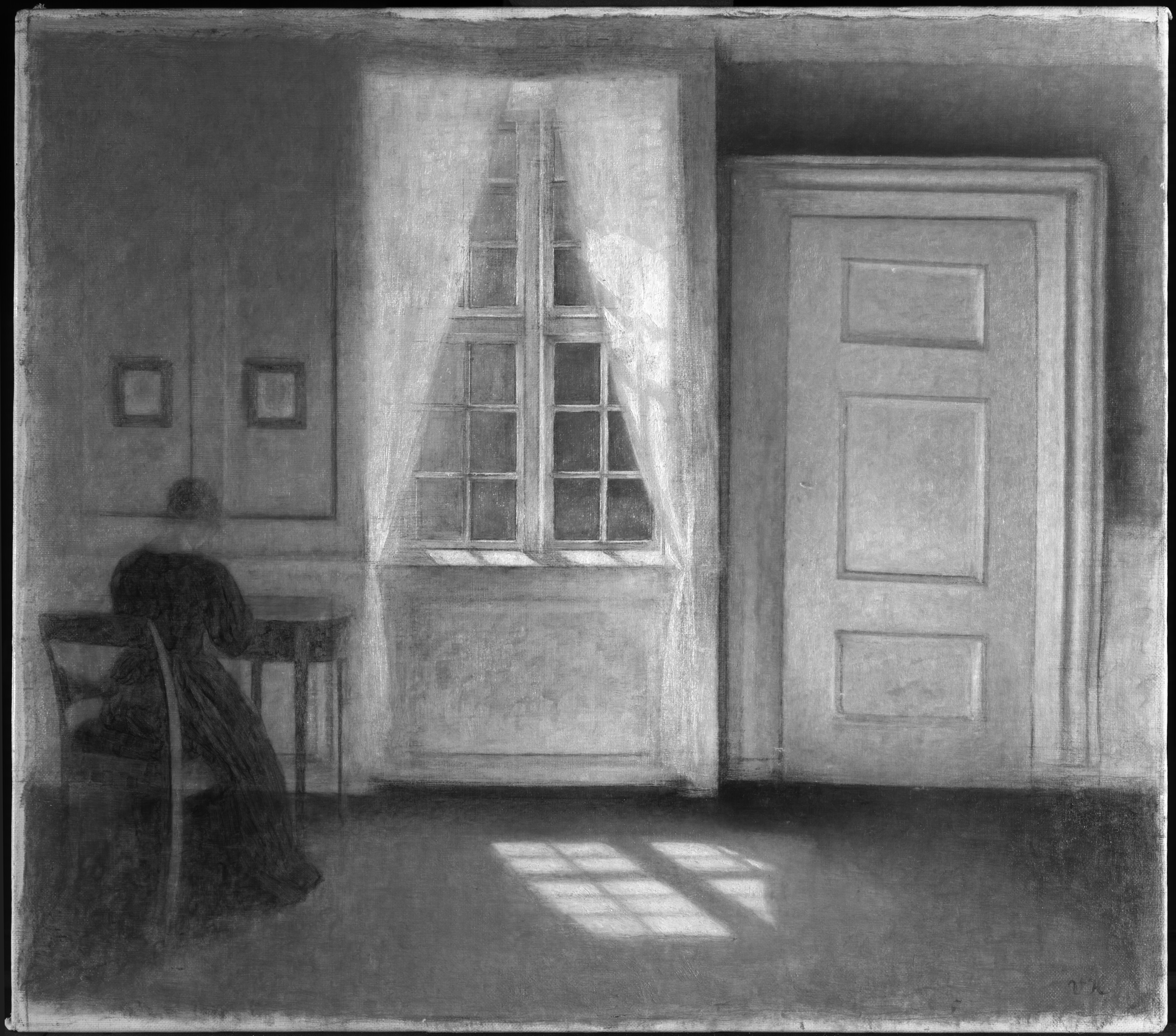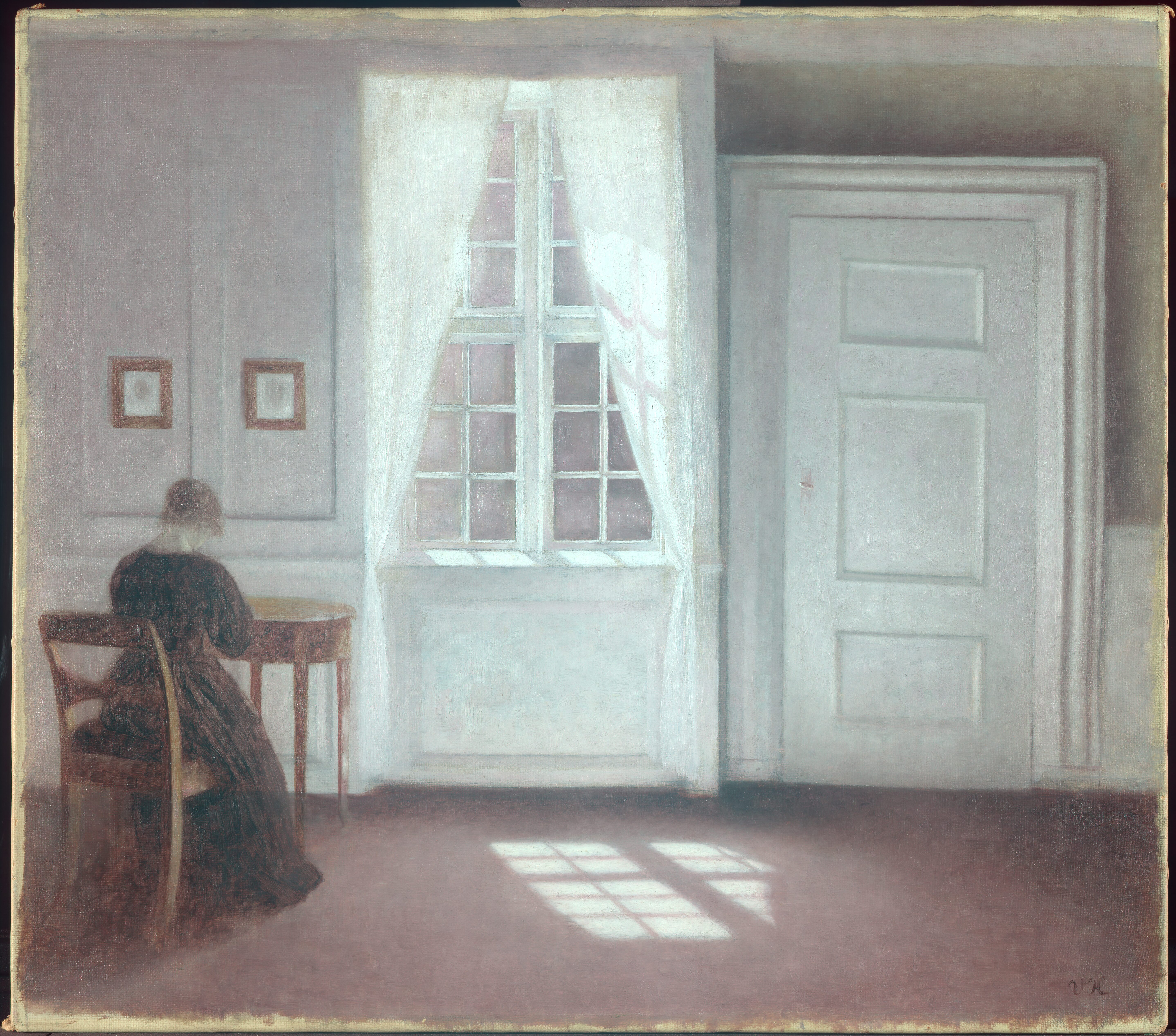 The room is facing the inner courtyard of the old building, and it seems as if Hammershøi for a while preferred this as his favourite painting spot. He made several frontal compositions as the present, with a curated selection of figure and furniture seen against the wall, the window and the door and painted the spot at different times of the day. Most likely, Ida posed as the woman seen from the back. Cf. Hvidt and Oelsner, 2018. p.257-261.