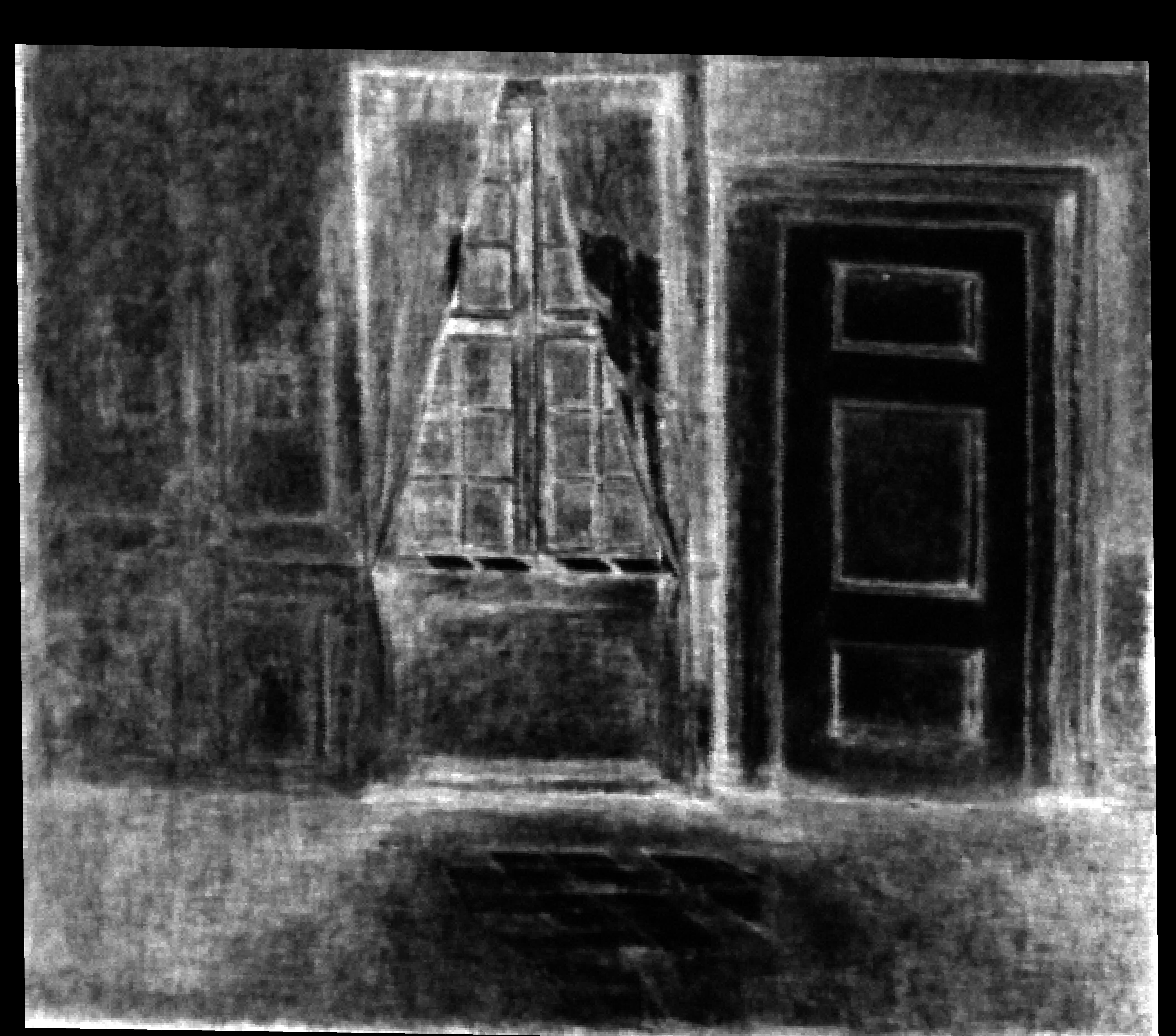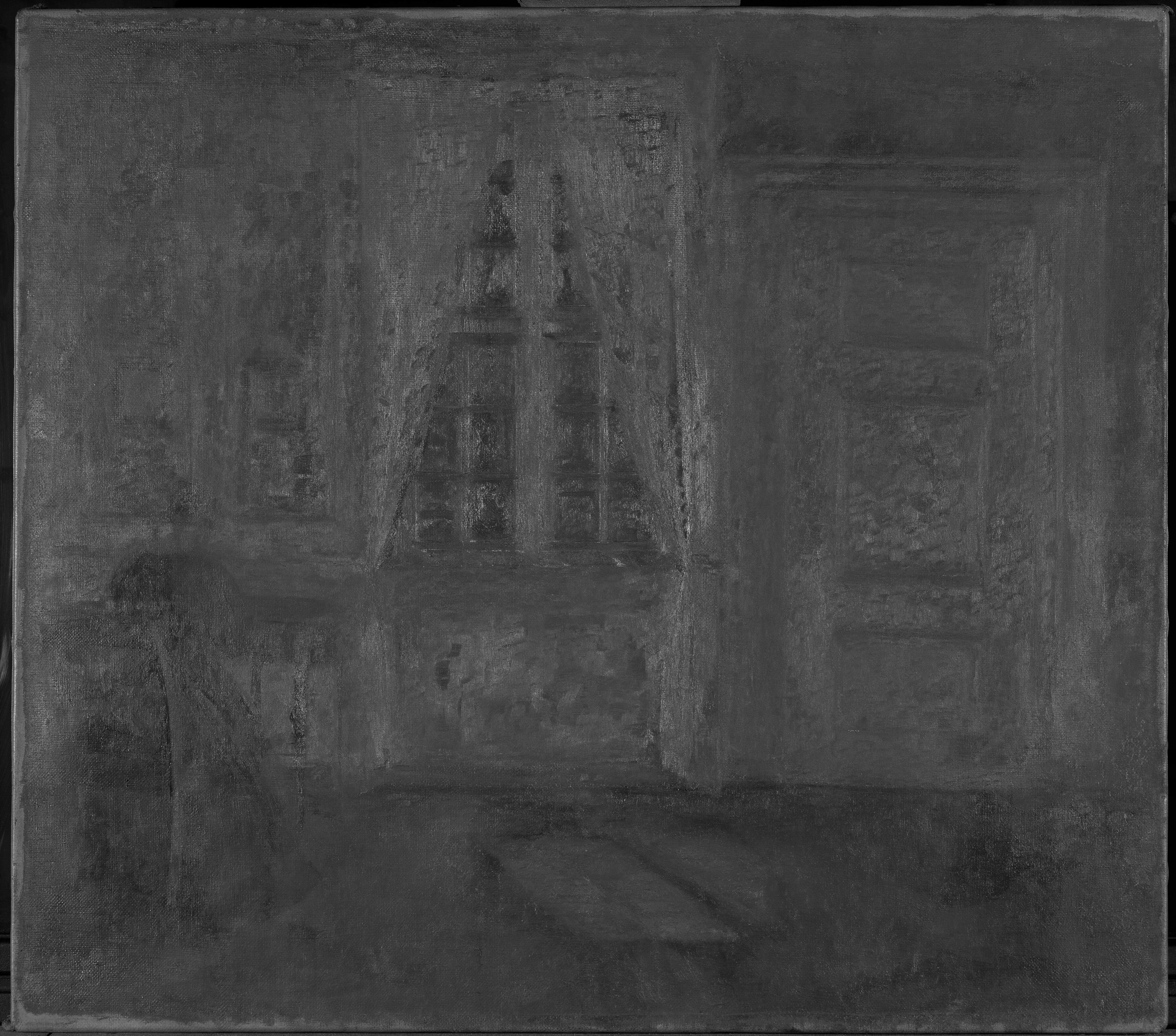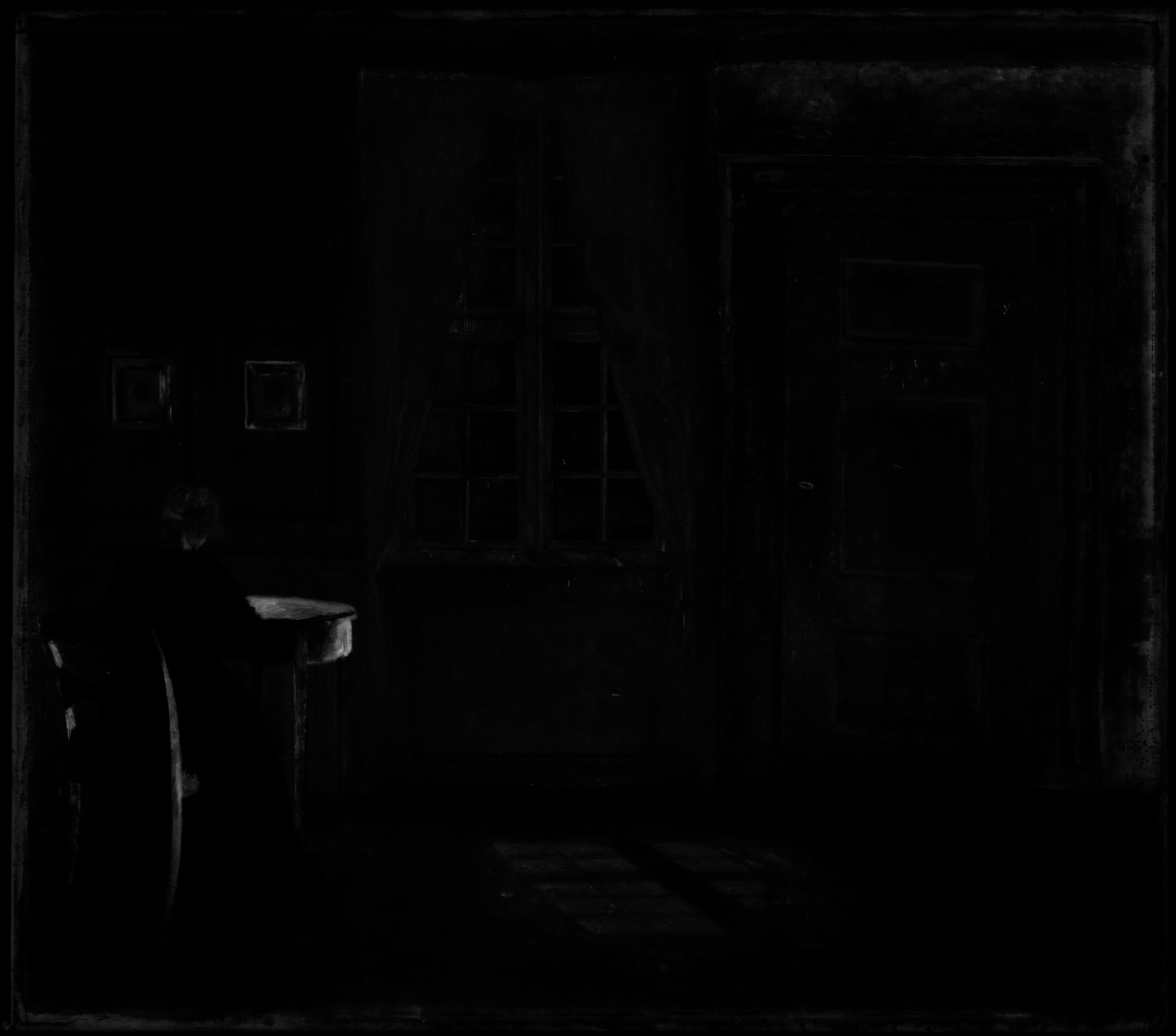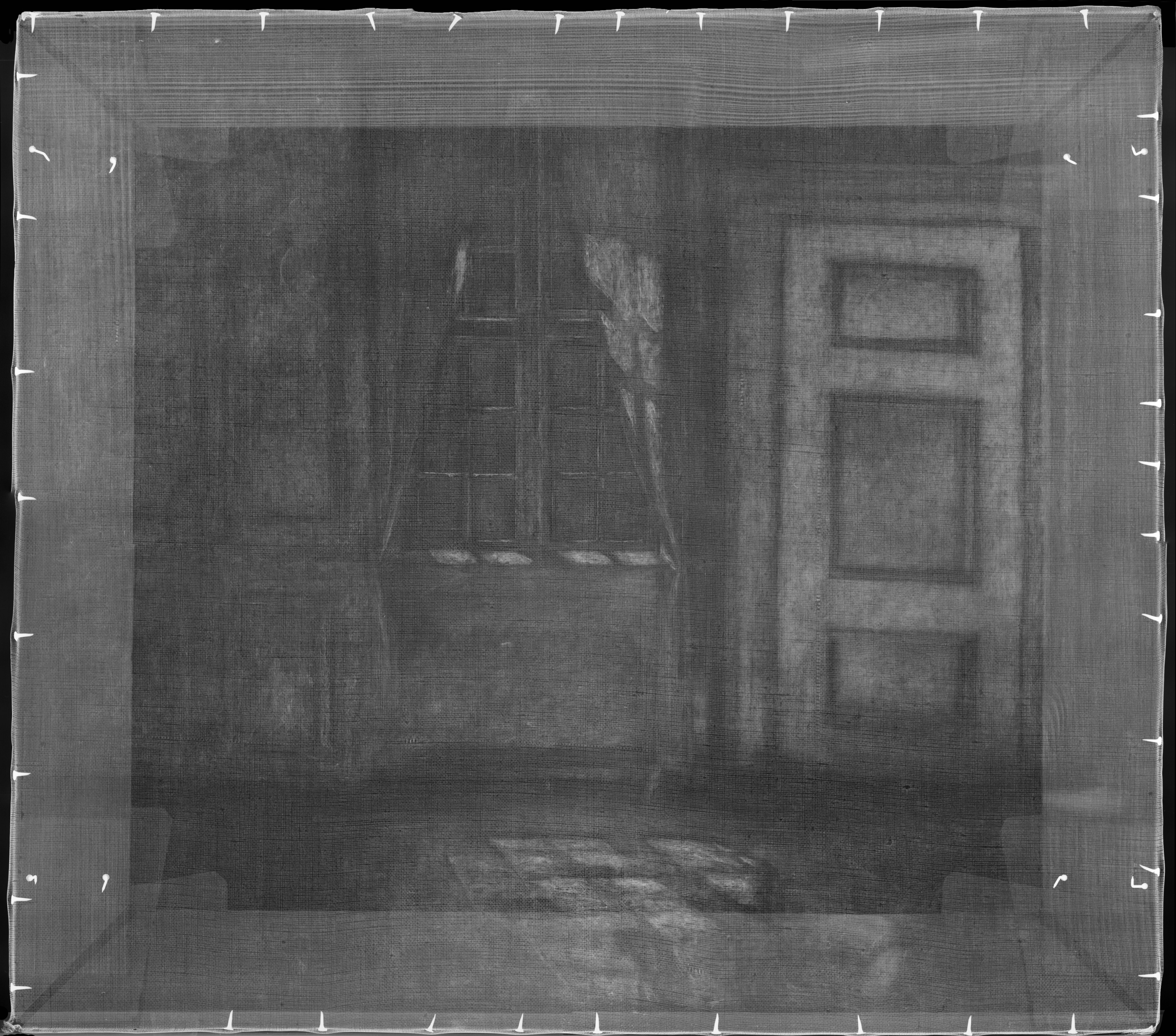 The ground layer is a preparatory layer applied directly to the support to create a smooth surface for painting. It is typically opaque and monochrome in color, providing a neutral base that influences the subsequent application of paint layers and the final appearance of the painting. The composition of the ground layer varies depending on the type of support and the historical period of the artwork. Hammershøi typically painted on white and industrially primed canvasses.