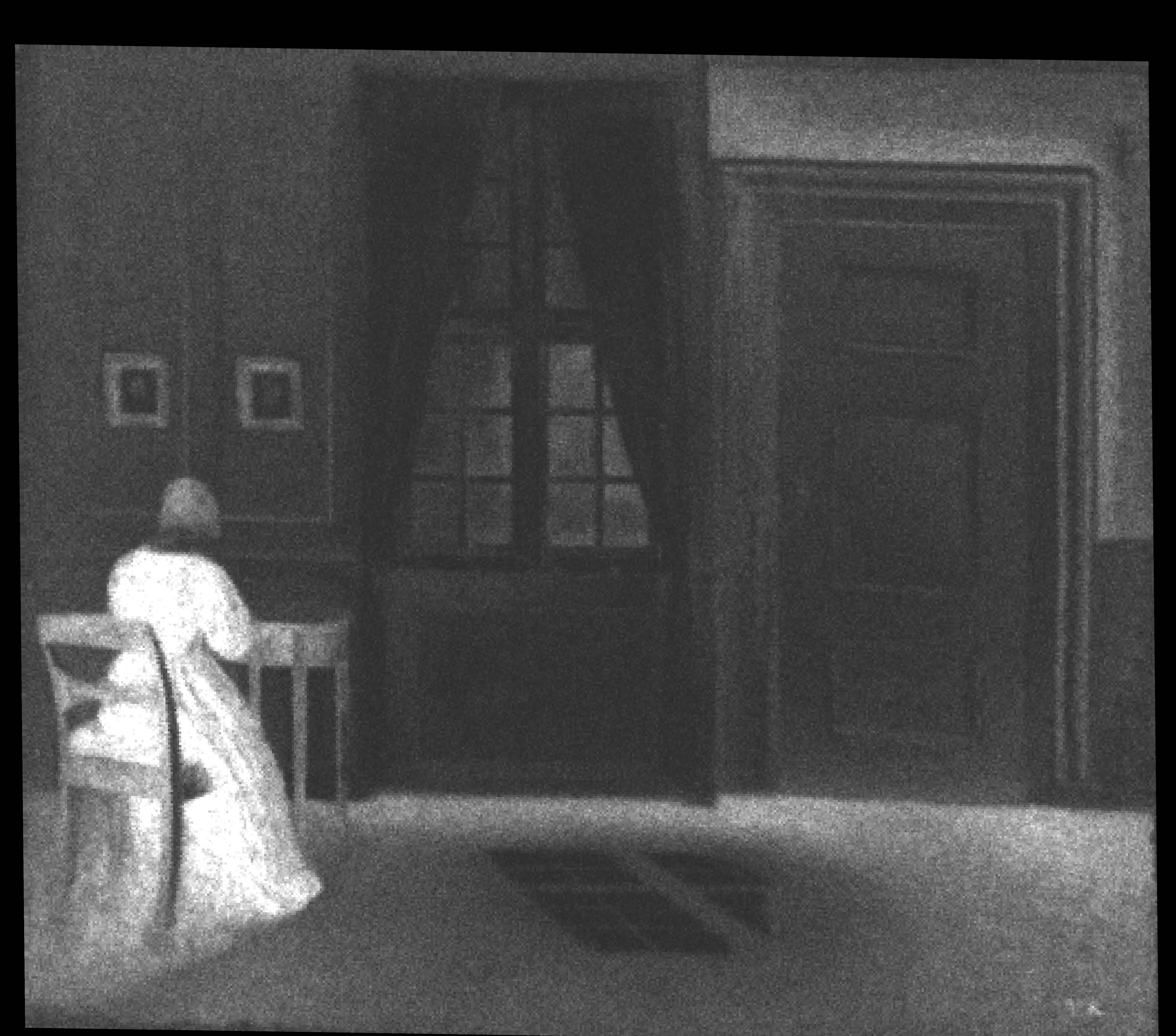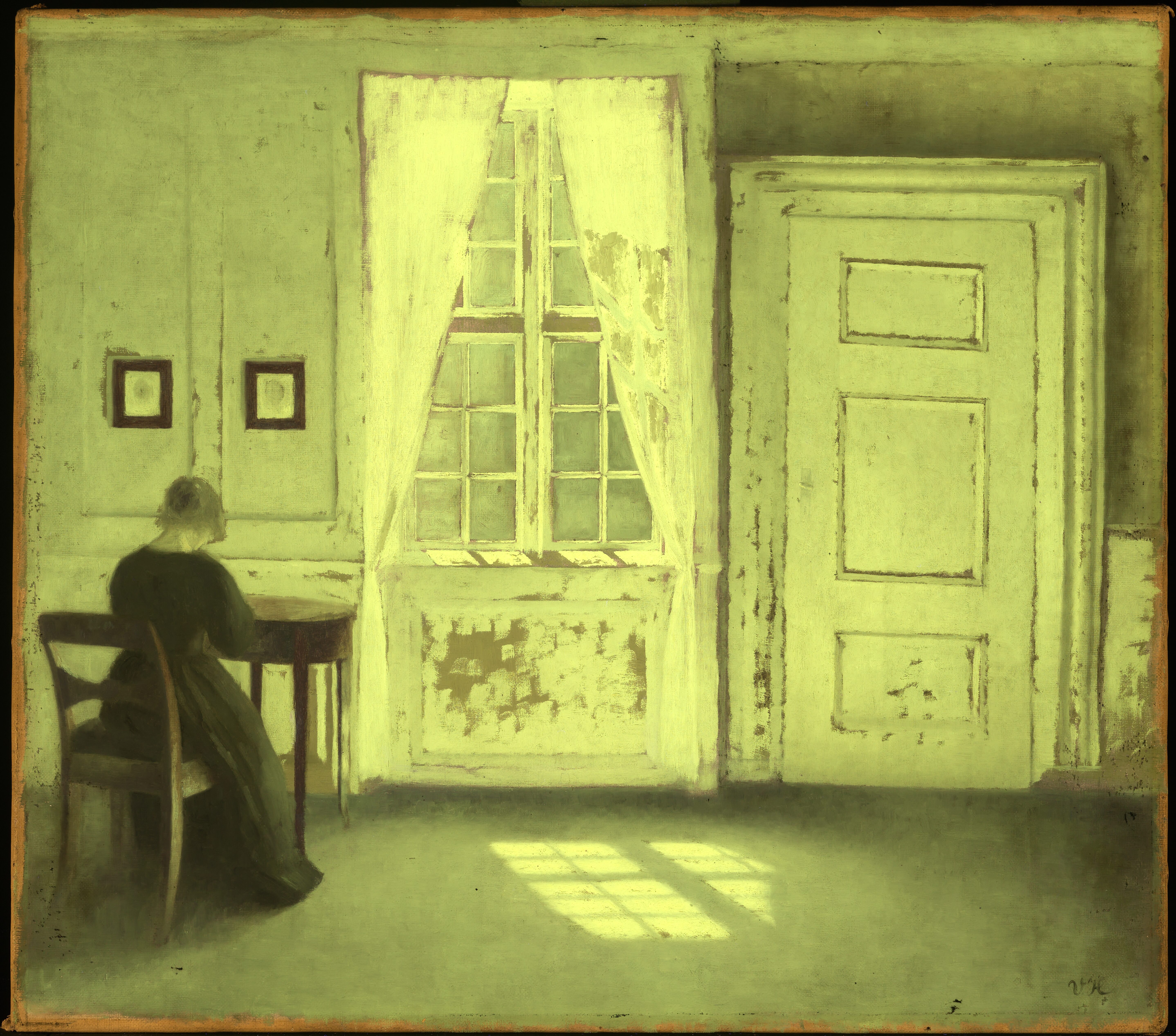 Paint layers are applied over the ground layer and are composed of pigments or colorants mixed with a binding medium. Throughout history, artists have used various binders. In the Middle Ages, egg yolk was commonly used in tempera painting for altar pieces, while during the Renaissance, oil became the preferred medium. In modern times, synthetic binders such as those found in acrylic paints are also widely used. In Hammershøi’s time, artists painted mainly with oil paint. The paint layer forms the visible image of the artwork and is often built up in multiple layers to create effects of color, texture, depth, and transparency.