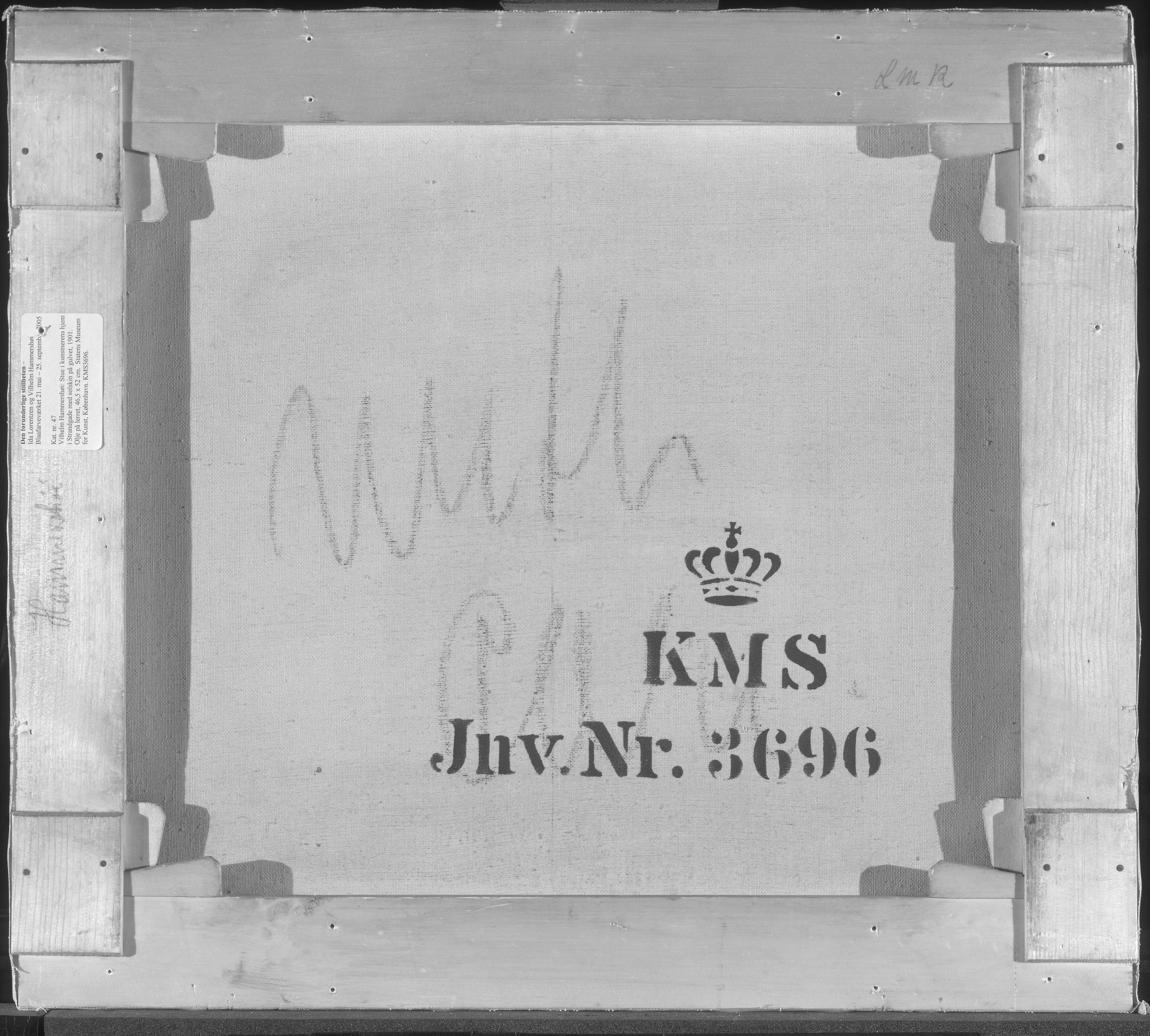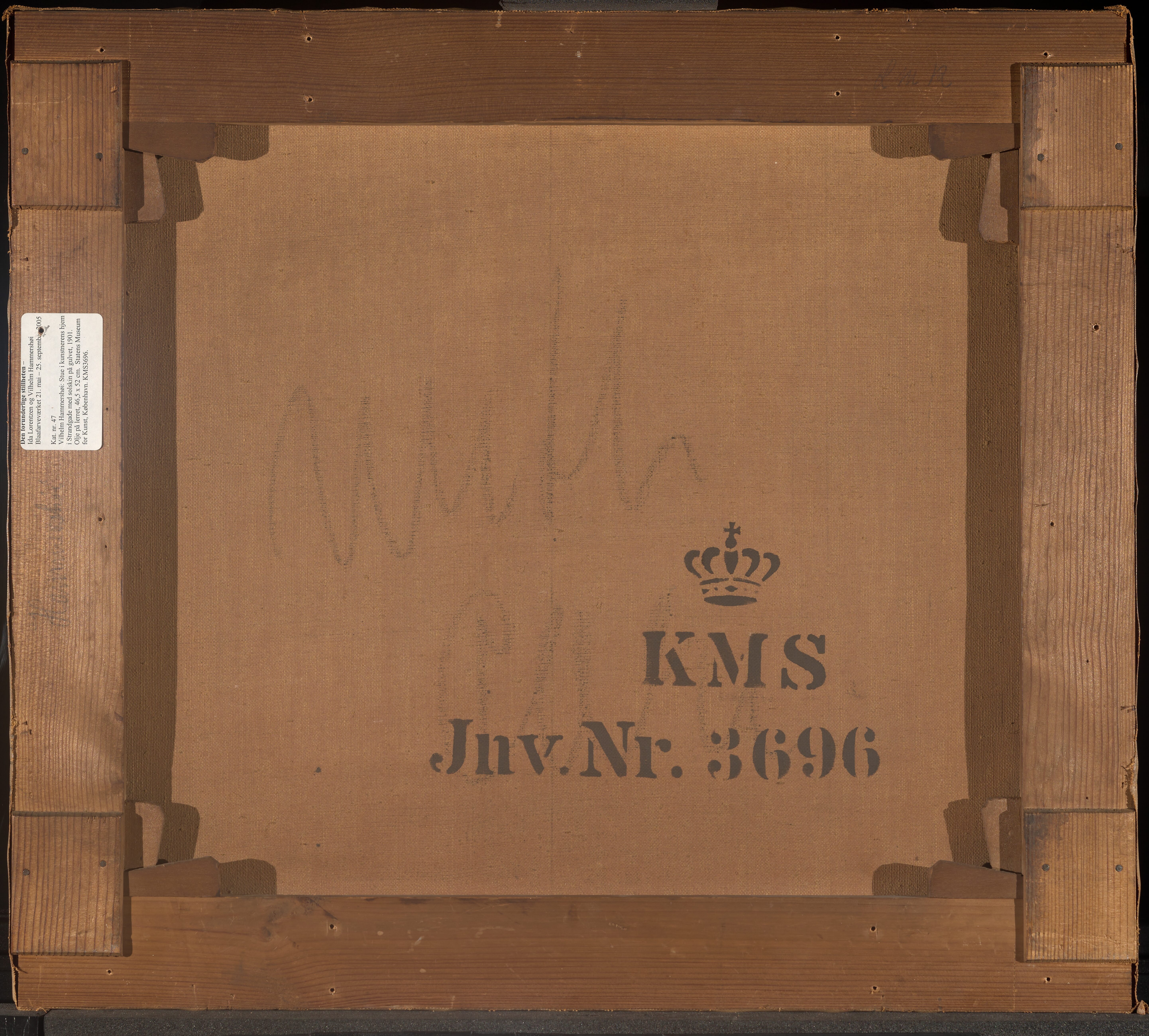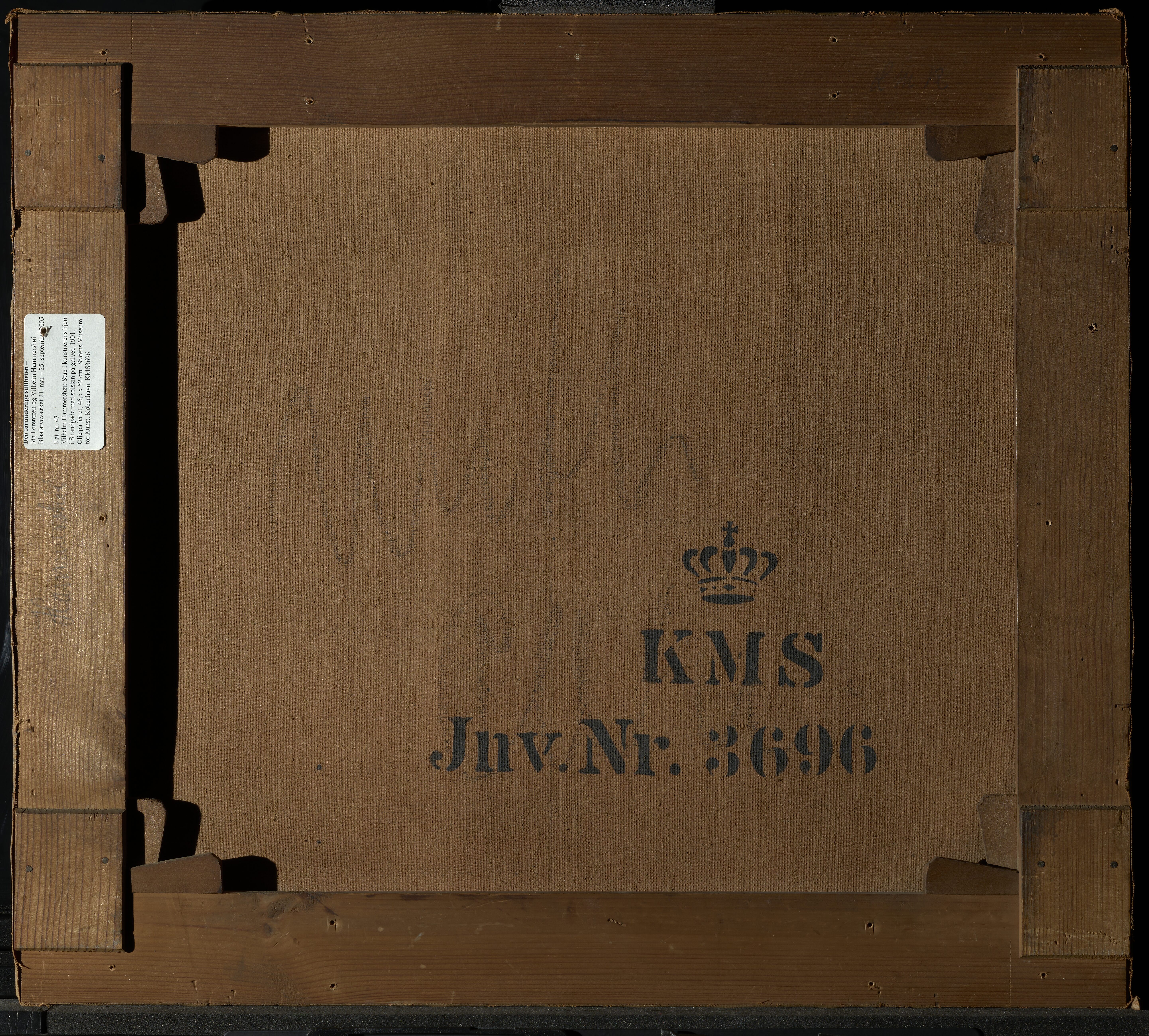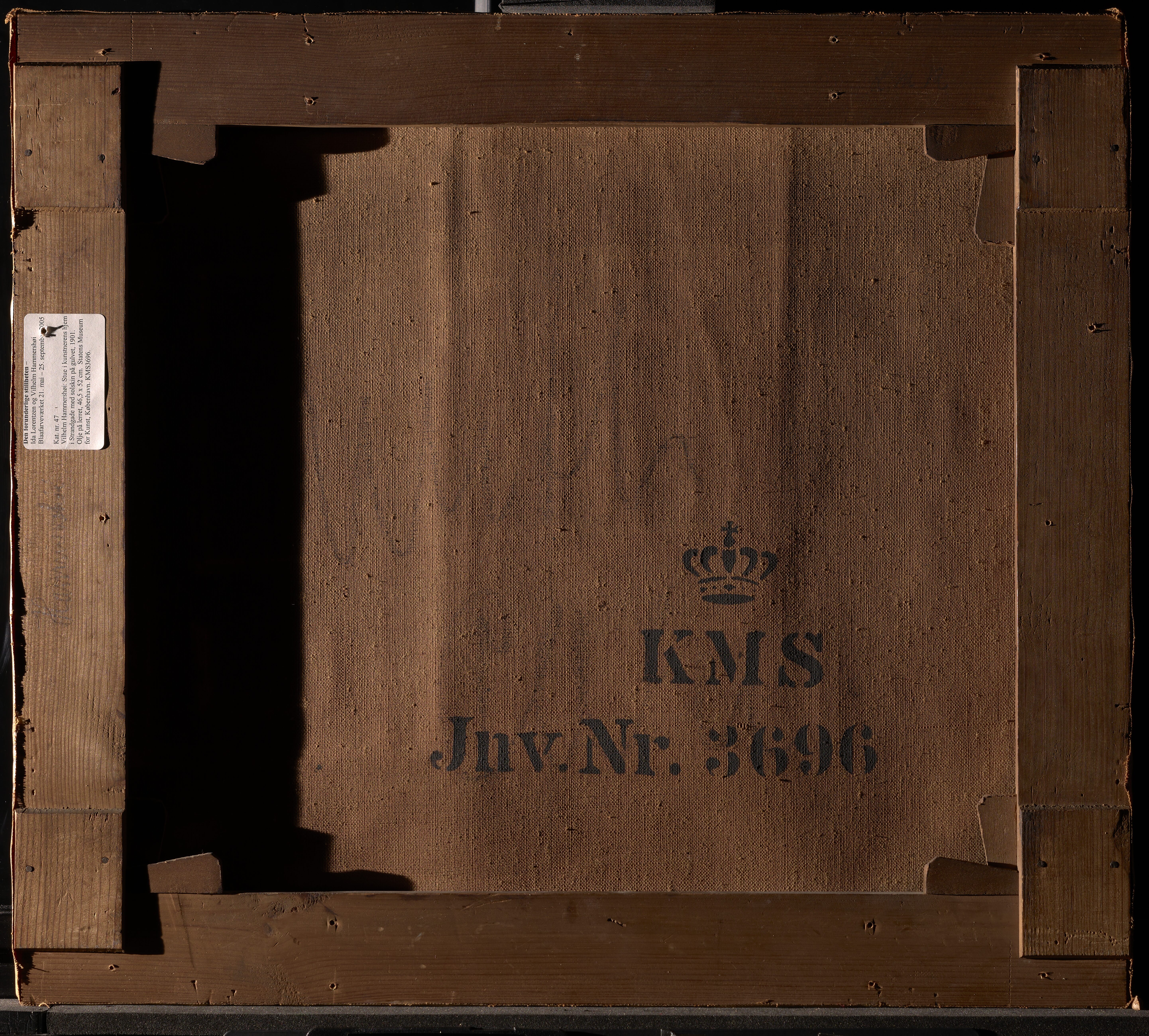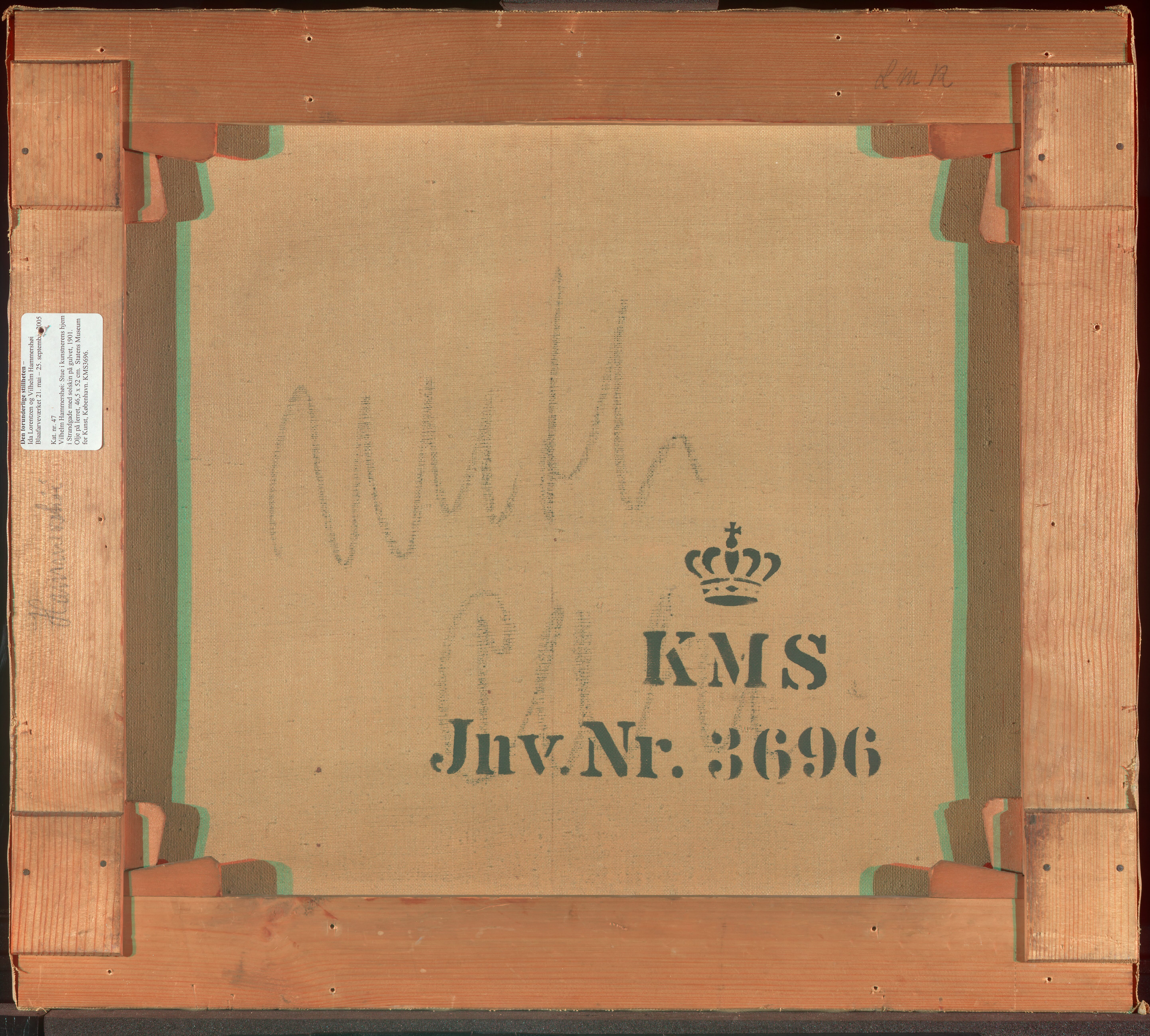 the stretcher was most likely made to measure. Inscriptions in pencil on the left-hand bar, viewed from the back: 'Hammershøi'. In pencil on the top bar: 'L m R'.