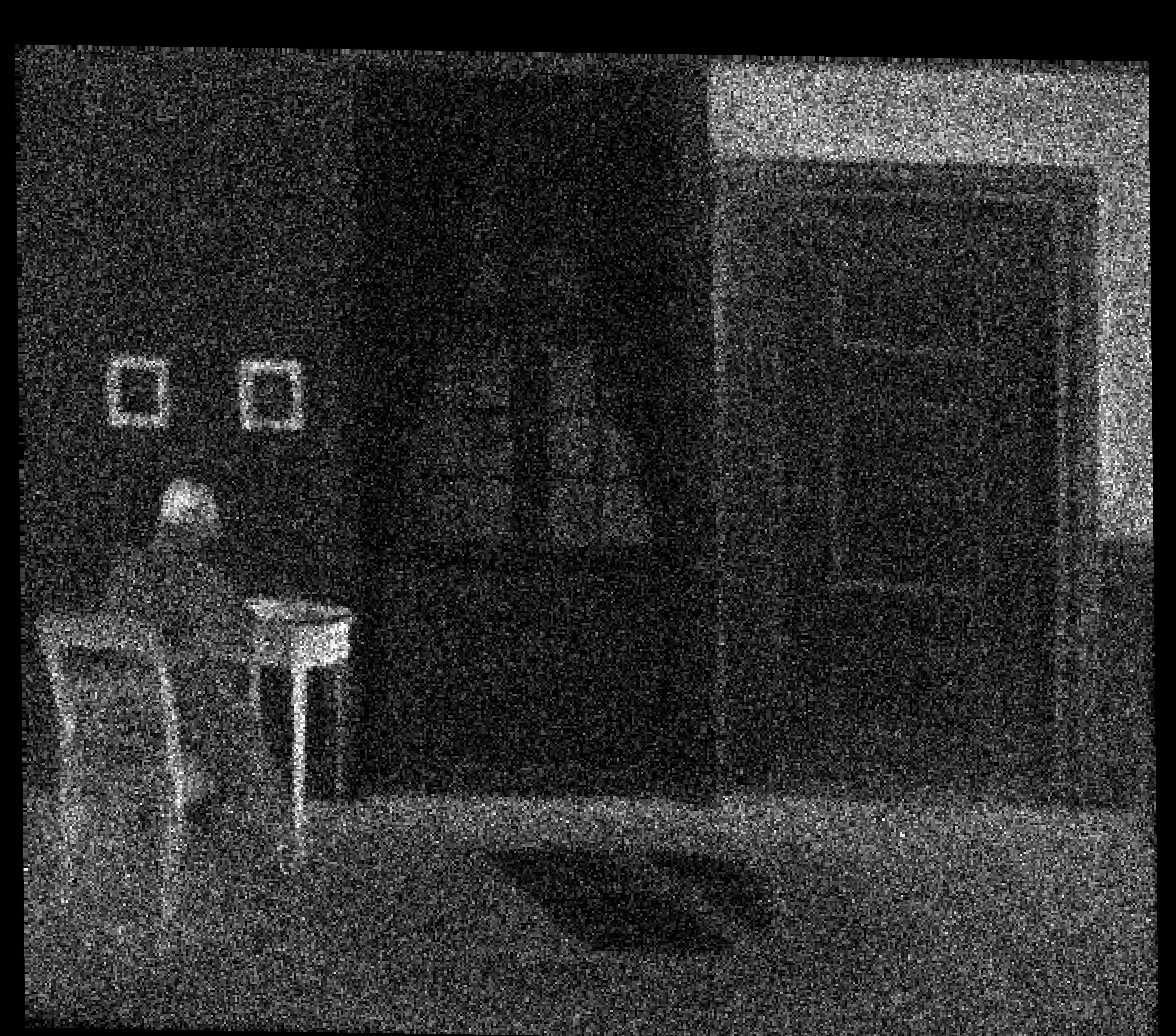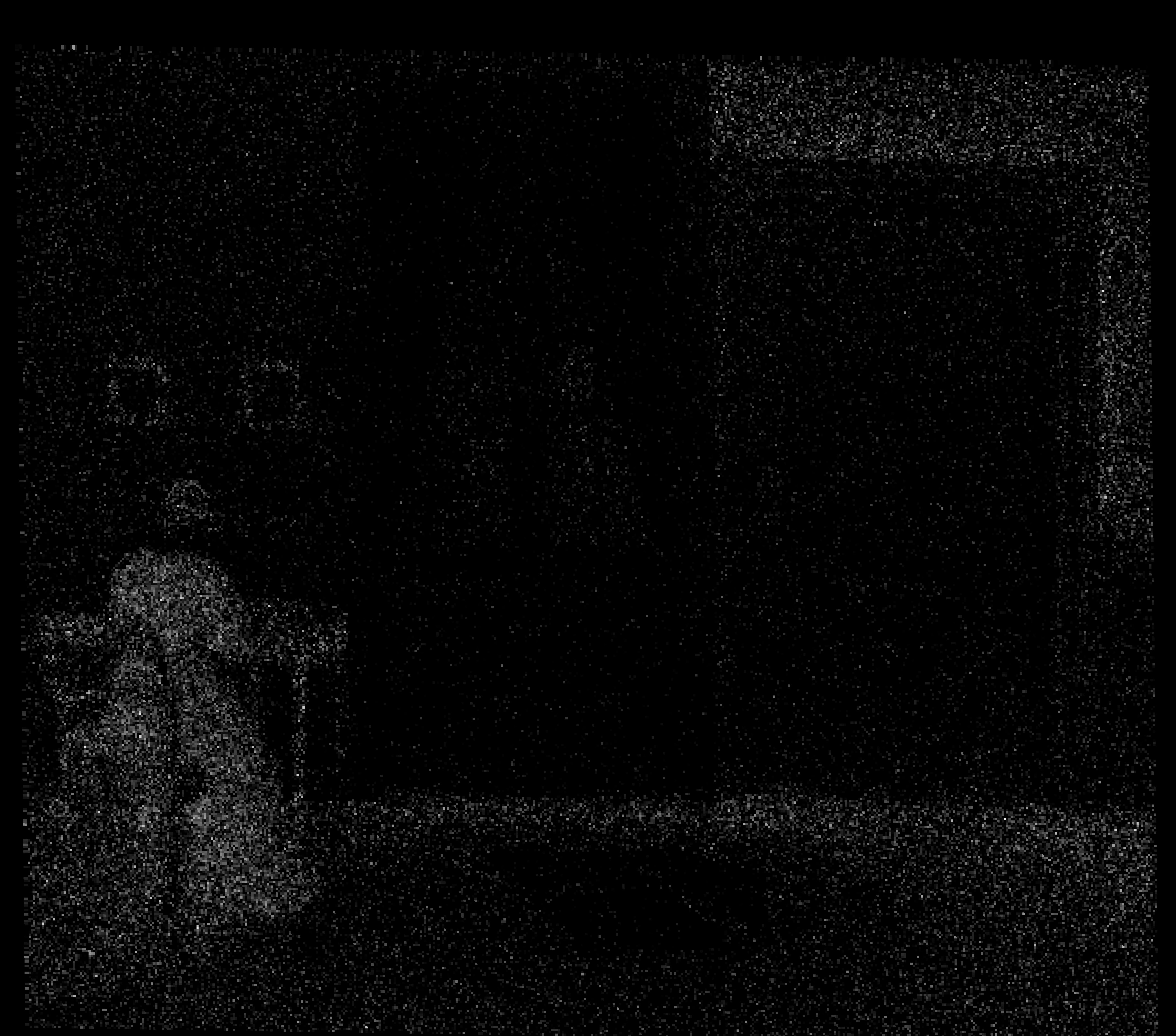 A greenish brown layer appears along the bottom edge under the purplish grey of the floor. A warm grey layer is found under the grey and white paint of the wall, the door and the window sections.