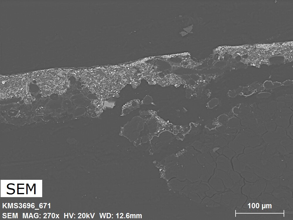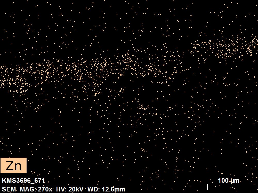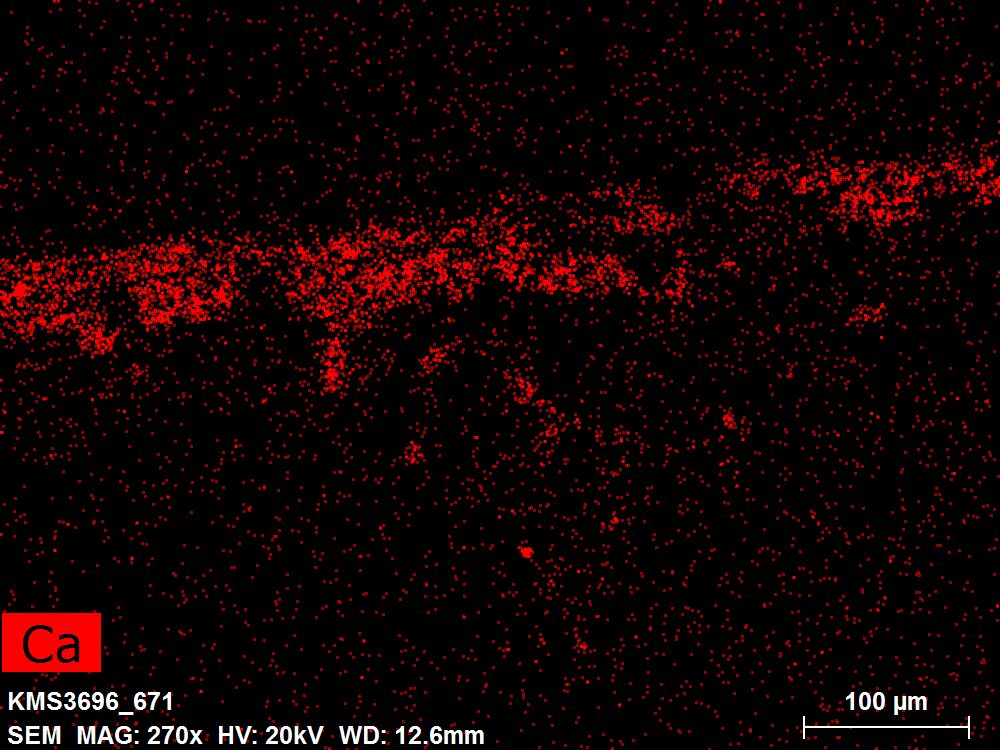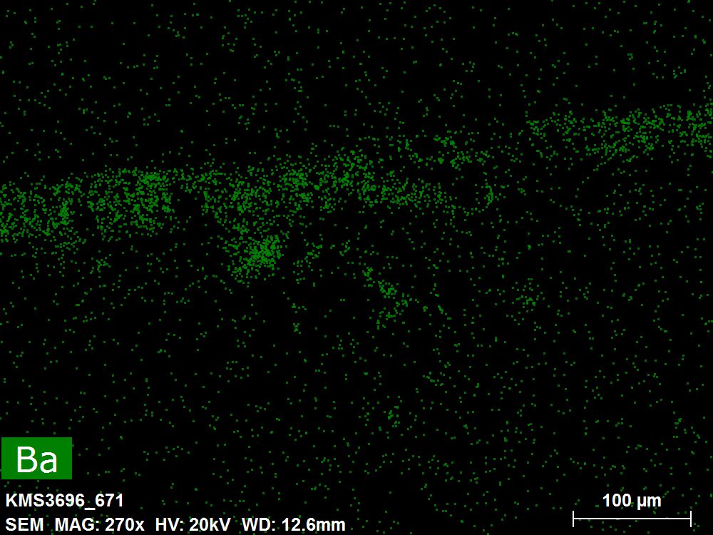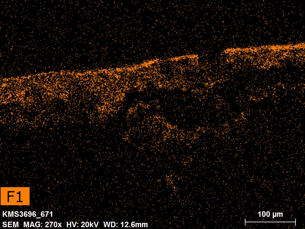 SEM-EDXS is a technique that provides highly detailed images at the microscopic level while simultaneously identifying the elemental composition of a sample. It is particularly valuable for studying the stratigraphy of paint cross sections at very fine scales, for the chemical characterisation of pigments, fillers and degradation products, and for detecting trace elements that may indicate very specific materials. Below, the elements listed in parentheses refer to minor elements whose relative abundance is below 10% of the total signal. The F1 map below represents the Pb M line. Read more under SEM-EDXS in the glossary.