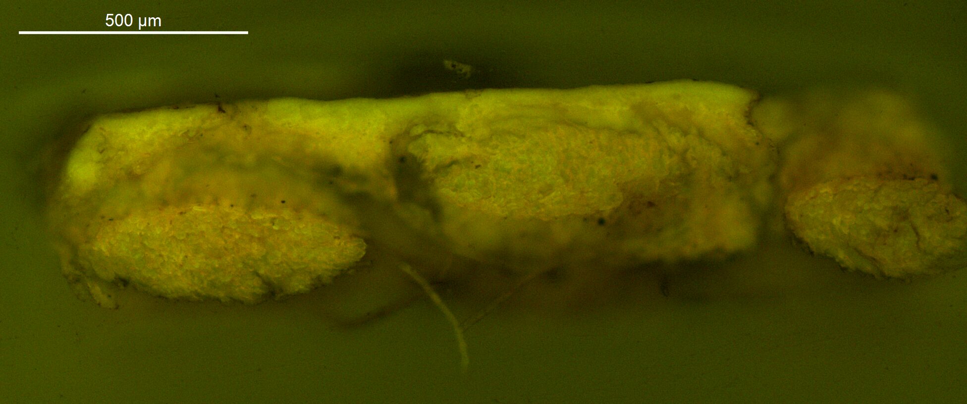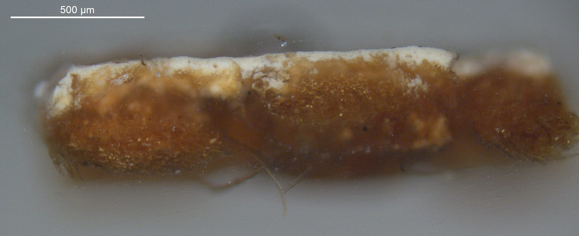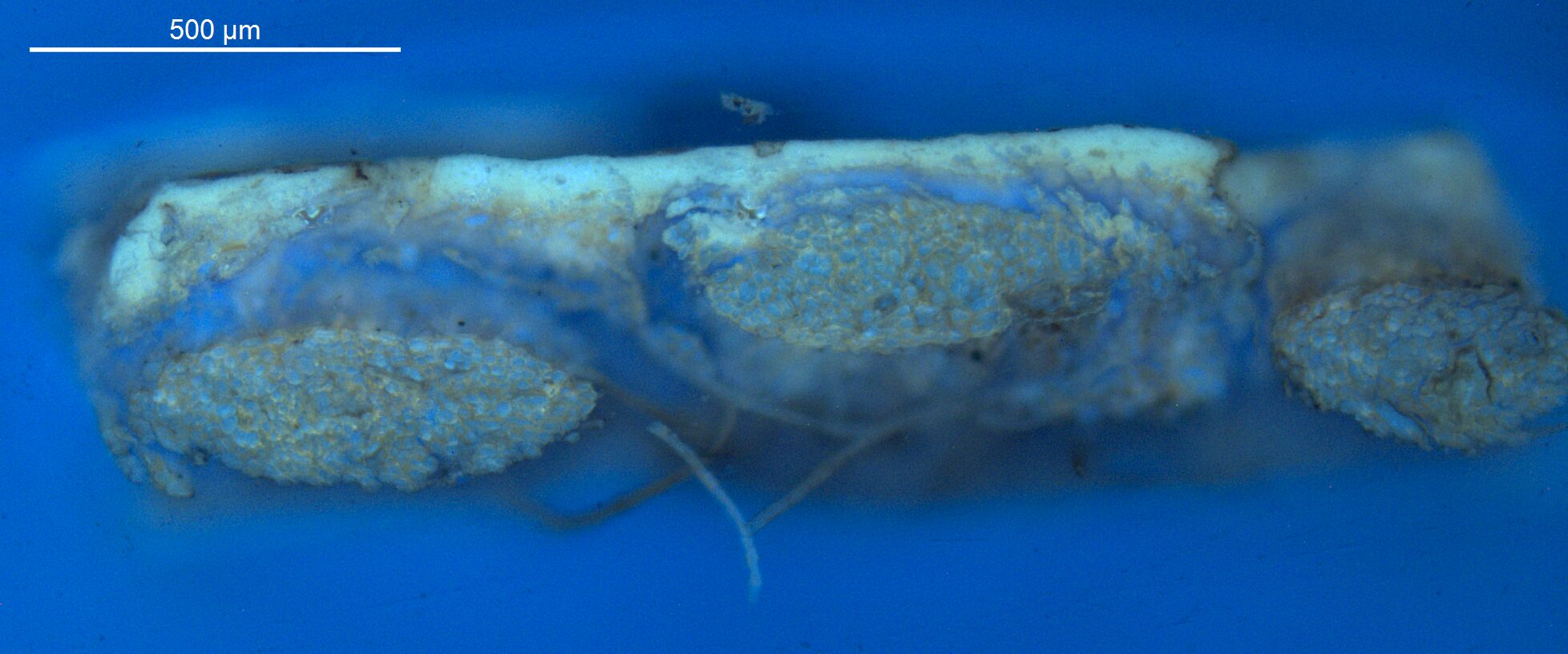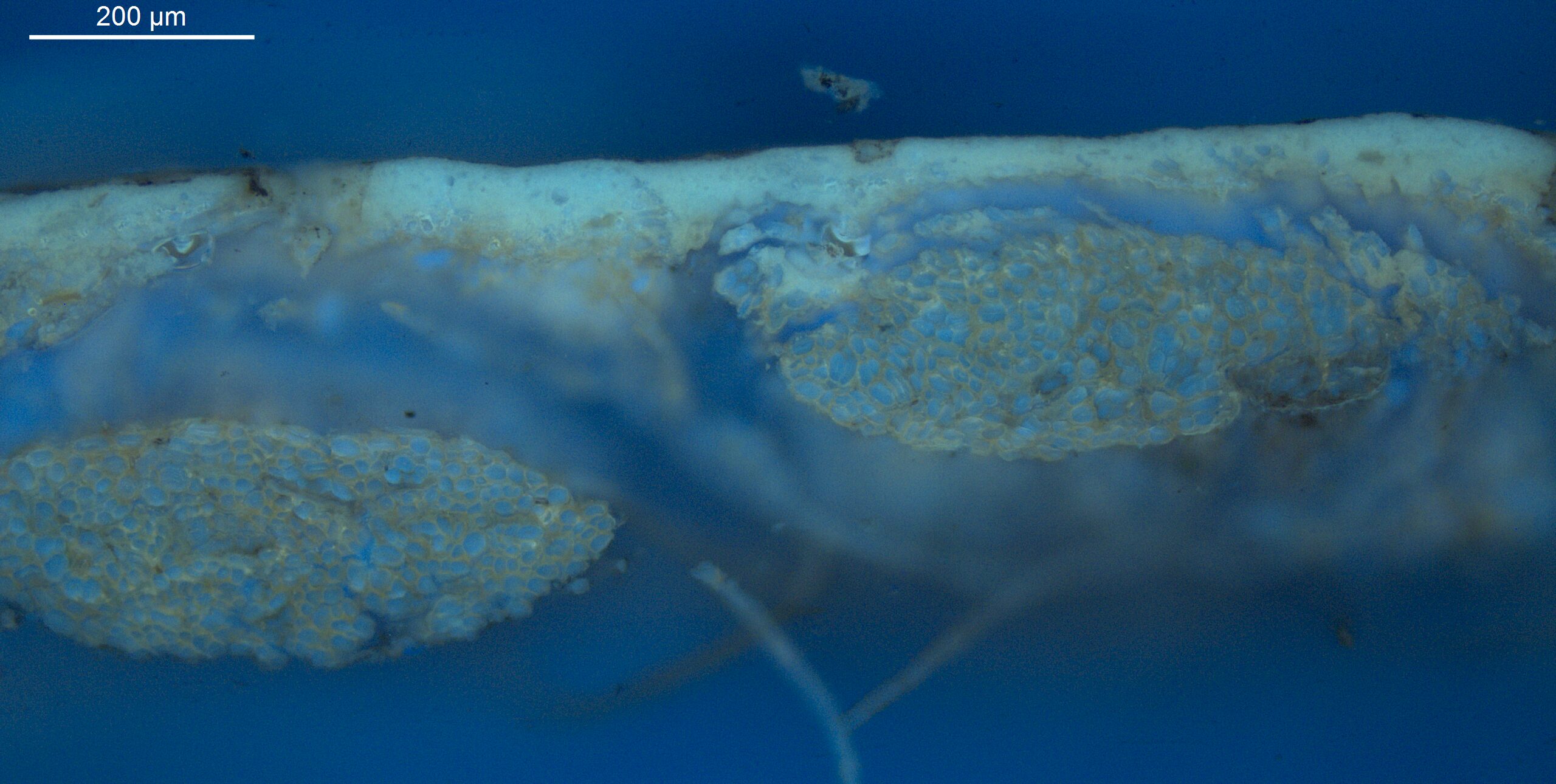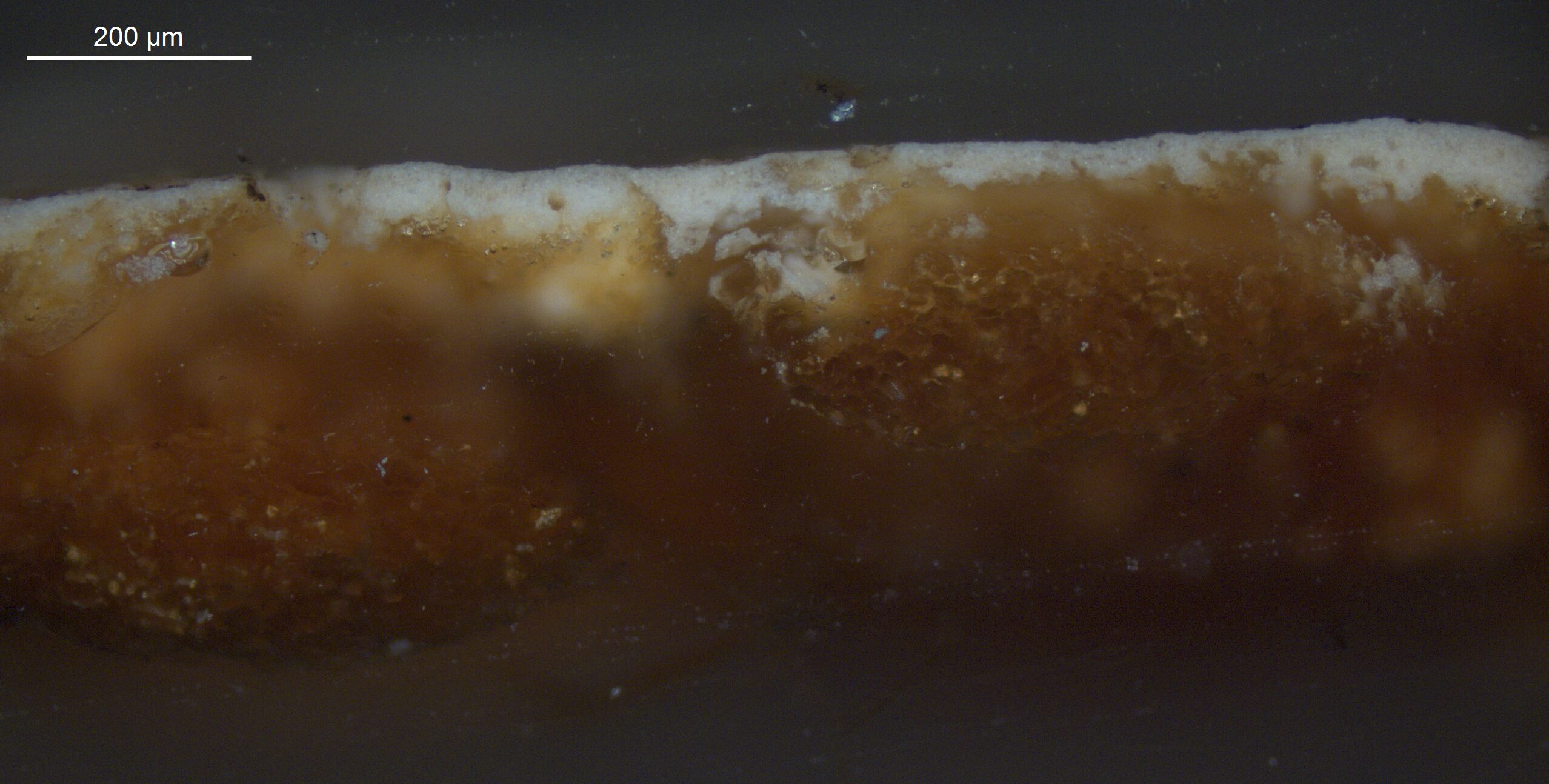 Optical microscopy uses visible light and lenses to magnify and examine the surface and structure of a painting. When applied to cross sections of paint samples, it allows for detailed observation of a painting’s stratigraphy (layer structure) and pigment particles. It is often employed with various illumination techniques, such as dark field and UV fluorescence, to enhance the analysis. Layer number 1 in the results section below the images refers to the layer at the bottom of the cross section.