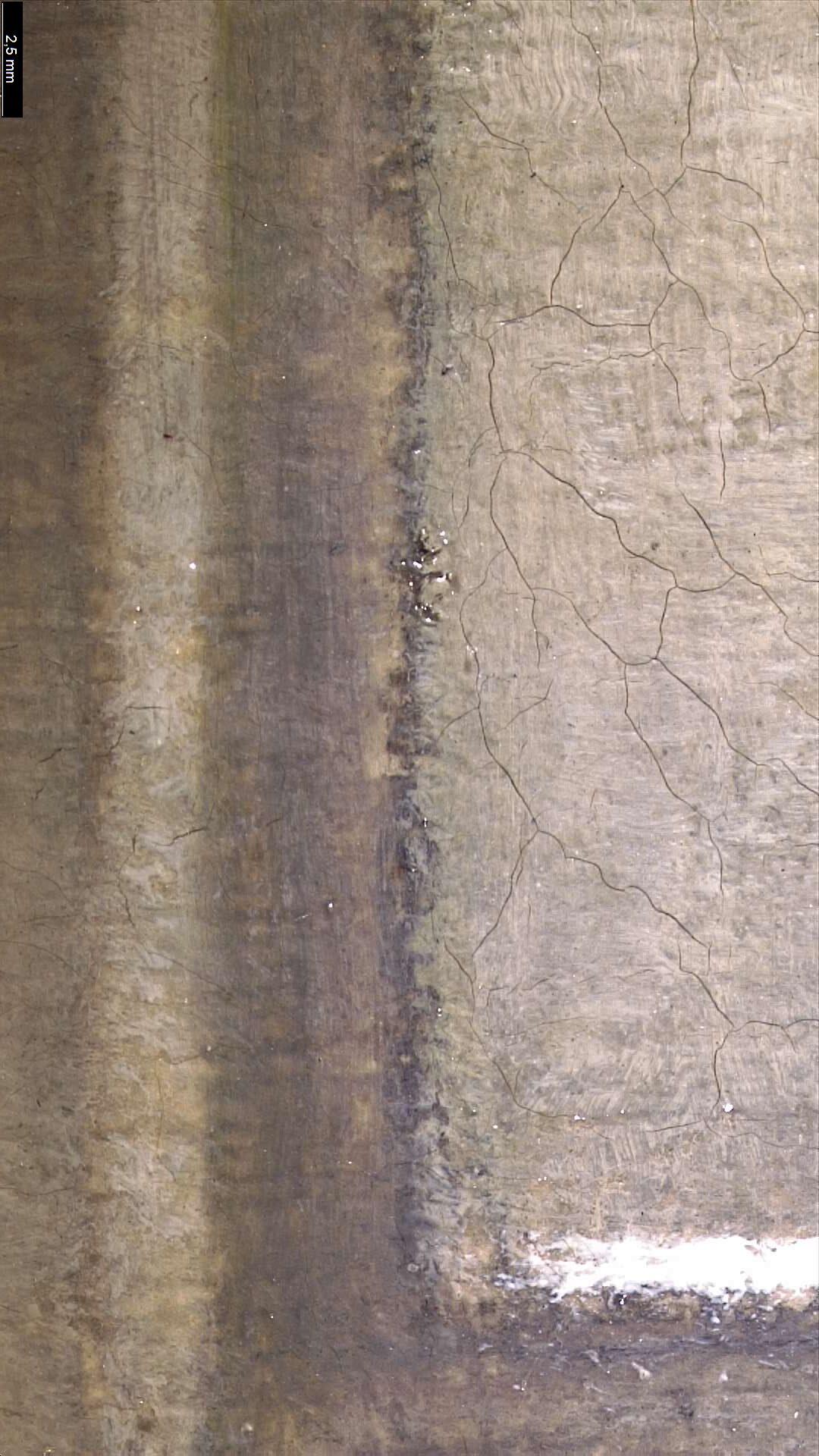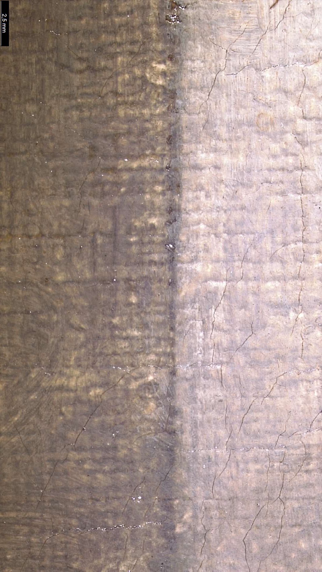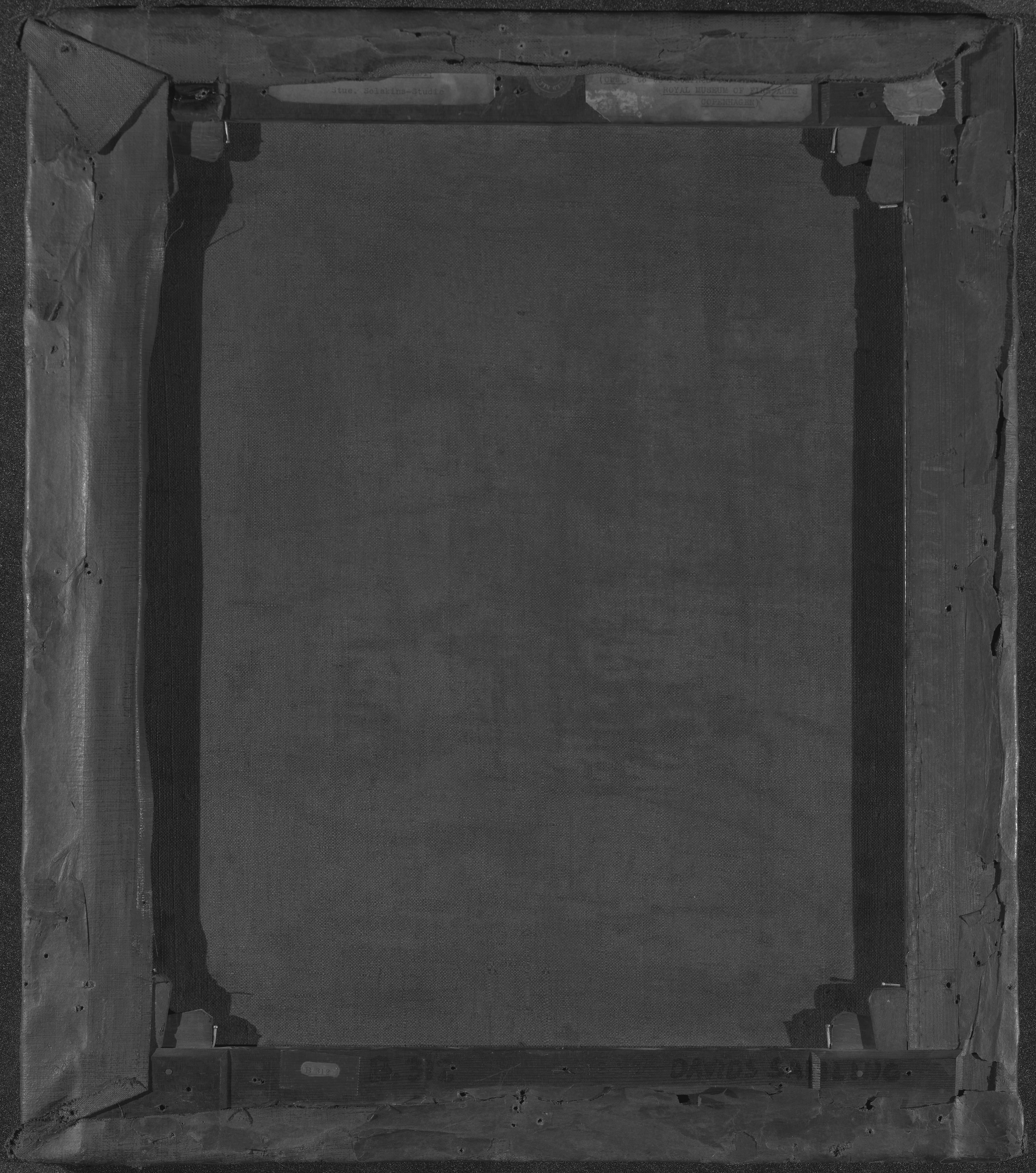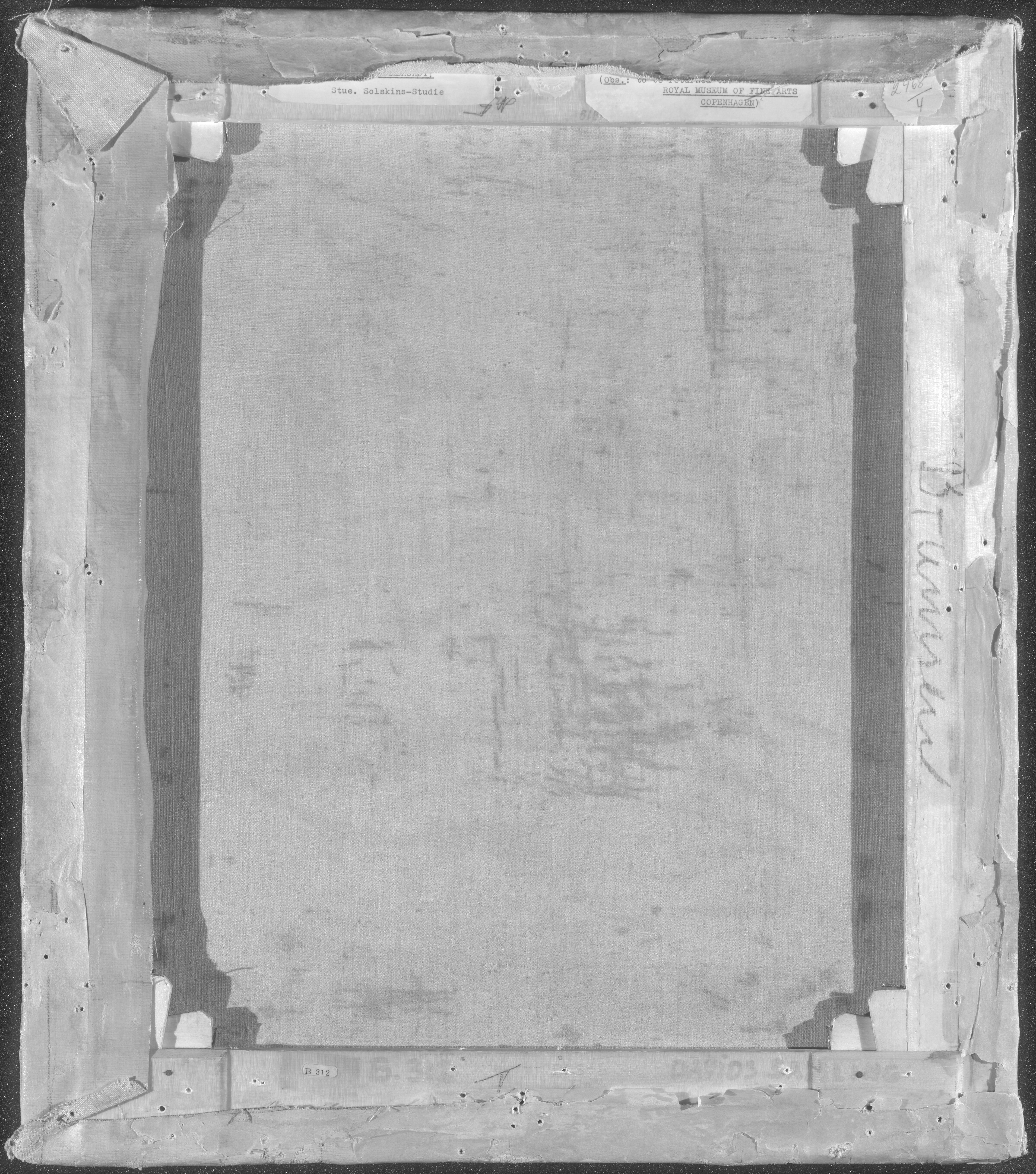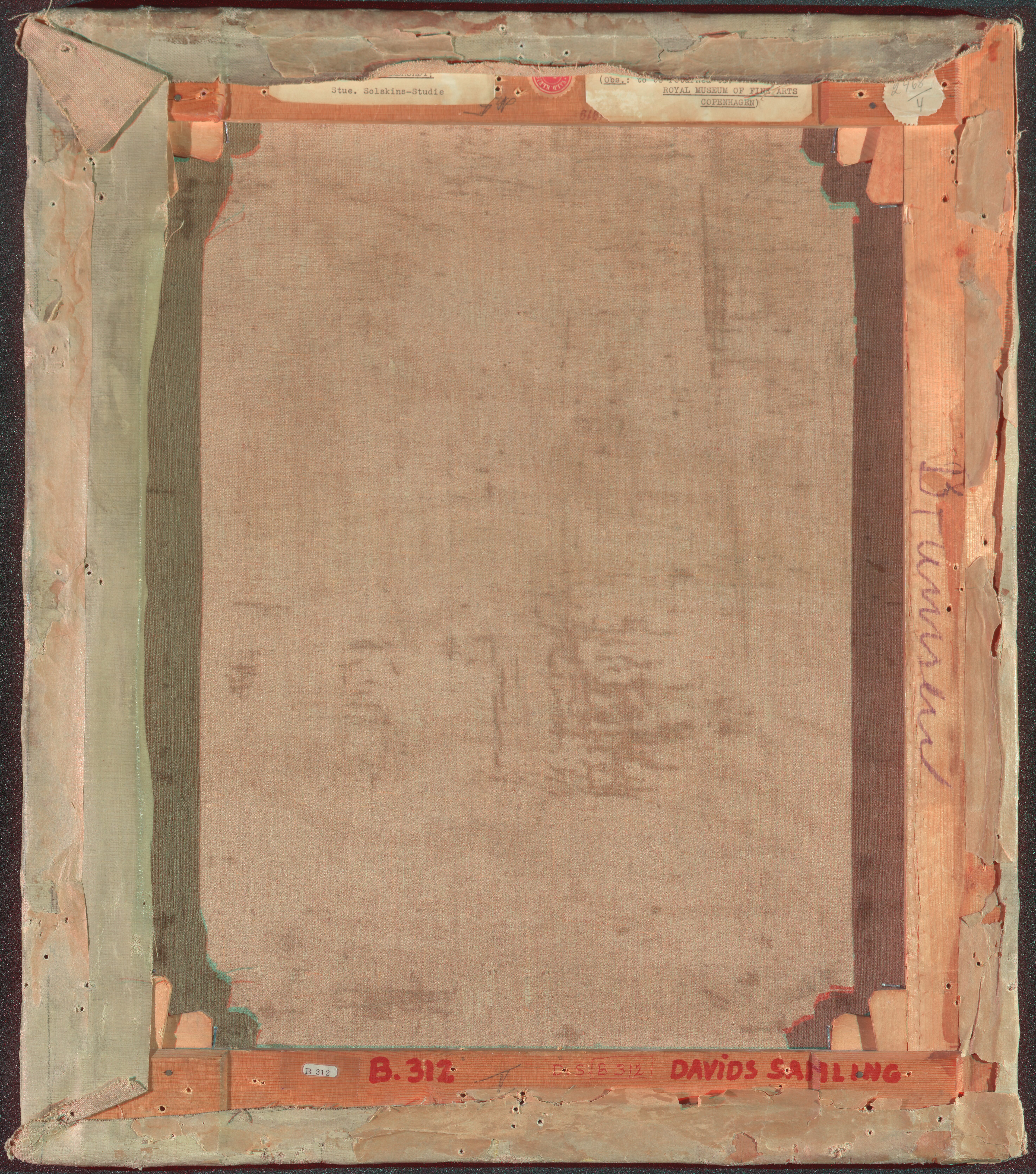Along the left-hand edge of the back wall and the floor are two vertical lines on the front, c. 10 mm apart. Likewise, on the opposite side, on the tacking edge folded onto the reverse, are two similar lines, c. 15 mm apart, perhaps tentative outlines in determining the extent of the composition. Along the bottom tacking edge, following the border of the paint layer, are two horizonal lines, 3-4 mm apart.