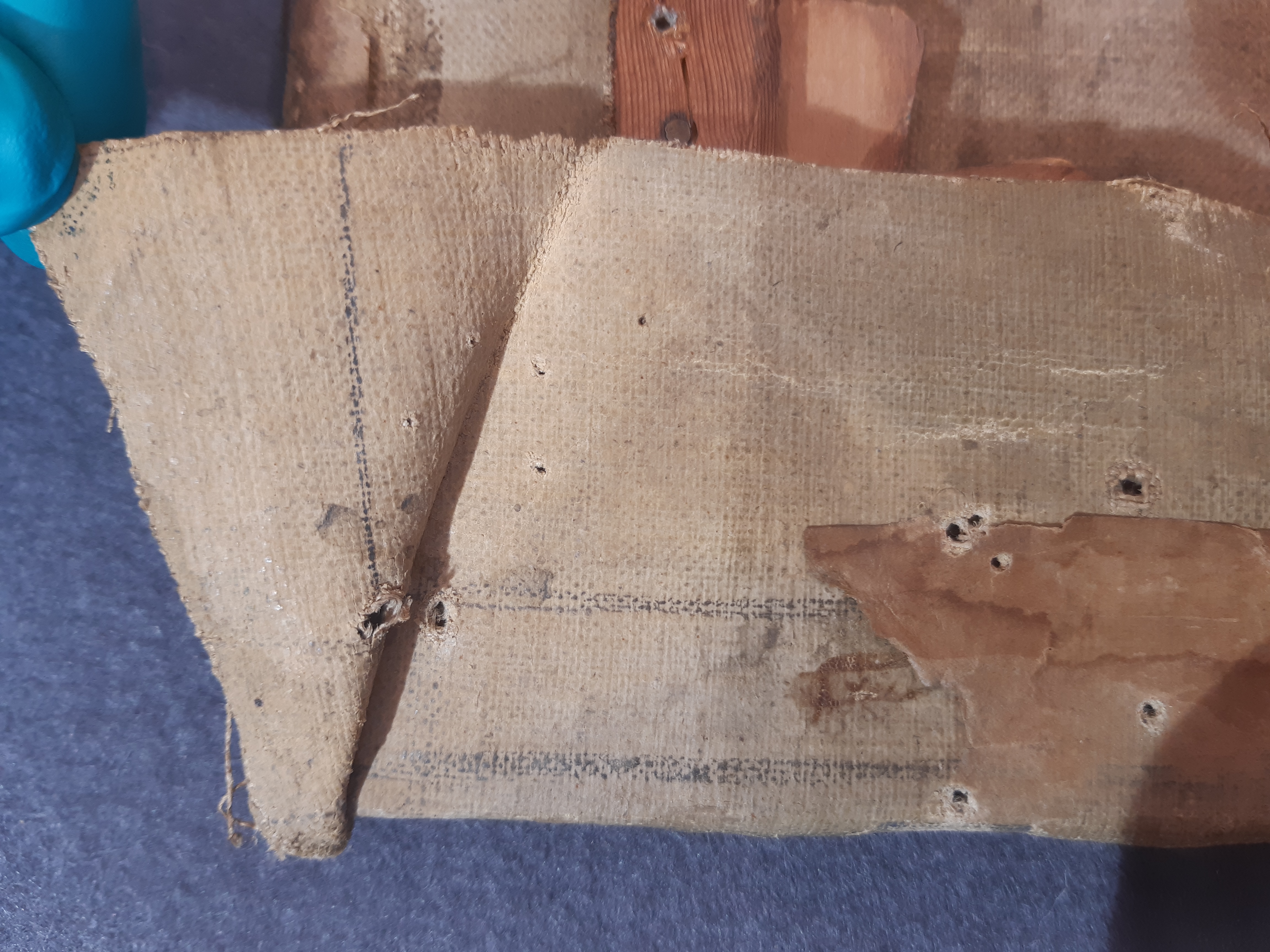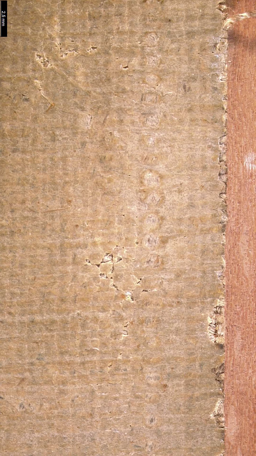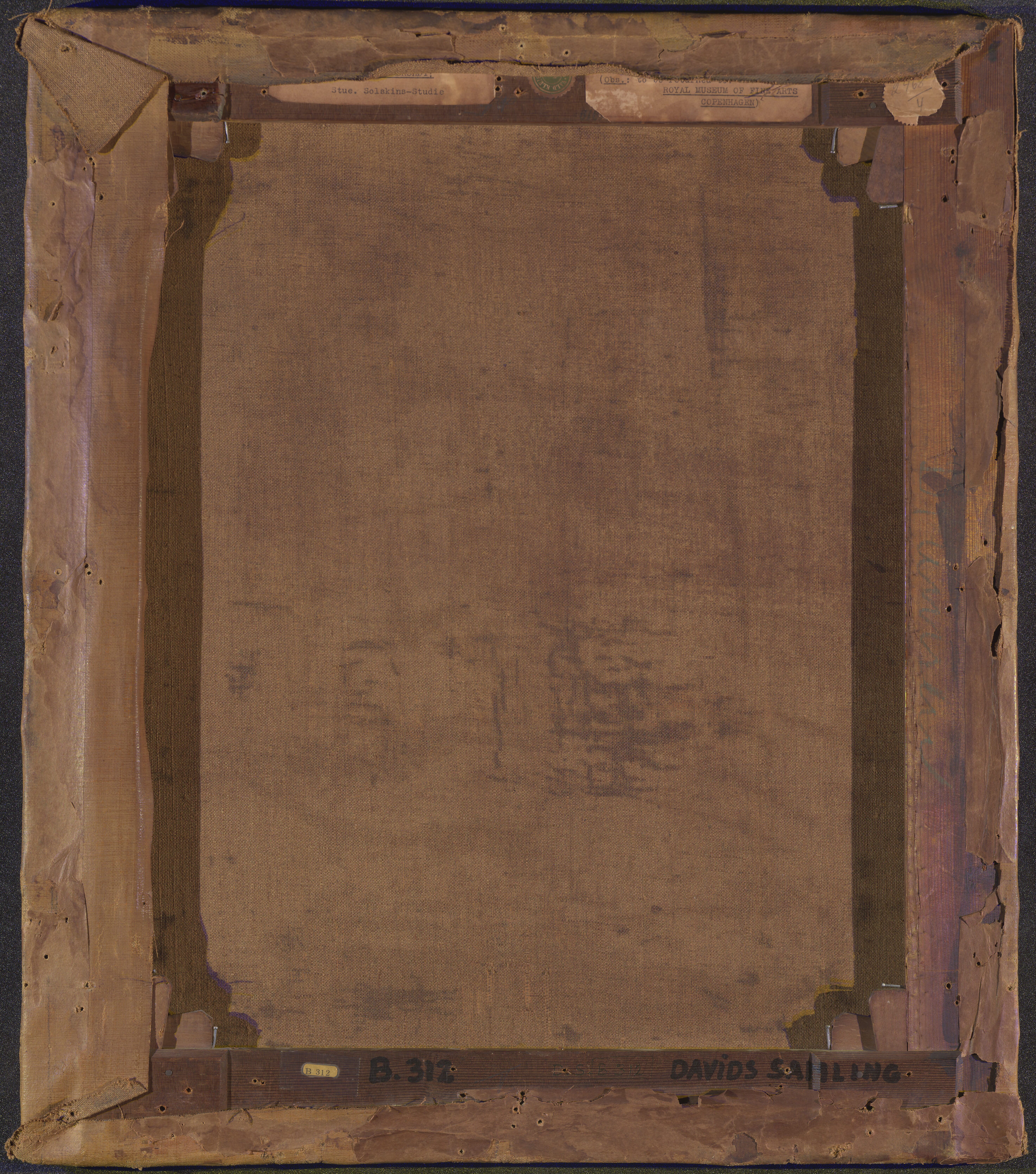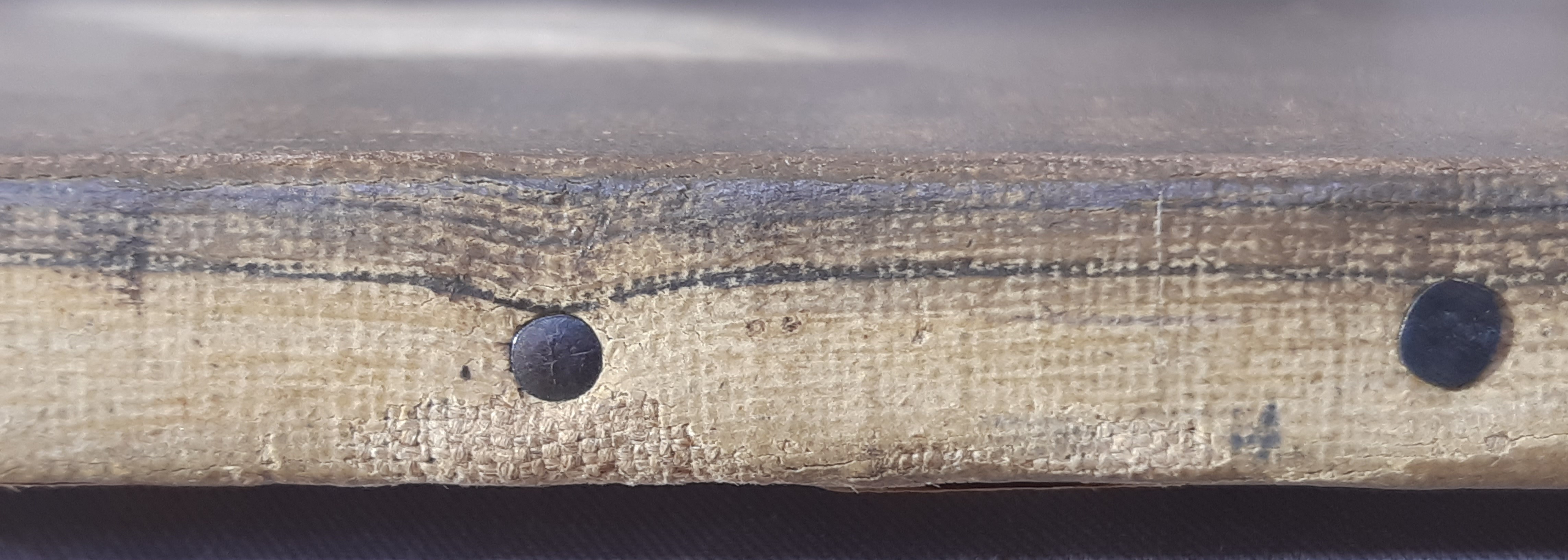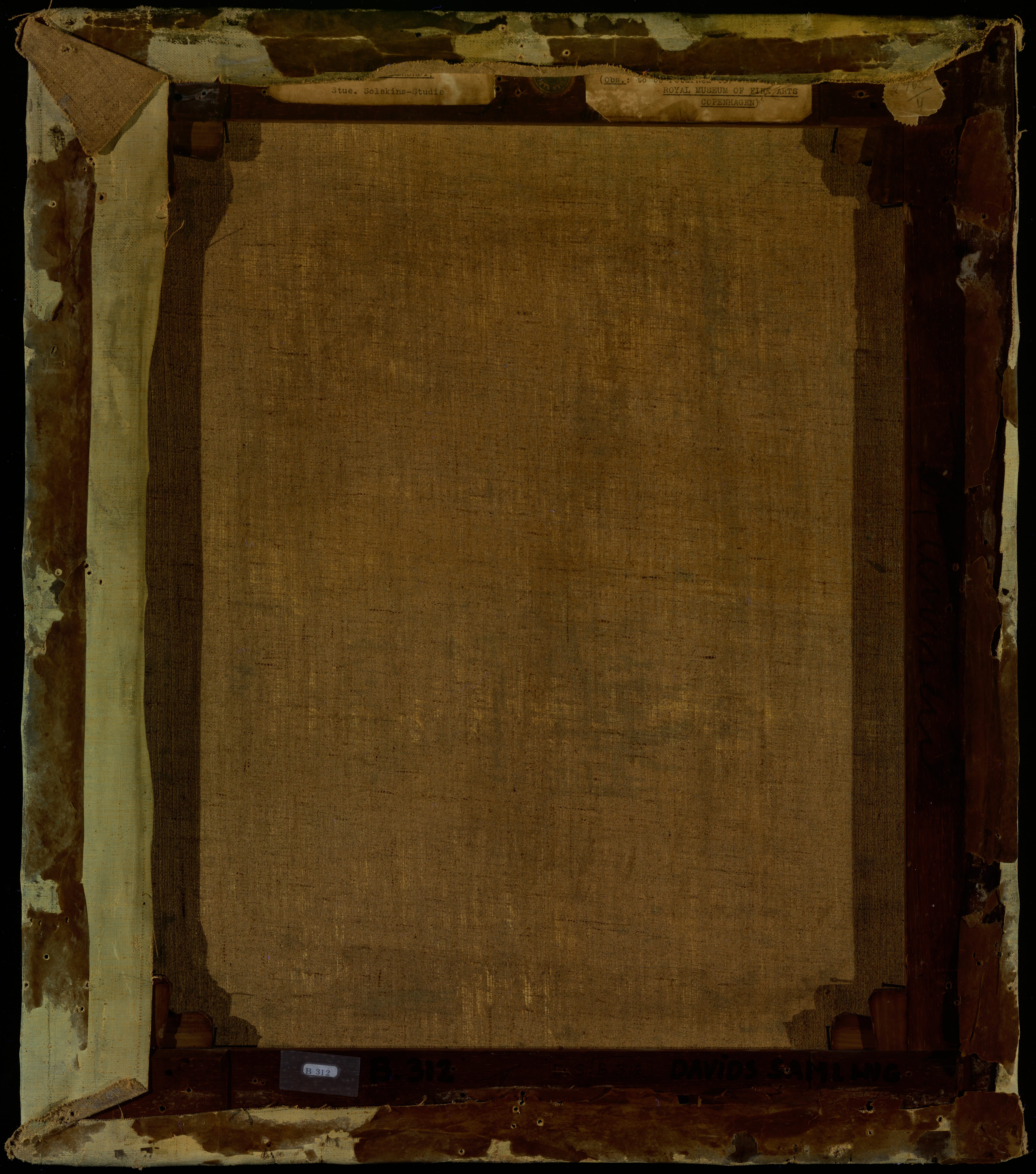 Along the left-hand edge of the back wall and the floor are two vertical lines on the front, c. 10 mm apart. Likewise, on the opposite side, on the tacking edge folded onto the reverse, are two similar lines, c. 15 mm apart, perhaps tentative outlines in determining the extent of the composition. Along the bottom tacking edge, following the border of the paint layer, are two horizonal lines, 3-4 mm apart.