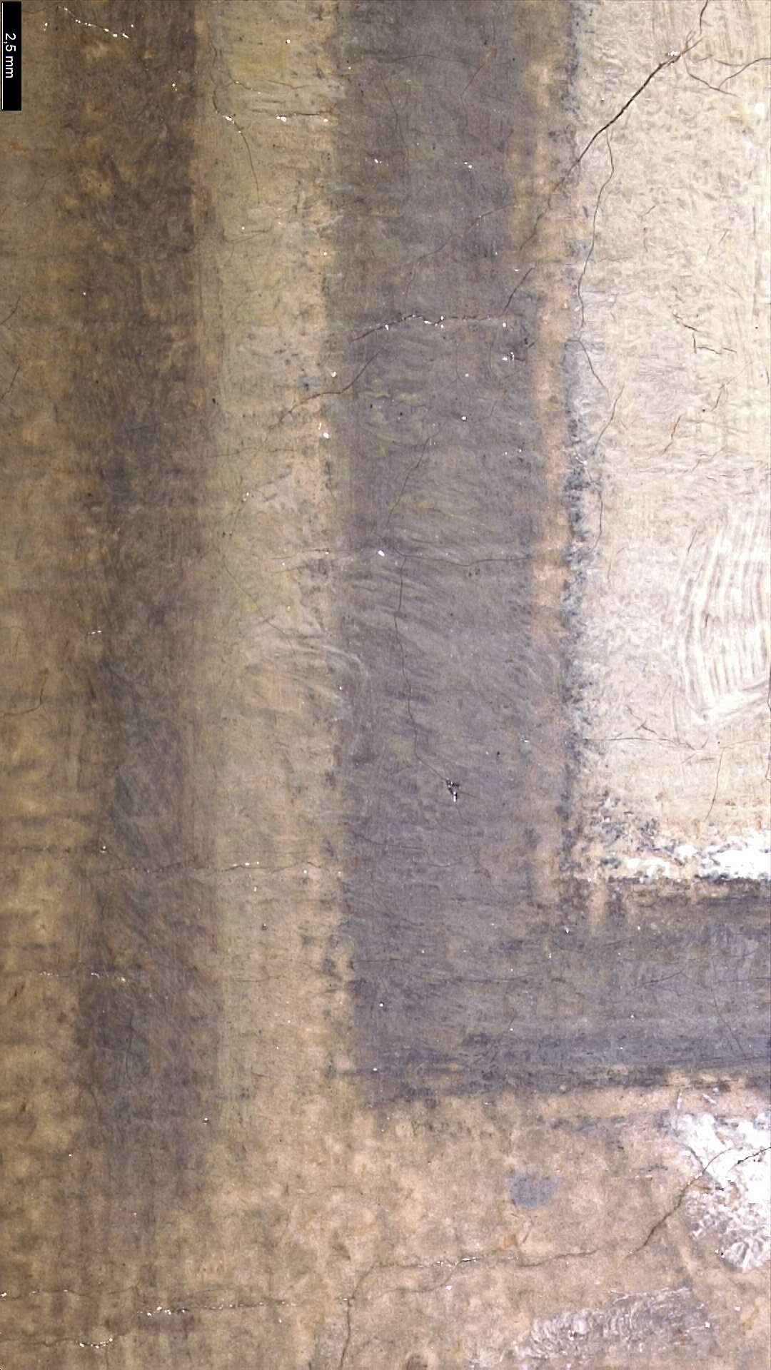 The underdrawing is a preliminary sketch applied directly onto the ground layer, serving as an outline for the composition or parts of it before the paint layers are added. These drawings are often not visible to the naked eye but can be revealed through infrared imaging (IRR and IR-R-IR) if carried out with a carbon-containing material on a light-coloured ground layer. The underdrawings can offer valuable insight into the artist’s creative process and planning, showing how the composition evolved prior to the final painting.