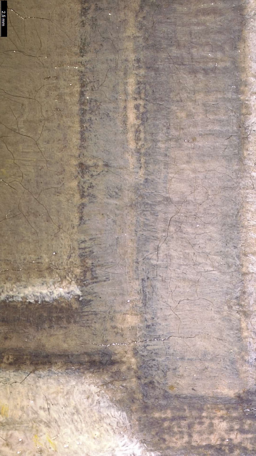 The ground layer is a preparatory layer applied directly to the support to create a smooth surface for painting. It is typically opaque and monochrome in color, providing a neutral base that influences the subsequent application of paint layers and the final appearance of the painting. The composition of the ground layer varies depending on the type of support and the historical period of the artwork. Hammershøi typically painted on white and industrially primed canvasses.