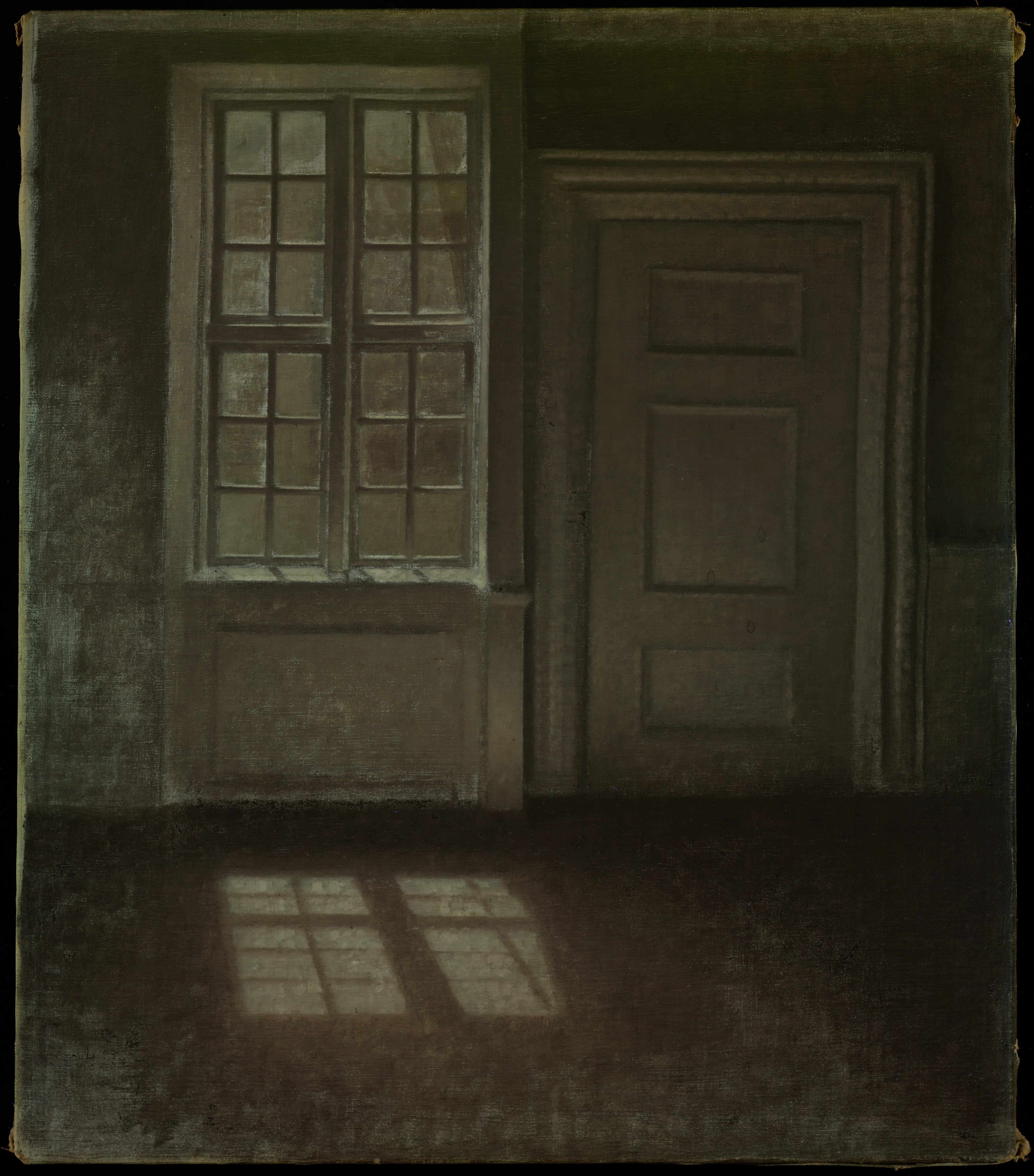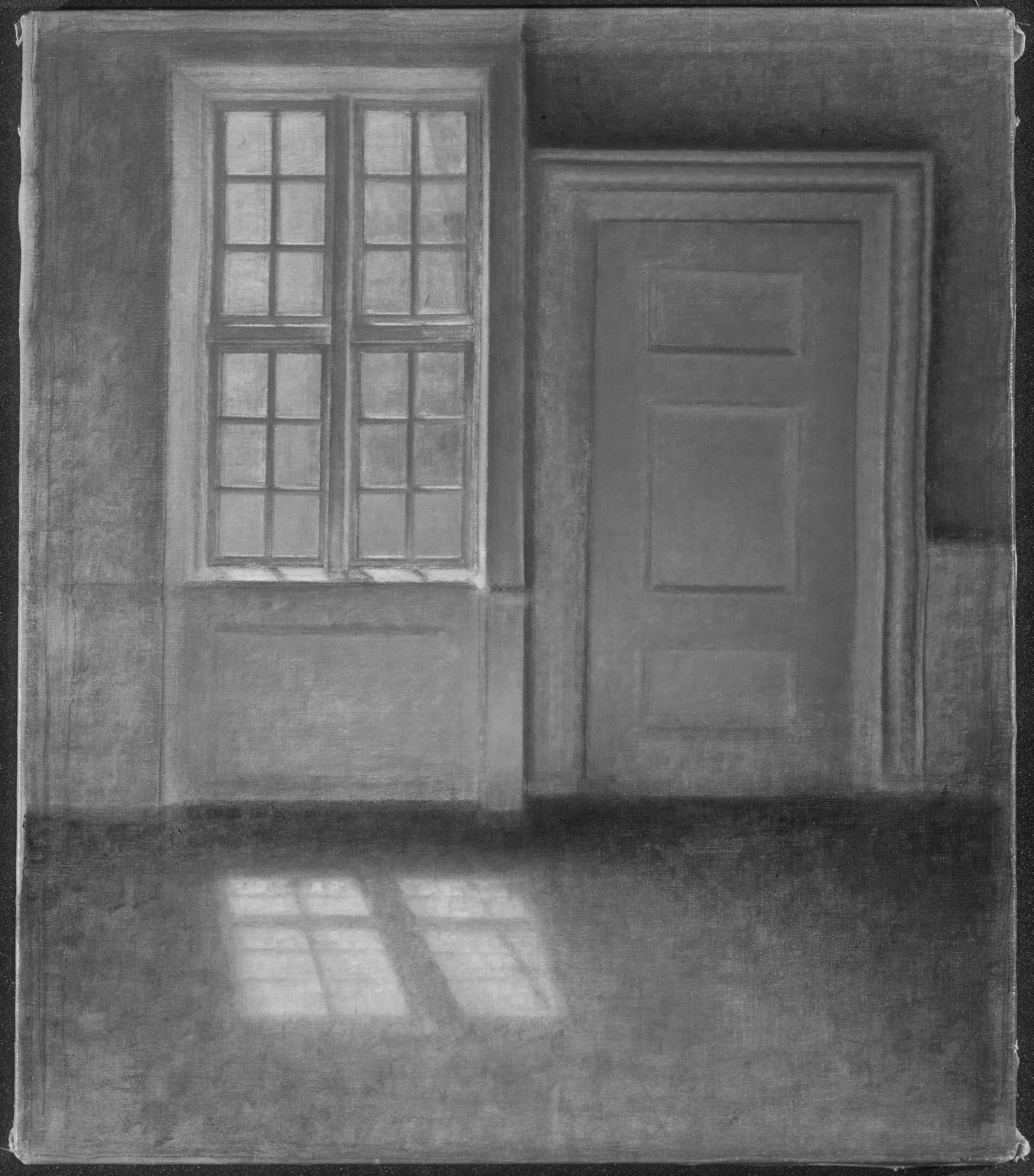 A varnish is sometimes applied as a final transparent layer over the dried paint layer to protect the artwork from dust, dirt, and mechanical damage. In addition to providing protection, varnish saturates the colours and evens out the surface gloss. Over time, this layer may yellow, or degrade. Until the 20th century, it was common practice to varnish oil paintings. In Hammershøi’s time, however, oil paintings were not always varnished, and we know that Hammershøi sometimes deliberately chose to leave his works unvarnished.